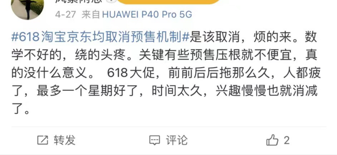 作者|成昱 来源| 惊蛰研究所 “听说,淘宝京东今年618都没预售了!”当同事跟小陈说起这个消息时,她只是“哦”了一下。对于“先天网购圣体”的她来说,在预售上吃过的亏,让她早早选择了对其视而不见。 “我去年买过一个按摩仪,预售价比正价便宜200元,一时冲动下单了,结果发现还要60天才能收到货。还没法退定,因为是‘定金’。”小陈对惊蛰研究所表示,“还有货不对板的,比如常规包装是一箱12盒的牛奶,结果收到货是10盒的,因为已经拆箱了没法退,只能怪自己下单时没看清。” 当消费者对预售不再感冒,电商平台在今年的“618大促”来临前,也不约而同地取消了这一促销机制。为何曾经对电商平台、品牌方和消费者都有利的预售,如今成了“弃儿”? 为何要做预售? 预售制其实不是什么新鲜玩法。在天猫2012年将它引入到电商大促前,它一直是房地产行业的主要销售模式之一,而房产预售的主要目的,是为房地产开发增加经营进项,从而降低开发商的资金使用成本。 所以,预售制本质上是一种提高经营效率的方法。而天猫将这种玩法引入到电商后,也带来了一个三赢的局面:品牌有了更多的“大定”订单,可以明确周期产量,避免库存积压,还能通过部分让利拉动更多的“大定”订单;消费者被这种新鲜玩法吸引,同时还能以更低价格购买新品,何乐而不为;天猫不仅通过预售提前拉动GMV增长,更将消费者捆绑在了自己平台上。如此一来,当双11正式开启消费者交尾款时,或许会在平台再次选购一波“现货”。 所以不难看出,电商预售制的诞生其实主要是三个原因。 一是为商家降低备货成本。对于品牌商家来说,预售是发布新品的最佳方式,一方面能测出新品的市场接受度,另一方面是能更好的对销量做出预估,降低生产成本和库存备货风险。而对于中小商家来说,提前预知销售,能更好的控制企业现金流,从而“活下去”。特别是对于服饰鞋帽类商家,预售制能帮助他们更好的控制大促期间的库存周转。 ![]() 二是满足了消费者追新的需求。对于消费者来说,618、双11不仅是“撒手购”的重要节点,更是猎奇追新好时候——因为这个时候,品牌商家发售的新品“会有折扣”。 三是帮助平台实现GMV增长的目标。电商平台中,淘天与京东的“对抗”一直存在:当淘天创造出双11大促后,京东也推出了618,拥有了自己的大促主场;当天猫引入了预售后,京东也推出了超级预售和定金膨胀。这背后,是双方在大促GMV数字上的较量。 所以,预售制相当于锁定了品牌商家的货,也锁定了消费者的钱包,谁能更早更快的吸引消费者到自己的平台“下定”,谁就相当于提前锁定了一部分GMV。而在前些年,淘宝和京东在大促期间仍然保持发布销售额数据的大促战报时,而其中很重要的一组数据就是6月1日和11月1日前的预售销售额。 预售为何被“抛弃”? 成也预售,败也预售。一件事,重复做久了,就一定会出现问题。这在电商领域尤为明显。十余年来,预售制的弊端也在三个方面逐渐体现出来。 首先是模式有漏洞,越来越多的商家开始“钻空子”。 2024年1月31日,中国消费者协会发布2023年全国消协组织受理投诉情况分析,其中第一条就明确提出,电商平台预售模式亟待规范。同时指出了电商平台预售模式存在的五大问题: 一是“尾款”涨价不诚信;二是预售商品不价保;三是承诺赠品不兑现;四是承诺时间不发货;五是“最低价”宣传不属实。 ![]() 中消协不仅建议消费者在选择购买预售商品时,要仔细阅读了解经营者相关预售规则,特别是各类限制性条款,同时着重要求电商平台应强化平台主体责任,明确预售模式下平台或商家的信息披露义务、交付保障措施、退换货规则等。 能让中消协如此重视,主要还是因为近年来电商预售的消费投诉不断增加。特别是一些品牌商家在大促期间的预售“猫腻多”,更有的品牌直接被中消协“点名”。 2021年双11期间,中消协网站发布《2021“双11”消费维权舆情分析报告》。报告中称,近日有消费者投诉称,原以为双11提前付定金能抢到便宜,尾款加预付款一双匡威569.17元,但不用预付仅需558.50元。 与匡威有同样套路的还有FILA(斐乐)官方旗舰店。11月4日,有消费者称,“双11”预售期间,该店在直播间承诺满2000元减400元是最大优惠力度,叠加平台官方优惠,总共是满2000元减700元。在11月1日零点付清尾款后,11月2日该店又放出1万张叠满2000元减900元的券,不用付定金也不用抢,提前付款的都被当韭菜割了。 其次是消费者热情不再,预售成了吐槽重灾区。 面对品牌商家们越来越多的“花招”,消费者们对预售的热情也逐年降低。有网友表示,数学不好的,绕的头疼。关键有些预售压根就不便宜。 ![]() 此外,个别服饰鞋帽类商家甚至将预售周期设置为90天,如此一来,几乎将预售制变成了“定制化”销售。而在此前媒体的报道中,也有不少网友在线吐槽预售制的超长周期发货问题: 网友@刘MAX对商家设置的“超长预售期”表示无法理解,“网购的初心不就是方便、快捷吗?以前下单后一两天就能收货,现在点开一家店就是全款预售,基本都是下单后15天发货。” 网友@锅巴的巴表示,在网购平台买衣服,好不容易看上一个喜欢的就是预售,要等十多天,“要是好看就算了,十多天等来的质量还不好,又要重新买其它的,时间全耽误了。” 为此,淘宝曾在2023年12月27日发布公告,对商家发货