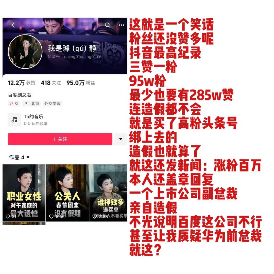 来源 | 新熵 作者丨樱木 编辑丨伊页 百度的公关一号位,正在遭受流量的反噬。 五一假期里,百度负责公关的副总裁璩静的短视频账号“我是璩(qu)静”火了。凭借着犀利的内容,以及传统互联网精英对“996”的深刻理解,迅速吸引了公众的目光。 ![]() “员工闹分手提离职我秒批。”“早上七点到晚上十二点随时待命”等言论,让狼性、女霸总等形容词成了璩静的标签,加上名校毕业、以及曾经任职华为的履历,进一步坐实了精英人设。对此内容,从C端反馈来看,分歧非常之大。同意者认为,大厂文化原本就追逐效率,但反对者则认为璩静的表述,太过无情。对立的立场,也让璩静的流量进一步提升。 与此同时,作为百度的副总裁,璩静亲自下场拍短视频,也让外界浮想联翩,百度是否要All in 短视频?亦或是抄周鸿祎的作业,从流量池中赋能自身业务? 但事件的反转来得非常之快,随着流量的持续飙升,外界对于璩静的质疑,也开始逐步升级。 ![]() 有分析人士指出璩静的抖音账号,从点赞数量以及涨粉情况来看,并不像是一个突然爆发的账号。随后据新抖数据显示,早在2022年3月,该账号粉丝量就超过了90万,并非近日才涨粉。粉丝画像显示,该账号女性粉丝居多,占比达到了93.65%。从以上信息基本可以确定,璩静的账号并非从零做起,更像是买号得来。 同时,在内容方面,璩静以及百度公关团队的规划也相当草台班子。从已发的几条视频来看,内容分别指向了情感、职场、职业、家庭等相对与自身业务无关的方向,虽然受众面广,但与企业相关性相差较远,更像是一个网红博主的打法。而过分尖锐的观点,快速激化了矛盾,也引发了较大规模的口诛笔伐,流量是赢来了,但这些流量既无益于公司业务,也没有让大众提升认知。这一点上,与在北京车展上赚足流量的周鸿祎和雷军相比,高下立判。 ![]() 回归到璩静的主业公关方向,有网友在评论区中提出了问题,“如果你在任时遇到当年的魏则西事件,你会怎么推动处理呢?。” “没有意义”,“无法判断”,“这不公平”,三个较为模糊的回应,显然有些顾左右而言他。多位网友表示,魏则西事件作为入选商学院级别的公关案例,不但有商业价值,同时也是社会价值的体现。在强调社会责任的当下,为何百度的公关一号位却对此事件采用了回避,甚至躲闪的态度,实难成为一个令公众满意的答案。 回顾璩静流量走红的整个脉络,从抖音短视频的角度来看,包装痕迹极为明显,一些场景、话术,与抖音知识付费大V海参、大蓝等塑造IP的手法十分相似。从某种程度上来说,甚至可能是外包团队刻意营造出的结果。但从另一个视角来看,百度如此迫切地下注短视频,似乎也显示出了,内部对于流量、增长的压力。 截至目前,璩静已经删除了抖音账号上的所有相关视频,同时粉丝也在逐步离场,像是看完了一场热闹。但相信这场风波下的百度,还会继续疲惫于流量的焦虑和压力之下。 文章来源:“新熵”,未经允许不得转载。 文章代表作者观点,版权归原作者所有,热传平台仅提供信息存储空间服务。 |