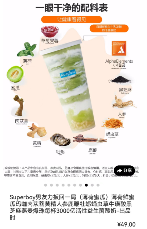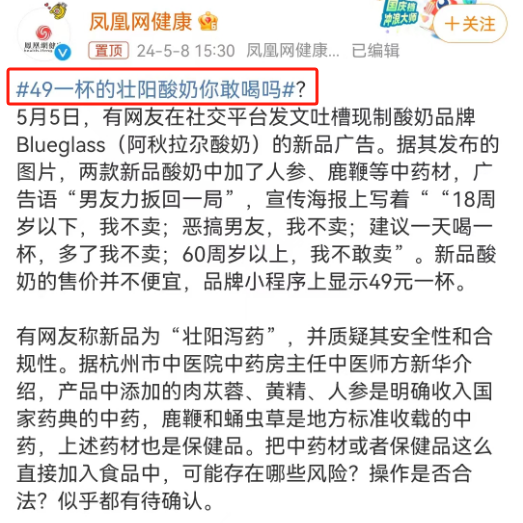 作者 | 杨阳 来源 | 顶尖广告 这届酸奶刺客已经不局限于刺一下,还想擦一下。 我以为酸奶刺客把酸奶当八宝粥卖,卖出百元的天价,已经够炸裂。 直到看到现制酸奶品牌blueglass,往酸奶里加壮阳药,把饮料变药,才发现酸奶已经进入next nevel。 ![]() ![]() 图源:凤凰网健康/小红书网友 什么都往酸奶里加,只会害死你。 没有意外的话,blueglass要因为“擦边”翻车了。有意思的是,另一边的椰树也因为擦边被罚上了热搜。 ![]() 图源:老板联播 没有对比就没有伤害,大家开始心疼椰树了,就差把建议查查blueglass这话喊出来。 ![]() 01 今天的话题,还要从Blueglass的新品说起。 Blueglass最近出了两款产品——薄荷黑巧蜜瓜(酱香型)、薄荷蜜瓜(清香型),被戏称为“壮阳酸奶”、“男友力酸奶”。 ![]() 图源:Blueglass小程序 调侃不是空穴来风,Blueglass给酸奶加了猛料,玛咖、肉苁蓉、黄精、人参、鹿鞭、牡蛎肽、蛹虫草、牛磺酸、小桔袋。 ![]() 图源:Blueglass小程序 虽说药食同源,但这酸奶配方曝光后,网友不淡定了: 这到底是不是药品级别酸奶,是否有通过审核? ![]() 开始好奇这个酸奶功能,是喘息还是窜稀? ![]() ![]() 这玩意儿如果下了壮阳药,女性能不能喝呢? 惊呆的网友吐槽为敬,好奇的网友先喝为敬。 ![]() 虽说年轻人有自己的保健品,但东西不能乱吃,话不能乱讲。 可现实是Blueglass不仅被质疑“乱吃”,还被质疑“乱讲”,广告也疑似在搞擦边。 Blueglass在物料中标注“18禁”,还附上不少虎狼之词—— “男友力扳回一局”“18周岁以下,我不卖;恶搞男友,我不卖;建议一天喝一杯,多了我不卖;60周岁以上,我不敢卖”。 ![]() 图源:微博网友截图 当我在纳闷这是能说的吗,却发现商家怕你看不懂,若有其事写上“别说你不懂”。 ![]() 图源:微博网友截图 02 用网友的话来说,这一波营销很黄很暴力。但又不得不承认,Blueglass一直以来很会营销。 ![]() ![]() Blueglass就像年轻一代自己的保健品,不同于忽悠老一辈的品牌的洗脑恐吓一套,它拿捏住年轻人的健康营养消费需求,懂你喝饮料既要又要还要。 将酸奶做得高端。 作为中产精致酸奶、酸奶届的爱马仕,Blueglass是相当“称职”。 把酸奶定价25元-50元区间,50元是什么概念? 8杯6元的蜜雪冰城奶茶、16瓶555ml怡宝水,打工人两顿午餐。 然而有乳业分析师公开表示,高端酸奶的生产成本约3到6元。 那Blueglass做高端底气在哪?问就是酸奶概念。 在Blueglass的日常传播中,把“有机健康、自然好状态、法国蓝带、北纬45度”buff 叠满,随便丢出一个概念,都很能装。 ![]() 图源:Blueglass小程序 虽说高价不胜寒,但总有中产会买单。 有人评价茉酸奶是女大学生的味道,Blueglass是中产女性的味道。 ![]() 将酸奶做得科幻。 消费升级时代,消费者消费观也升了。 分众传媒创始人江南春说过,现在的消费者有这几个特点: 爱美、爱玩、爱健康。怕老、怕死、怕孤独。缺爱、缺心情、缺自己。 从咖啡到酸奶都在卷健康,你说你无蔗糖我说我无脂肪......但口说无凭。 就跟摸纸质书、摸钱让人心里踏实一个道理,Blueglass决定把“健康”具象化。 把浩瀚如烟海维生素配方打印出来,贴在饮料杯包装上,“输液瓶”配料表的梗也有了。 ![]() 图源:小红书网友 这一贴就是贴心,原本平平无奇的酸奶,一下子变成打工人防猝死套餐。 知道的是在吃酸奶,不知道的以为在吞元素周期表。 ![]() 图源:Blueglass官微 虽然良奶酸人,但胡吃海喝难免产生罪恶感。 喝着标榜着低卡有机的酸奶,既能享受喝饮料的快感、填饱肚子,还能喝得更心安。 正如网友评价“像喝数据一样,终于不用感到罪过了”。 ![]() 图源:小红书网友 产品包装玩得花,Blueglass联名也玩得花,通过联名有着健康养颜人设品的品牌,强化产品的健康认知。 联名韩国高丽参的品牌老字号正官庄,Blueglass把“正官庄红参蜜桃汁”加入活性益生菌酸奶中;联动燕之屋,推出胶原蛋白肽锁鲜燕窝。 ![]() 图源:Blueglass官微 将酸奶做成网红。 与其说Blueglas在卖健康,不如说还卖颜值,通过多巴胺营销赋予酸奶网红气息。 你只看到Blueglass整些胡里花哨的东西,实际上人家玩的是色彩营销的高端局。 广告圈有个“7秒色彩理论”,说的是消费者会在7秒内对产品产生第一印象,色彩的作用达到67%,色彩在传播中的咖位可想而知。 值得一提的是,Blueglass产品配料中的酸奶、牛油果、坚果等,位于海外的“多巴胺饮食”名录中。 也就是说,吃这些东西是会让人产生快乐体验。 Blueglass通过明快色彩、健康的食材搭配,赋予酸奶多巴胺的元素,把酸奶做成高颜值网红产品。 ![]() 图源:Blueglass官微 一来通过提供高颜值的包装,为消费者提供拍出出片的情绪价值。 二来用健康食物解锁他们多元味蕾,调动消费者的积极情绪,收获分泌多巴胺的消费体验。 03 Blueglass此次被嘲出圈,抛去Blueglass会营销不说,还怪饮料擦边这事早有先例。 正如网友忍不住建议Blueglass干脆和汇仁肾宝片联名。 ![]() 其实也不怪网友这么建议,汇仁肾宝片的保健风营销过于炸裂,在首因效应的作用下,让人忍不住将两者联系在一起。 说到壮阳,难免有人想到汇仁肾宝片,还有海南三椰——椰风、椰树、椰岛,撑起了海南擦边广告的一片天。 一方水土养一方人,如果说没有一只鸡可以逃出广东,那么没有一条擦边广告可以逃出海南。 海南有首歌《不到海南岛》就是这么唱的:不到海南岛,不知道