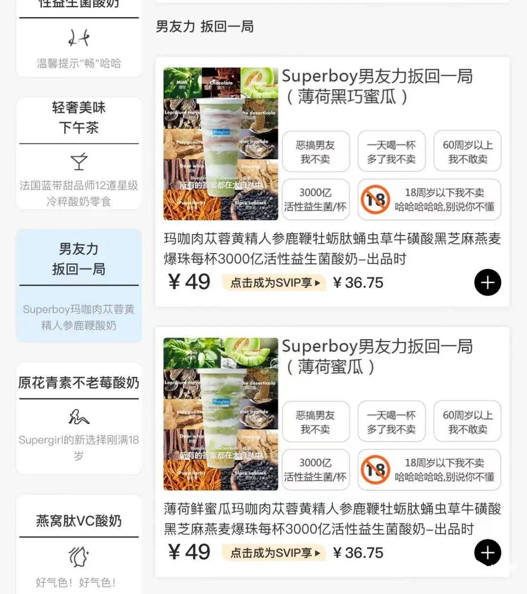 作者 | Hiu 来源 | 互联网品牌官 营销的尽头是壮阳??? 本以为只有在电视这种传统媒体上才能看到“壮阳药”广告,没想到在现代大都市的高端商城中也能看到,而且还特意标注了“18禁”的符号。 更让人感到无语的是,打出这个广告的竟然是一个以女性用户为主要消费群体的酸奶品牌。 01.“壮阳泻药”广告,涉嫌擦边 近日,在一线城市备受追捧的现制酸奶品牌blueglass,上新了两款酸奶新品,“薄荷黑巧蜜瓜”和“薄荷蜜瓜”,其中添加了不少中药材,如玛咖、肉苁蓉、黄精、人参、鹿鞭等,售价均为49元。 广告中配上一张网球运动员的形象照片,宣称“男友力扳回一局”,并罗列出购买建议“18周岁以下,我不卖;恶搞男友,我不卖;建议一天喝一杯,多了我不卖;60周岁以上,我不敢卖”,此外,还附上一句内涵十足的“哈哈哈哈哈,别说你不懂”。 ![]() ▲ 图源:小红书 要不是放上酸奶的产品图,不知道还以为卖的是什么大全大补药呢。 更有人表示,乍一看还以为是“xing药”。 ![]() 该款新品一上市便引发了网友们的质疑,一方面是于酸奶中加入中药材是否安全与合规,一方面是品牌方的海报广告使用大量具有引导性的描述,是否涉嫌擦边违规。 ![]() 据南都湾财社记者采访,医生分析道,Blueglass新品中声称特别使用的玛咖、肉苁蓉等成分多是补肾的中药,主要功效是补肾壮阳、补精血、补充营养成分,不建议消费者将中药和酸奶混在一起食用。 此前Blueglass就被消费者调侃为“泻药”,这次新品推出,网友直接称其为“壮阳泻药”。之前喝了会腹泻,现在加上补药,不知道会产生什么“神奇”功效。 一杯酸奶饮品主打中药的效果,有人仿佛看见了希望的曙光,表示“有需要”。 ![]() ![]() 也有人感觉Blueglass新品广告成功骚扰了所有人,从小孩到女人,从女人到男人,无一幸免。 ![]() 在爱恨交织中撕出一条裂缝,魔幻的消费市场就在那儿生根发芽,最终这个世界癫成了我们无法想象的样子。 02.喝的不是酸奶,是概念 “Blueglass的成分表比打工人的命还长。” 看这张密密麻麻满满当当不留一丝空地的元素周期表,它写的是营养成分吗? 不,它写的是打工人无处安放的精神寄托。 ![]() ▲ 图源:小红书 到底健不健康、有多健康,选择买单的年轻人不会刨根问底,毕竟大家都知道,营销最重要的是形神兼具,“疗效”都在配料表里了,管不管用一切听天由命吧。 先别笑。 他们还真是,一个敢卖,一个就敢买。 因为光是这几张营养成分标签,就已经让人觉得这杯东西不简单,还能给你一种物超所值的信任感。 尝过的都被它征服了,纷纷慨叹“这东西有魔力”。 ![]() ▲ 图源:小红书 即使很多消费者甚至是店员亲测的“窜稀套餐”,也阻拦不了年轻人激情下单,以身试“泻药”。 这不是传说,是一个个消费者花费数十元测试出来的“有效配方”。 就在今年3月,#网红酸奶Blueglass成新型泻药#还喜提微博热搜。以为会劝退消费者,没曾想是打了一波反向广告,直接打到年轻人心坎里。 追求“一泻千里”快感的消费者,更是把具有“通便功效”的Blueglass奉为“减肥瘦身”的第一大饮品,slogan都替它想好了“真的会泻”、“泻泻更健康”…… Blueglass老早就没把消费者当外人,大大一个温馨提示:“畅”,贴在背身中。人家也没想要装,直截了当将槽点变为卖点。 ![]() ▲ 图源:小红书 如今,45元一杯的“新型泻药”依旧火热畅销。 有不少要一探究竟的新闻工作者,喝了Blueglass后无一例外都驻扎在厕所了。 真不是开玩笑,这是经过官方认证的。 该酸奶的商品介绍页明确提醒:肠胃消化功能弱者建议不食用本品。 Blueglass官方客服表示,每杯酸奶都至少有1000亿的活性益生菌,同时含有丰富的膳食纤维,益生菌和膳食纤维会改善胃肠道菌群,活跃肠道,因此会有“畅”的反应。另外,“buff畅系列酸奶”有5000亿活性益生菌,“畅”的反应会更加猛烈。 主打叛逆的年轻人,就好这一口。 关键是它贵,而且还“难喝”,巧妙地将“贵有贵的道理”、“良药苦口”这两点融会贯通于一杯酸奶中,帮助年轻人抵御他们对身体的亏欠与焦虑。 这钱花得,值了。 03.剑走偏锋的“天价酸奶” 在极度内卷的饮品消费市场,高端奶茶品牌早已低下了高昂的头颅,把“3字头”的价格降到了“2字头”甚至是个位数。 恰恰是这个时间点,给了现制酸奶品类大展拳脚的机会,涌现出了Blueglass、茉酸奶、一只酸奶牛、兰熊鲜奶等代表性玩家。 其中最为红火的莫过于频登热搜的茉酸奶和号称“酸奶届爱马仕”的Blueglass。 不知好歹的茉酸奶曾发出过一则关于新品心理价位的问卷调查,让消费者从68元、88元、108元中做出选择。 ![]() ▲ 图源:茉酸奶 这么有恃无恐地讨骂还真是不多见。 由于原材料的供应和保存条件较为严苛,叠加消费场景的限制,现制酸奶难以撼动茶饮咖啡的地位,所以品牌们都集中在市场定位上突围,追求更精细、更高端。 以Blueglass为例,把酸奶当作保健品来卖,呈现出一种让人倍感健康的错觉。 值得一提的是,早在2021年,Blueglass因为违规宣传“增强免疫力”、“美容养颜”、“延缓衰老”等功效,被北京市朝阳区市场监管局罚款6万元。 杀不死你的,都会使你更强大。 这不,Blueglass带着它的“壮阳功效”卷土重来了。 “18岁以下我不卖,60岁以上不敢卖。” 针对年龄限制这一说法询问Blueglass店员,其表示目前公司还没有制定确认顾客