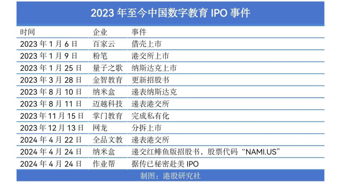 来源 | 港股研究社 作者丨雪花一下片 资本市场不愧是总是走在实体经济前沿的预测性经济。 近日,A股多家从2022年或2023年等不同时间段内就“悄悄”以趋势性走强的教育企业发布了最新业绩公告。事实也确实如市场所预期的那样,整体这些企业业绩显现很强的韧性,如学大教育、行动教育等。 由此,市场不免有声音在猜测,3年过去,国内教育机构或许已经到了足够底部的发展阶段。 尤其是,从2023年至今,国内包括粉笔、量子之歌以及近期传闻秘密计划赴美上市的作业帮等多家教育行业机构的再资本市场中的新举动,或许也进一步说明了行业正在加速确认“低点”,甚至想要是有所复苏。相比之下,22年A股和港股中仅有数字化教育硬件供应商点读机上市了。 ![]() 不过从行业内部的分化,以及上市地点选择来看,或许这种复苏仍有很微弱,行业整体依旧处于磨底,但又蠢蠢欲动的阶段。 行业内部分化“超明显” 多家K12教育企业盈利修复 2023年中国上市的教育企业从业绩来看,呈明显的分化迹象。 首先,K12教育领域强者韧性极为显著,业绩已经入修复期;但大多依旧处于收入规模持续缩小,亏损仍旧波动性缩减中。 具体来看,21年政策出台前夕就实现融资,整体现金流充裕的学大教育(K12个性化教育与职业教育并进)在这一轮行业震荡之中韧劲最强。财报显示,23年其收入规模同比增长23.09%,达22.13亿元,虽然整体较2021年及之前仍处于较低位,但正稳定上升中,24Q1其营收继续同比23Q1增长35.97%。而盈利方面,早已从21年的突发大幅亏损,扭亏为盈,23年归母净利润比22年同期相比增长超10倍,达1.54亿元。 体现在二级市场,拉长时间线来看,从23年4月27日至今区间,学大教育股价翻了3倍,可见市场对其经营的强预期性。 ![]() 更为甚者的是,在港股市场中,主要提供民办教育服务、教育旅游业务及国际课程的思考乐教育,其股价从2023年11月的最低价0.79港元/股,一路震荡上行,截至3月4日区间股价涨幅达545%,即使当前股价有所回调,但区间涨幅仍维持在超4倍。 资料显示,思考乐教育2023年实现营收5.71亿元,同比上一年+41.97%,归母净利润同比增长58.03%。受21年行业政策大调整后,其在2022下半年开始就迅速扭亏为盈,此后营收与盈利都呈持续修复状态,可见主攻素质教育领域的思考乐在经营上的强韧性。 至于,凭借转型直播电商的新东方,其教育板块同样营收规模与净利润也都处于快速修复并提升中。近日其在美股发布的2024财年Q3季报显示,其教育业务受大学生等成人海内外备考火爆需求影响同比增长了48.65%,达31.77美元,首次修复到2022财年前夕的水平,仍是其绝对主力军。其中括了非学科类辅导业务和智能学习系统及设备等教育新业务包,更是超预期。 而在美股上市,兼顾1-24岁-1岁到24岁各年龄段人群个性化学习需求的好未来,更是在2024财年Q4实现超预期业绩增长,净营收达到4.296亿美元,同比大幅增长60%。从整年度来看,2024财年实现营收14.9亿美元,对比2022财年缩减了约66%,但亏幅大幅缩减至-413.80万美元。 由此可见,在素质教育以及K12个性化教育领域的头部企业经营状况均呈显著修复状态。 值得一提还有兼顾上游油墨和下游复读&职校业务的科德教育。21年政策之后,其业绩首次出现亏损,高达4.47亿元。但随后在22年至今虽然营收规模略有收缩,却始终维持正向盈利,并在23年创下盈利最高点,实现归母净利润1.37亿元,同比增长83.6%,24Q1继续同比23Q1增长13.9%。 事实上,这主要得益于其产业链多环节布局。行业产业链来看,相比最下游直面C端需求群体的教育机构,略偏上游的教辅资料出版、印刷的教育企业,业绩韧性更强。比如,主营教辅图书的策划、设计、制作与发行的世纪天鸿,或是近日首次在港递交IPO申请书的全品文教。不过这一领域市场格局尤为分散,大小不一的民办或国企性质的出版商很多,内部竞争也十分激烈,数字化方向是该领域近年来的竞争核心要点。 相比之下,凯文教育、昂立教育等企业业绩修复速度明显落后于上述企业。资料显示,2023年度昂立教育实现营收9.66亿,同比增长了27%,但净利润继续亏损1.88亿,同比下降-211.89%。24Q1凯文教育净利润亏幅持续缩窄,为-353.82万,同比增长66.66%;同期昂立教育扭亏为盈,同比上一年度增长136.41%。 而这种波动性弱复苏其实正是大部分受到政策调整影响的中小教育机构最常见的业绩形势了。 “就业”教育持续扩张 出海办校新趋势明显 其次,同样值得重点关注的一点是,主攻职业教育或企业教育等领域的企业整体强于K12教育企业,多以持续盈利状态为主,尤其是面向就业方向的教育机构。 如,主攻企业管理培训的行动教育,从22年最低价至今期间,股价趋势性上涨了174.8%。主要是其服务群体是面向企业员工,政策调整并未影响该公司的经营,其近三年营收规模和盈利盈利能力整体呈波动性走强,且24Q1仍维持这种增势。报告显示,24Q1实现营收1.41亿,同比去年同期+28.11%,归母净利润同步增长34.42%。 其他,如面向成人提供非学历职业教育及培训服务的粉笔,2023年首次结束2020年至2022年的大幅亏损,实现归母净利润1.89亿元,营收规模更是创下新高。此外,专注于学生知识型就业教育的中公教育营收仍在下滑中,相比20年高峰夭折了超6成,但显然其盈利也进入大幅修复中。 而与就业有关的职业教育中,如中教控股、中国东方教育、新高教集团、立德教育等民办高等职业