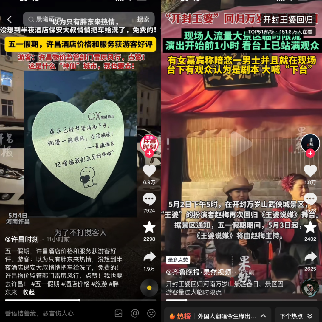 来源:财经无忌 不出任何“意外”,随着五一假期的落幕,旅游市场再度交出了亮眼成绩单。 据文旅部最新测算数据,今年五一,全国国内旅游出游达2.95亿人次,同比增长7.6%,按可比口径较2019年同期增长28.2%。旅游收入方面,国内游客出游总花费达1668.9亿元,同比增长12.7%,按可比口径较2019年同期增长13.5%。 综合多家OTA平台的数据,今年五一假期,国内旅游市场在去年同期高位基础上保持稳中有增的态势,人均预订量和人均消费金额均实现了同比两位数增长。同时,下沉市场增速明显高于一二线市场。 整个五一,“一亿人在XX”成了网友们用来形容五一集体出游盛况的热梗。与去年五一的爆发性出游相比,今年五一似乎有过之而无不及。不只是北京、上海、杭州等主要一线城市“人从众”现象,在“反向旅游”的热潮下,据携程数据,秦皇岛、威海、淄博、黄山、泰安等三、四线城市的旅游订单平均增长11%,而如安吉、桐庐、都江堰、义乌、婺源、景洪等县域小城的旅游订单更是平均增长了36%。 ![]() 图源:携程旅行 在这些宏观数据背后,都与“人”离不开关系。「财经无忌」和一些五一出游的年轻人聊了聊发现,他们今年五一出游最直接的感受可以总结为三个“更”:目的更明确、价格要更有性价比、更愿意为体验付费。 为了抓住更多年轻人,每年的五一,各地文旅局和地方政府也频放大招,集体整活儿。四川剑门关景区背诵《蜀道难》赢门票、广东潮汕的英歌舞、淄博的海月龙宫万人烤场......与过去相比,越来越多的城市不仅关注到五一所带来的流量,也将视角放在了“流量的转化”上,通过结合自身的资源禀赋,正打出各式各样的营销牌与特色牌。 从需求端和供给端的变化来看,也让今年五一的转折意味显得更浓了些。 01.报复性消费走了,情绪价值消费来了 与去年五一的“报复性出游”相比,今年五一年轻人旅游观显然有了新的变化,主要体现为三点:目的更明确、价格要更有性价比、更愿意为体验付费。 为了今年五一能有一个“松弛感”旅行,在3月裸辞休息了一段时间的李鸣早早地制定了行程,从天津、淄博再到青岛,用他的话来说:“一个城市只干一件事。”去天津是为了赴一场音乐节,去淄博是为了吃烧烤,去青岛则是为了去海边看场日落。因为目的明确,整个五一行程李鸣并没有觉得很累:“能在五一出行的勇士基本都知道,出门就是人挤人,不如索性就降低预期。” 与李鸣同样为旅行“做减法”的还有小马。本计划在南京打卡景点的她,在第一天经历了夫子庙的“人山人海”后,立刻决定调整自己的旅行计划——从景点打卡转变为在穿着汉服来一场Citywalk。她和朋友预约了第二天的汉服妆造,挑选了自己喜欢的服饰,在老门东边吃边拍边玩度过了一天。因为顺势改变计划,小马和朋友还有了意外收获:“我们逛到了白鹭洲公园,工作人员看到我们穿着汉服,还免了我们的门票。” ![]() 小马的汉服体验vs南京景区人流 图源:受访者 与社交媒体上所展现出的“盲目跟风打卡”不同,深知“五一旅行热”的年轻人已开始灵活转变旅行计划和思路,除了更明确的目标外,强调小众和性价比的“反向旅游”也成为这个五一年轻人出行的新选择。 五一期间原本打算带着家人去重庆的赵良因为“抢票失败”最终决定避开人潮,自驾从上海前往浙江安吉“吸氧”。在安吉,赵良还特地避开了云上草原等网红景点,去了余村、长谷洞天,尽管五一期间人流量还是很多,但门票和饮食价格性价比都很高,加上有山有水的景色,让赵良一家的体验感都很不错,整个旅行只花了不到3000元。 像安吉这样的县域目的地已成为了年轻人们“反向旅游”的首选。携程数据显示,桐庐、都江堰、阳朔、弥勒、义乌、婺源等地的旅游订单在今年五一平均增长36%。区别于去年流行的特种兵打卡,越来越多的年轻人在寻找一种更贴近自然、更自由的新玩法。 还有的年轻人,这个五一的旅行,只为了奔赴一场浪漫。在山东烟台里蹦岛,被歌手华晨宇带火的“日出演唱会”在这个五一成为了出圈话题。一位现场粉丝告诉「财经无忌」,虽然后续交通体验不是很好,但“日出演唱会”还是给了歌迷很好的体验。 ![]() 华晨宇在烟台的“日出演唱会” 图源:烟台文旅 如果将去年五一形容为“报复性消费”,从上述年轻人的新旅行趋势不难看出,今年五一所呈现是一种“新的情绪价值消费”。 一方面,在消费理性的趋势下,不追求旅行高大上的牌面,而是向往体验和价格的性价比,将会成为未来的长期趋势。另一方面,在旅行中,人们也越来越注重情绪价值的精神消费——一次汉服体验、一次音乐节、一场演唱会...... 从报复性消费到情绪价值消费,这是在五一“人山人海”,我们需要关注的第一个新变化。 02.从抢人到留人,城市也变了 为了在这个五一抓住年轻人,城市与城市之间也开启了新一波的“抢人大战”。 走在最前面的就是各地再度“出战”的文旅局长们。在今天,文旅局长们“躬身代言家乡”已不是什么新鲜事,从去年年初开始网红文旅局长们的短视频大战,再到今年年初由哈尔滨、河南所掀起的“喊话大战”,具有网感和亲和力的“网红局长们”俨然已成为地方的新晋IP。 今年五一,比起此前的卖力式营销,“文旅局长们”打起了“不卷牌”——从花式镜头营销转变为踏踏实实地旅游推介。比如,著