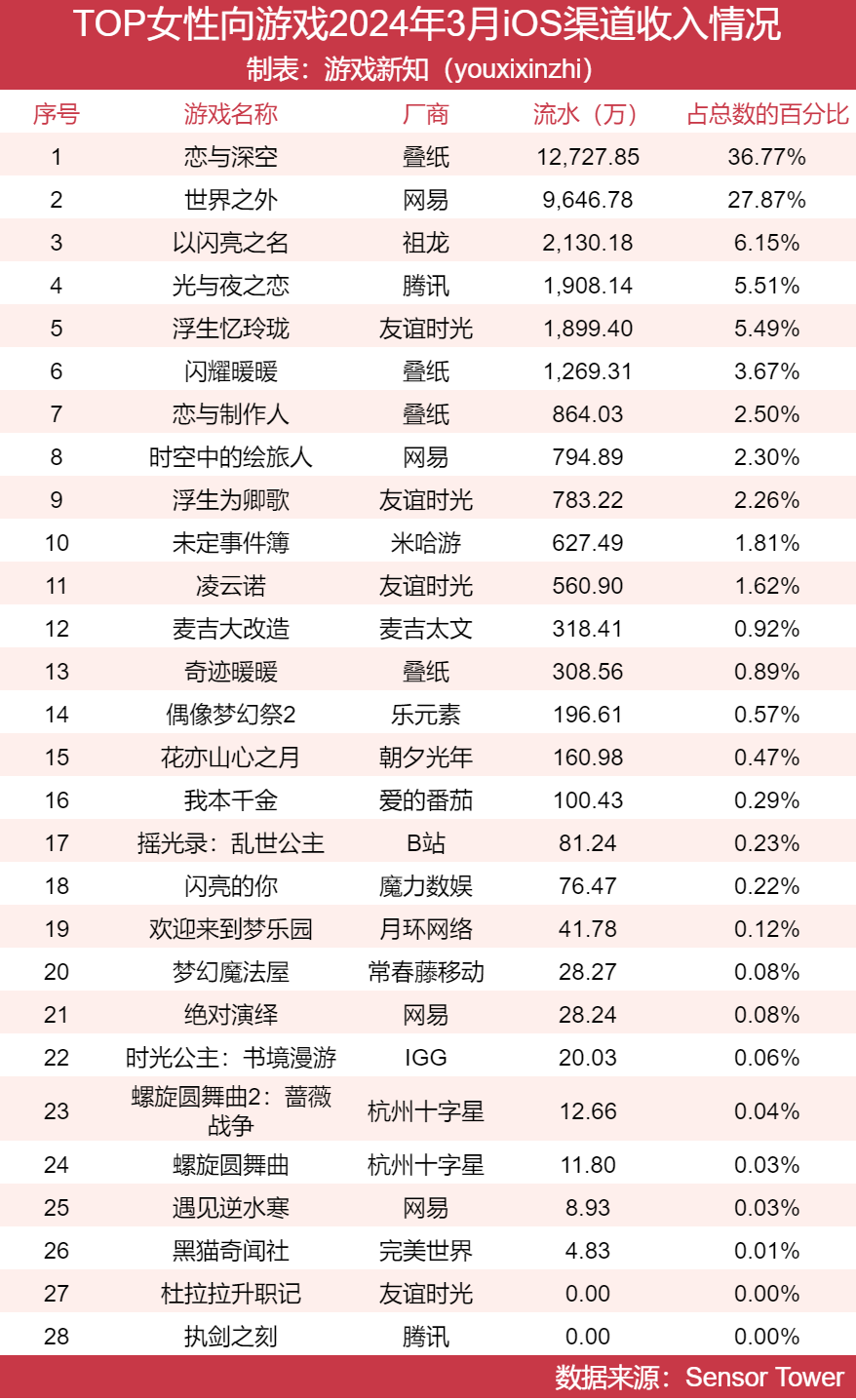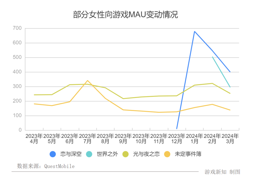 来源 | 游戏新知 作者 | 夜风 事情已经过了三个多月,那场「决战国乙之巅」的盛况仍然历历在目。1月18日这天,叠纸的重要项目《恋与深空》和网易的《世界之外》同时上线,《光与夜之恋》《时空中的绘旅人》等数款头部女性向游戏也纷纷掏出大大小小各种活动作以防守。这恐怕是整个女性向赛道最热闹的一天了。 凑热闹的同时,游戏新知隐隐感觉,这个潜力巨大的赛道似乎要变天了。 如今尘埃渐渐落定,新游戏经受过了市场的第一轮考验,老游戏也基本都已回到稳定的活动更新频率上。我们也是时候重新审视一下这个赛道了——现在到底谁是老大?有多少公司已经挤了进来?海外和小游戏领域战况如何了?市场还有多大的发展空间? 游戏新知整理了2022年以来上线的女性向新游,以及一些头部游戏(或曾经的头部游戏)的现状数据,以求尽量全面、直观地展示这个赛道的动向。格局交替之际,也正是我们进一步了解市场的机会。 就在当下,尾部游戏陆续退场,「新王」的趋势已经显现。尽管竞争已经激烈到了一个新的高度,我们仍能看到,这片市场的潜力还远远不止如此。 注:《明日方舟》《无期迷途》《山海镜花》等许多二次元游戏实际上也很受女性玩家欢迎,但不属于严格意义上的女性向分类,在本文中未纳入统计。 两个新品吃下了六成市场 我们在近两年似乎总能感觉到,更多的女性用户正逐渐涌入游戏市场,她们的付费能力也越来越显现出来。与此同时,市场上确实陆续出现了不少新游,看准了这片新兴的市场的机会,尝试分得一席之地。但真正站稳了脚跟的,仍然只有少数的头部产品。 游戏新知整理了2022年及以后上线的女性向游戏的现状,用iOS畅销榜排名、iOS渠道流水预估等数据作为参照。考虑到新游需要一定时间沉淀,本次统计仅选取了三月的数据。部分游戏如果在三月没有推出重要活动,可能对流水有一定影响,因此排名仅做参考。 ![]() 可以看到,在1月18日同时上线的新游《恋与深空》和《世界之外》大幅领先,仅iOS渠道的流水就达到了一亿左右,而且两款游戏的排名变动趋势都比较稳定。 随后的第二梯队是祖龙的《以闪亮之名》和友谊时光的《浮生忆玲珑》,前者排名相对稳定,后者则呈现出明显的下滑趋势。 除此之外的游戏虽然不乏腾讯、网易、B站等大厂作品,但状况都不算好,基本位于畅销榜200名以外,收入数字也并不乐观。甚至有四款游戏(在表格中为灰色)已经停运,在架时间最长的有一年半,最短的只有三个月。 结果尽管新游不少、大厂扎堆,近两年里真正跑出来了的新游恐怕只有「三个半」。优势仍然集中在少数的头部产品身上。 ![]() 这几款头部新品大放异彩,也影响了整个女性向赛道的市场格局。一些老牌头部产品的统治地位因此大受挑战,但值得注意的是,它们本身已建立起的用户根基并未受到太大影响。 把目光放大到目前市场上已有的头部及中腰部产品,可以发现统计范围内的产品三月里在iOS渠道共创造了约3.46亿的流水,而《恋与深空》和《世界之外》一共占到了总数的约65%。另一边,换装赛道中的《以闪亮之名》也已经大大超越了「暖暖」IP。女性向市场「四大国乙+暖暖」的格局恐怕已经改变了。 ![]() 但这并不意味着新游戏抢走了老游戏的用户。以《光与夜之恋》《未定事件簿》和两款「暖暖」IP游戏为例,从畅销榜排名来看,新游上线前后,老游戏的排名并未出现明显的下滑。 ![]() ![]() 仔细观察,甚至恋爱类游戏的两款老游戏排名还略有提升,可能是为了防守而提升了活动密度或质量,一定程度上刺激了用户付费。头部的这几款老游戏,近几个月里确实经常有玩家吐槽活动排期变密。 ![]() 从用户活跃度情况来看,《恋与深空》《世界之外》《以闪亮之名》三款新游也有明显的优势,但差距没有收入方面那么大。游戏新知统计了游戏大类中MAU(月活跃用户数)和DAU(平均日活跃用户数)排名在350名以内的女性向游戏,能看到三款新游的数据明显领先,而「四大国乙」(《光与夜之恋》《未定事件簿》《恋与制作人》《时空中的绘旅人》)之间也已经悄悄拉开了差距。 ![]() 空白表示排名未进入350名 尽管如此,新游在用户活跃度上似乎也并没有对老游戏造成非常明显的影响。仍然选取上面提到过的两新两老四款游戏作为对比,能看到老游戏的MAU变动基本处于正常的波动范围内。两款新游戏红利期已过,呈现出迅速降温的态势,但目前MAU仍然高于其他女性向游戏。 ![]() 综合来看,三款新游几乎是「空降」到了赛道头部,而非从其他游戏手中夺走了大量用户。这意味着可能有更多用户在涌入女性向这个盘子,市场仍有拓展的潜力。或许是它们展示出的更「新」的技术力和市场洞察力,使其得以发掘比老牌产品更广阔的市场空间。 就《恋与深空》而言,细致真实的3D建模效果是它最大的扩圈因素,「看脸入坑」的玩家相当多。一些玩家此前从未接触过同类游戏,对于扫荡等基本功能都不熟悉。以至于在4月26日的版本更新中,也就是上线三个多月之后,游戏还甚至特意添加了一段引导,提示玩家扫荡功能的用途。 ![]() 而《世界之外》的特点是地道的「无限流」网文剧情,不仅文本量大管饱,连玩法也最大限度地降低了门槛,让游戏向着「能玩的网文」方向靠拢。可以推测的是,它对于网文受众会有额外的吸引力。在社交平台上,表示自