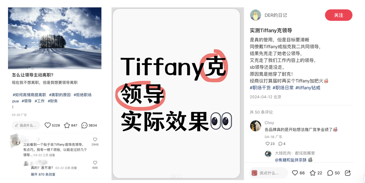 近年来,社媒平台上掀起“寺庙热”、“付费抄经”、“彩票热“等,迎来“玄学”的野蛮发展时代。 近一年,微博、抖音、小红书有超3千万篇帖子在讨论玄学话题,近60亿人参与互动。话题从星座塔罗等西方玄学,到紫微八字等中式命理。 ![]() (图源:度镜洞察) 而珠宝品牌营销方,也乘“玄学”之风,努力寻找破圈之路。比如近段时间,关于“Tiffany克领导”的话题在小红书屡见不鲜。 一、这些珠宝品牌都在玩玄学 1.Tiffany T系列——克领导 一切的起源来一条小红书笔记《怎么让领导主动离职?》,热评第一是“趁他不在打开他的OA”,而第二条就是引爆“Tiffany克领导”热门话题的回复:“听说Tiffany首饰能克领导,巧合的是,我有一根T项链,戴的时候走了好几个领导。” 接着,越来越多测评Tiffany是否能克走领导的讨论越多: