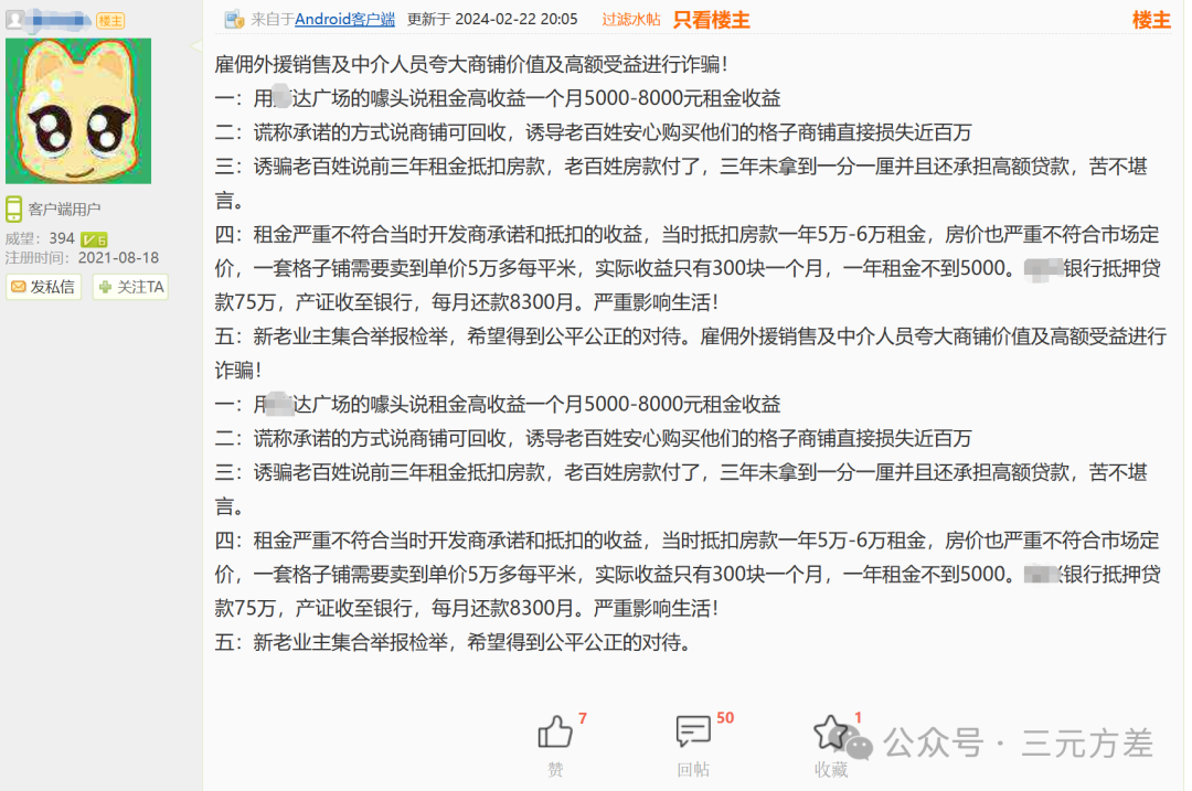 来源:三元方差 别误会,标题里的“活该”说的其实是我自己。 我最近差点中产返贫,复盘了一下事情的整个过程,只有一个结论就是自己作死,只能骂自己一句“活该”。 我在互联网大厂工作,收入比上不足比下有余,算是标准的中产阶级。 一直流传着中产返贫三件套的说法:高额房贷、全职太太、国际学校。 这三件套,我除了国际学校,其他两件套都没逃开。 好在我通过前几年的消费降级和提前还贷,高额房贷问题目前已经基本解决,现在的我只剩一件套了。 但是人性就是喜欢作死,中产就“喜欢”被收割。 因为没有了高额房贷的压力,原本用于提前还贷的收入成了每月的盈余,所以这笔钱需要找到一个去处。 我思来想去,准备买个商铺。 ![]() 险些被收割的经历 我的诉求是能找到一个带来稳定现金流的资产,在未来10年内都不考虑资产流动,所以如果商铺的选址不错的话,是比较符合我的需求的。 买商铺是投资的大忌,主要原因是流动性差,税费高,风险大。 但我决定不听那些投资博主的话,心想他们是说给普通人的,而我很清楚自己的需求,不是普通的投资人。 这是我作死的第一个问题:觉得我比别人聪明。 盲目自信的我,花了几天时间了解现在的商铺行情。 说是几天时间,其实也只是每晚睡前那个把小时的时间,毕竟工作已经占据了大部分的时间。 经过几天的信息收集,我发现现在的商铺行情太诱人了。 10%收益率的商铺到处可见,有些总价只需要几十万。这是什么神仙投资品,我翻看了几天的中介视频,立刻上头了。 ![]() 我加了一些中介微信,了解到周边某城市的商铺信息,高达11%的收益率、某达广场的知名度、房源非常抢手的煽动性话术让我很激动,我甚至都和家人商量好了上门去看房交定金了。 这是我作死的第二个问题:没深入了解就下决定。 虽然我投入的时间不算很多,但也不是一点功课都没做。 我反复和中介确认收益的可靠性,均得到中介肯定的答复。 中介说的未必全对,我还自己验证了下。 买店铺最重要的是人流。我为了验证店铺的人流量,搜索了商场中的餐饮外卖信息,通过成交数和评价数可以看出外卖生意还不错。这说明周边人流还比较大,线下的流量应该也不少。 但我也有一些疑问,比如: 投资回报率这么高,某达广场为什么要卖呢? 我搜索了某达广场近期卖地的相关信息,发现王首富有千亿债务问题,不得不卖楼还债。 一切似乎解释得通了,卖铺是为了还债,我还暗喜,这岂不是还能捡漏? 这是我作死的第三个问题:没有风险意识。 繁忙的工作救我一命 原本我很可能就要踩进这看起来美好的陷阱里,好在繁忙的工作救了我。 原本周三决定看房,但那几天刚好手头有项工作没完成,看房时间只能改到周末。 就是在等待的这几天,我想着再看看有没有什么关于这个广场的负面信息。换了几个不同的关键字后,最终在搜索“维权”这个词的时候,我才发现,这原来是一个大坑。 在网上,我直接搜到了该项目的维权讨论帖。 ![]() 我和其中一个帖子下留言评论的人进行了沟通,了解到这个商铺就是典型的返租商铺的套路。 比如商铺的实际价格是100万,卖家用130万卖给你,并承诺每年能给你返租10万的房租。你一算收益率不错,最初两三年的房租也确实给你了,但一段时间后对方以出租收益不足为由,租金大幅度缩水到只有每年一两万。你一算,发现最初返给你的房租其实也只是你买这间商铺的溢价而已。 你最终买到的是一个年收益率不到2%而且流动性巨差的商铺,这100万的资金相当于完全套牢了。 果然高端的猎手往往以猎物的形象出现。 写这篇文章之前,我只听说过中产返贫三件套。 我后来才知道还有一个“中产不要命三件套”:投资商铺、辞职创业、全职炒股。 返贫三件套我中了一套,不要命三件套我又差点中了一个。 这如果当时脑袋一热,也许真就中产返贫了,你说我是不是活该。 我回想起身边很多中产朋友也都喜欢作死,他们有着各种不同的被收割姿势。