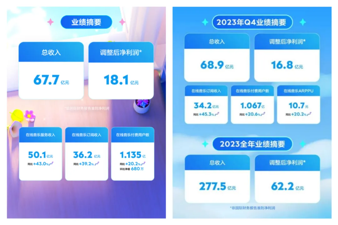 来源:银杏科技 腾讯音乐一季报公布,远超市场预期,并将自上市以来首次派发年度股息。 第一季度,腾讯音乐娱乐集团(TME)总收入为人民币67.7亿元(9.37亿美元),调整后净利润18.1亿元(2.51亿美元),同比增长23.9%。 其中腾讯音乐娱乐集团核心驱动的在线音乐业务持续强劲增长,在线音乐订阅收入同比增长39.2%达36.2亿元,在线音乐付费用户数同比增长20.2%达1.135亿,单季度净增长680万创下历史新高,在线音乐ARPPU也维持健康水平,2023财年年度现金股息约2.1亿美元。 5月13日,腾讯音乐-SW(港股)以54.85元收盘,日涨幅4.08%,盘中一度达到57.3元,涨幅超过8个点。 这标志着,TME专注音乐业务的动作得到了正向反馈,在正确的发展道路上奔跑起来。 ![]() 轻舟已过万重山 从营收数据上看 ,腾讯音乐已经彻底扭转颓势,路程却足够艰辛。TME董事长彭迦信去年表示,2023年是腾讯音乐转型的关键之年,如今看此言不虚。 到当年8月,他与CEO梁柱已搭班两年,腾讯音乐总市值以大幅回落,这是该组合遭到外界垂询的直接原因。2018年12月12日腾讯音乐在纽交所上市后,发行价为13美元,而截至2023年8月2日收盘,报收6.37美元,相对跌幅为51.00%,已经腰斩。 市值减少背后,野蛮生长的秀场业务“花期”已经结束。 早期腾讯音乐凭借着大量版权构筑的护城河,立于不败之地。不管是面对最大竞争对手网易阿里的各种闪转腾挪,还是其各自音乐拳头产品网易云音乐和虾米社交属性或是情怀的双重夹击,腾讯依旧掌握着最多的音乐市场话语权。 实际上,这样的“好日子”在2021年便戛然而止,3年拉锯战却并未改变版权垄断结束的事实,腾讯音乐被迫开放交叉版权给其他竞争对手。正如当时一句戏言:“腾讯跌倒,网易吃饱。”虽然周杰伦一年后在该平台发布的数字专辑《最伟大的作品》销量超过700万张,销售额也突破了2亿元,但火热并非随时可以复制。腾讯苦苦紧握30天新歌独家首发权,期待下一个爆点出现。 当版权优势不再时,亟需寻找下一个抓手,这便是秀场经济。社交娱乐服务成为了彼时腾讯音乐的营收根本,一度占到疯狂的六成以上,或许这可以理解为一种补偿性行为。 好景不长,2022年后,主营业务社交娱乐服务受到了监管高压态势地冲击,收拢战线已是必然之举。从股价上,腾讯音乐迎来至暗时刻,2022年10月31日,美股最低价为3.532美元。比起最高价32.248美元,十不存一。 ![]() 而2023年的年报显示,腾讯音乐“增利不增收”正是源于直播版块的调整。更加合规的非盈利性的礼物设置,是腾讯音乐必须走出的探索道路之一。转型还意味着直播秀场的双重压缩,需要走出舒适区。去年腾讯音乐社交服务仅收入104.27亿元,同比降幅超过三成。 在线音乐服务必须扛鼎前行。 2023年三季度,腾讯音乐总营收65.7亿元人民币,同比下降10.8%,其中在线音乐服务收入却同比增长32.7%至45.5亿元人民币,而社交娱乐服务和其他服务收入同比下降48.8%至20.2亿元人民币,两大版块攻守易势。 彭迦信称:“我们的在线音乐服务收入首次超过社交娱乐服务,达成了公司发展过程中的又一个重要节点。” 2023年第四季度及全年的财报显示,腾讯音乐在线音乐服务收入的强劲增长,其中第四季度在线音乐订阅收入达到34.2亿元人民币,同比增长45.3%,在线音乐付费用户数量同比增长20.6%达到1.067亿 。 而最新发布的2024年一季报显示,总营收67.7亿元,同比下降了3.4个点,在线音乐付费用户数却大涨680万人,可以看做是转型期间的调整过程。在净利润方面,比去年第4季度高出1.3亿元。 所以,一个无可争议的事实便是,TME这叶“轻舟”已驶过万重大山。 谁在为TME充值? 这样成绩的背后,是策略的整体变化。从音乐版权的老路到秀场再到结合内容与平台的“一体两翼”战略,看起来腾讯音乐始终试图探索一个最大公约数。方向的调转,也直观地导致了付费用户群体的变化与转移。 笔者认为,更加年轻化、使用音乐服务时粘性更高是该人群较为突出的特点。 《2022年中国数字音乐产业报告》显示,2022年,包括在线音乐、音乐短视频、音乐直播、在线K歌业务在内,我国数字音乐市场总规模约为1554.9亿元,相较2021年,同比增长16.8%。报告显示,在线音乐市场规模约为180.2亿元,孰轻孰重,无需赘述。可面对强监管下的重拳,这块到嘴的肥肉,也难以下咽。今年有关部门对于秀场整治的态度和力度更加明确。隔壁“老朋友”斗鱼,因为涉赌,在电视和投影仪应用商城里完全隐形。 广东省“扫黄打非”部门早在2020年就对“全民K歌”APP传播色情低俗歌曲、青少年模式形同虚设等突出问题进行过查处。最终,以腾讯在30日自查自纠内下线“交友陪玩”功能告终。《网络主播行为规范》和“清朗·网络戾气整治”专项行动等一系列官方动作,让曾经打算用秀场代替大批量版权优势的腾讯捉襟见肘。 而此前进行的尝试,让腾讯音乐想起一条新思路,即利用头部音乐人的号召力,签署特定版权协议,在QQ音乐等平台首发。与周杰伦合作的成功,让彭迦信看到了一种可能性,即TOP艺人巨大的虹吸能力。 同属腾讯音乐旗下的酷狗音乐紧随QQ音乐的步伐制定营销方案,就在2020年,肖战专辑《光点》一上线就被粉丝买爆,无预热零宣传2小时销量突破400万,一度登顶全球音乐榜,最终销售额超1.5亿元。其中铁粉榜榜首共购买了同一张专辑23399次,花费7万元。 过往的成功经验促使腾讯音乐旗下的酷狗音乐、