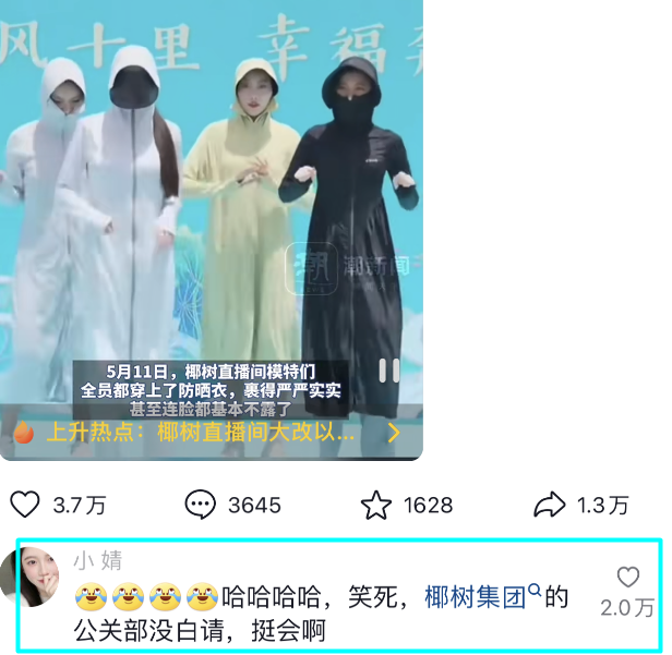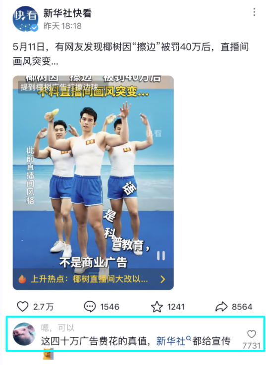 来源:公关界的007 “不想看书,只想看椰树男模” ![]() 这代表了,多少,椰树直播间204万粉丝,的心声! ![]() 5月11日,被罚款40万后,椰树直播间,画风大变: ![]() 不仅“大”女孩,全身裹得严严实实; ![]() 就连男模,诱人的胸肌也没了, ![]() 性感短款也变长了,连脸都裹起来。 ![]() 有网友评论:笑死,公关部没白请,挺会啊。 ![]() 针对被罚款40万,有网友力挺:这40万广告费花的值,连新华社都给宣传。 ![]() 也有网友“遗憾”:椰树一直被罚款一直不改,一直坚持自己的企业审美...(该评论获5.5万第1高赞) ![]() 椰树直播间负责人(女): 我不“色” 没刻意擦边 椰树“擦边”画风,最早起自2022年抖音直播间,当年主打的是4“大”美女。 ![]() 后应网友强烈要求,于2023年,推出4大“肌肉男模天团”。 ![]() ![]() 早前的男模,有点一“颜”难尽... ![]() 直到“欢欢”出道,迅速爆红,成为头牌“花魁” ![]() ![]() 还在线下,跟女粉丝亲密接触,把女粉丝“馋”到不行... ![]() ![]() 4人中,跳的最好、笑得最灿的要属“启子”~ ![]() 人们一直好奇,椰树直播间负责人,何许人也?原来,是位女士,名叫丹丹。 ![]() ![]() 她回应:我不色,我喜欢真实的(身体),真实,他/她就是美的。 ![]() ![]() 她还曾回应擦边与罚款:想传递快乐,没刻意擦边。 ![]() 网友:不擦白不擦 10万人挺只有876人买 2年只卖2.3万元 相对于网友力挺“不擦百不擦”, ![]() ![]() 椰树直播间(抖音)的销售额,让人“大跌眼镜”! ![]() 007查询发现(截止5月11日早上9点),其经典鲜榨椰汁,10万+人逛过,只有876人购买,转化率不到0.00876;而销售总收入只有23476.8元,不够其交罚款40万的17分之一。 ![]() 而另一款椰子水,更是销售惨淡,40万+人逛过,只有427人购买,转化率更低到0.0010675,销售额也只有14987.7元。 ![]() 其实,早在去年,椰树肌肉男模横扫全网,就有营销人士指出:椰树直播间销售额不到1000元。 ![]() 可是,椰树最新财报,又显示,2023年全年销售额突破50亿大关,缴税近7亿。 ![]() 夸“大”椰汁功效 年轻人只喜欢“擦”不买 国际媒体惊讶与嘲笑 为什么,会出现“高人气、惨销售”的如此巨大反差呢? ![]() 007觉得,这可能源自,看擦边直播人群与购买人群的“错位”。 ![]() ![]() 喜欢看椰树男女擦边直播的是年轻人,而真正购买椰树的主力军应该还是中老年人,而中老年人还是以线下渠道(超市等)购买为主。 ![]() 最关键的应该是,虽然年轻人喜欢看擦边直播,但ta们“不傻”,椰树把椰汁(食品饮料而已)的功效,夸“大”成可以“变大”,精明的年轻人,显然是不会随便交“智商税”的。 ![]() 2019年,椰树就因其夸大广告效应,被处罚,并被英国知名媒体THE SUN《太阳报》等国际媒体报道,沦为中国品牌国际笑柄。 ![]() 美国知名潮流与讽刺杂志NEW YORK POST《纽约客》,对椰树椰汁,可以让“胸部变大、曲线变美”的广告,感到惊讶,给出了这事,“奇怪且真实”的“嘲讽”; ![]() 并引用中国网友的评论,作为总结:老牌子,都这么多年了,还这么做! ![]() 这也许代表了 很多椰树忠实及潜在消费者的心声: 直播打擦边球可以 但你不能“夸”大啊! ![]() 结果 一试“差评” ![]() 文章来源:“公关界的007”,未经允许不得转载。 文章代表作者观点,版权归原作者所有,热传平台仅提供信息存储空间服务。 |