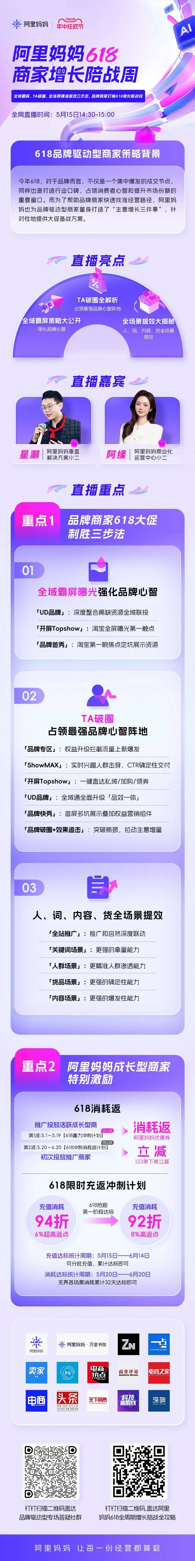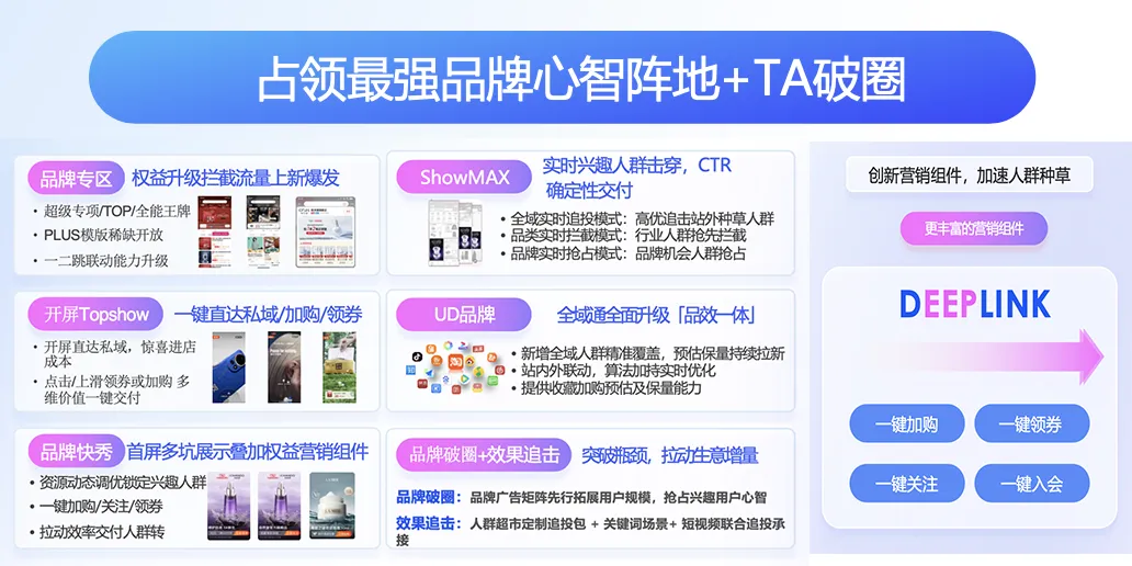文|王亚琪 编辑|斯问 来源 | 电商在线 一年一度的618即将到来。 今年618取消预售,5月20日晚8点直接现货开卖。相比往年,这将是史上消费需求爆发周期最长的一个年中大促。商家需要把握机会,迎接未来一个月高频次的用户活跃高峰。 在此期间,阿里妈妈将持续发挥生意增长的关键杠杆作用——一个显著的利好是,今年,依托于阿里妈妈AI产品能力的革命性升级,在TA人群破圈、新质好货确定打爆、直播全时全域爆发上,阿里妈妈将释放新增量机会,从人、货、场三个纬度,助力商家全面提效。 相较于以爆款货品为运营核心的好货驱动型商家,以及需要完成“从0到1”积累的新手商家,618对品牌商家的价值更为多元——对于品牌而言,618不仅是一个集中爆发的成交节点,同样也是打造行业口碑,占领消费者心智和提升市场份额的重要窗口。 而为了帮助不同类型的商家,更快捷地找准经营路径,阿里妈妈也为品牌驱动型商家、好货驱动型商家、新手商家,量身打造了“生意增长三件事”,针对性地提供大促备战方案。 其中,品牌商家通过“全域霸屏”收拢公域流量,抢占品牌自有阵地;通过“TA破圈”实现人群破圈,挖掘潜在的增量客群;最后利用“全场景精准提效”触达蓄水的意向客户,全面提效,即可在618找到确定性的增长通道。 ![]() 向下滑动查看所有内容 从公域到私域,“全域霸屏”助力品牌商家强化品牌心智 一家企业从初创到成熟,需要经历多个阶段。不同阶段关注的经营目标有所不同。 刚刚开始创业的商家想做出“第一个爆款”,创业中期的商家逐渐操心起“人群破圈”、“货品矩阵”等多方面的运营。而对于更成熟的品牌商家而言,这道题的答案则变得更为复杂——这类商家往往已趋近头部,品牌认知度高、用户体量大,在投放上也更看重“品效合一”。 如何才能在618把品牌势能尽可能放大,实现既有“声量”又有“销量”? 在电商发展的20多年里,淘宝成为越来越多品牌的“第二官网”。它既是不少消费者搜索、认知品牌的第一站,也是集上新、营销、用户沟通和体验为一体的经营主阵地。 数据显示,淘宝月活跃用户数已经高达8.92亿。去年双11期间,88VIP人群规模突破3200万人——过往多次经验均已证明,大促期间,淘宝将会是全网消费需求爆发最集中的场域。品牌商家需要在此精心构建属于自己的强心智阵地,以承接这场可预见的需求爆发。 对于本就有口碑和粉丝积累的品牌商家来说,“全域霸屏”是备战618的第一步。它像是一个“地基”,通过多触点的联合投放,可以尽可能放大品牌势能,汇聚品牌的兴趣人群。 ![]() 具体来说,为了实现全域霸屏,商家可以首先利用UD品牌-TOP、UD品牌-全能王牌、UD品牌-超级全域通等产品深度整合全网资源,通过全域多点触达,打造品牌高地,达到公域霸屏;然后利用开屏Topshow,占领淘宝开屏的第一触点,一键直达品牌专区,将前期积累的公域流量导入私域,同时结合品牌首秀拿下淘宝首屏的独占坑位,实现私域霸屏。 与此同时,利用品牌专区、ShowMax进行搜索卡位、实时追投,则能在提升品牌影响力的同时,确保成交和转化,真正拉通从公域到私域,再到搜索的全触点霸屏链路。 通过这套“全域霸屏”的经营思路,品牌能最高效地触达庞大的客群,并不断筛选出对本品牌有好感的意向人群,或者近期有相关购买计划的消费人群,导入到私域后实现再运营。而这关键的第一步,则一定程度上也决定了后续生意可爆发的上限——就像电商运营中经常会运用的漏斗模型,只有上层的漏斗足够大、宽,底部的生意池子才能做的尽量深和准。 跨品类渗透,“TA破圈”助力品牌商家挖掘增量人群 如果说全域霸屏是品牌商家经营生意的第一步,它放大的是品牌的自有势能,捕捉的是兴趣人群,那么如何在兴趣人群之外,触达更多潜在客群,找到增量,同样是重要命题。 “TA破圈”对品牌商家来说,是经营的第二个关键环节。618正值季节交替,是一年中用户最为活跃的时间点之一,在这个重要的营销节点,品牌除了把握原有的客群之外,也要擅长突破自我,找到那些尚未被挖掘的消费需求,往外探索,主动去拓宽生意的边界。 今年3月,阿里妈妈发布LMA大模型技术,为商家实现人群破圈带来新的机会。 ![]() 这项新技术的最大突破是基于多模态大模型的能力,实现机器对消费者消费需求的精准把握,从而极大提升人货匹配效率。简单来说,LMA是在阿里自研的大语言模型基础上,针对电商场景实现超大规模多模态表征的预训练,能够对商品的文本、图像、视频等多种模态有深入的融合理解,再结合海量消费者行为数据进行模型微调,使得模型能够更懂人。 比如,在过去,当一位钓鱼爱好者在电商平台搜索钓鱼竿后,其首页基本上就会被钓鱼竿商品的推荐信息占领,实际上,这位用户可能还需要购买鱼线、鱼钩、浮标等配套工具,更可能需要购买雨衣、渔夫帽、太阳镜、防晒霜、水壶等户外用品——这意味着,现在通过LMA,平台能更好地理解用户的生活场景,帮助商家精准挖掘商机、实现跨品类破圈。 今年618,基于LMA,达摩盘推出的“TA人群运营解决方案”,将覆盖投前-投中-投后全链路人群运营。在投放前,它将为品牌定义专属拉新人群;在投放中,持续探测潜在的目标人群,加速品类渗透和跨品类破圈;在投放后,评估投后价值,让商家能可持续地运营。 与此同时,今年618,阿里