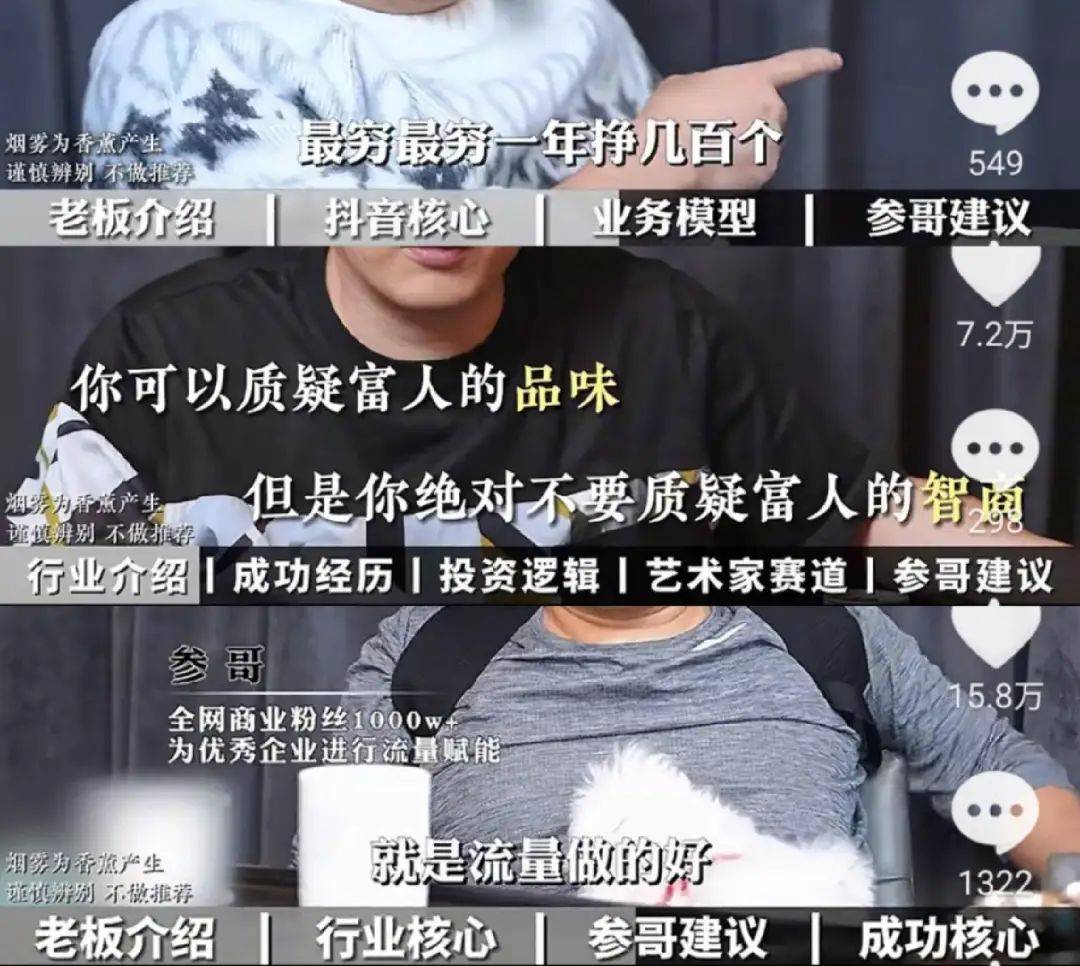 来源:新榜 璩静事件的大结局,将她的“导师”参哥再次推上风口浪尖。 ![]() 璩静因短视频风波发文道歉 近期,百度公关1号位璩静勇闯抖音引发争议,以离职结束了她的个人IP第一次探索,有网友称璩静是上了参哥的课后“着魔”,动员部门所有人做短视频。 据上游新闻报道,璩静曾在今年2月前往烟台,花5980元上了三天参哥的“抖音操盘手课”。随后参哥本人亲自盖章认证,发视频称两人的确见过面,聊得很愉快。 不过,参哥对于网络上流传璩静让部门全体员工学习的“参哥金句”一事予以否认,并表示璩静是被人黑了。 ![]() 这位江湖代号参哥的“商业导师”,因早年做海参生意得名“海参哥”,经过电商和短视频的几番洗礼后,他成为了玩转流量和变现的头部知识付费博主。 “参哥出品,粗暴好用”是他短视频里的口头禅,追随者奉他为商界大佬,批判者认为他是纯纯“割韭菜”。争议之下,以参哥为代表的知识付费博主也与抖音上演了一出相爱相杀的故事。 3月底,抖音发布“厚黑学”“伪成功学”专项治理公告,打击低质吸粉和引流卖课等“割韭菜”行为,参哥、dada和李一舟等博主的相关账号受到禁止关注和封号等处罚。 这些人到底是何方神胜?为何赚得盆满钵满?他们的内容到底是“粗暴”还是好用? 张口闭口几个小目标,“海参哥们”是如何走红的? 参哥的视频开头,总是会用动辄几个小目标的数字赚足眼球,没做过几个亿生意的老板似乎不配上桌。 指点江山时坚定的语气、潇洒里带点不屑的态度,让网友不禁好奇:参哥到底是什么来头,能让一群老板虚心受教? 公开资料显示,“参哥”本名沈文君,毕业于牟平职专(后改名为“烟台工贸学校”)2002级钳工班。他2003年开始创业,2005年开了第一个淘宝店,后来靠卖海参发迹,自称“从开始就踩对了风口,没有任何逻辑”。 2020年,参哥入局抖音开始打造个人IP,通过短视频分享自己的成功经验,并在直播连麦中指点各路老板。 凭借赚钱的经历背书、独特的个人气质和矩阵切片的病毒式传播,他一跃成为全网矩阵粉丝超千万的头部IP。 ![]() 从这些“参哥认知圈”的选题,可以窥见参哥常见的内容套路: 先用金额数字抓人眼球,用营收几十亿、利润几千万等惊人成绩奠定“黄金三秒”; 再介绍采访嘉宾的履历,全方位突出嘉宾在行业内的地位,或个人阶层跃迁的经历反差; 中间是嘉宾行业拆解和参哥建议,各行各业的老板,都会被参哥建议做短视频和个人IP,配合N条与“流量”相关的金句,形成一套“原来生意要这么做”的组合拳; 最后是参哥付费项目的宣传时间,突出参哥对嘉宾的赋能,以“有事找我”“需要资源开口”等颇具江湖气的告别收尾。 ![]() 与参哥相似,短视频里活跃着一批知识付费博主,按照团队划分,大致可以分为个人派和机构派两类。 个人派有参哥、大蓝、透透糖、dada和李一舟等代表人物,他们大多在2020年之前入局抖音,有着流利的口条和极强的镜头感,擅长包装案例并传递焦虑,靠勤奋输出和矩阵式传播赢得泼天的流量。 上述博主也因渲染社会焦虑并贩卖“解药”等原因被抖音处罚过。不过,这并不能阻挡他们的步伐。 无论是禁止搜索关注还是被封号,他们总是能带着“金句”回归,颇有“野火烧不尽,春风吹又生”的气势。 ![]() “海参哥们”之外,以博商为代表的机构派,用MCN模式发力企业培训业务,也在源源不断地向大众输送商业导师。 博商全称博商管理科学研究院,2006年成立于深圳,经历了开设针对中小民营企业的总裁班、独立运营培训企业家学员和签约讲师打造个人IP三个阶段。 近几年,博商发力抖音、视频号和小红书等平台,推出短视频和流量运营课程,签约打造了张琦、郑翔洲和申晨等商业导师。 与个人派主要在办公室场景拍视频不同,博商派往往以培训现场为背景,还原导师为老板上课的状态,时不时穿插学员现场提问,让导师形象更立体有说服力。 ![]() 比如2022年爆红的张琦,常常穿着西装、梳着利落的短发站在台上为企业培训,针对中小企业老板的痛点,围绕如何在线上和线下获客和疫情后赚钱活下去等选题强势输出。 据观察,张琦矩阵账号的内容十分统一,封面用亮色标题配上商业形象照,视频先抛出问题再结合案例拆解,生动的表达配上鸡汤金句,精准拿捏了用户情绪。据多家媒体报道,张琦曾在2022年单月涨粉1200万,变现超千万元。 从付费课到私董会,到底是真本事还是割韭菜? 无论是个人派还是机构派,他们的特点之一是——不赚穷人的钱。 以参哥为例,他的业务包括付费课程、私董会和全案打造等项目: 先通过千元客单价元的抖音课触达目标用户(素人IP训练营2980元;短视频流量运营认知课5980元;短视频全案操盘手9980元等)。 再推广8万元“企业家联盟”私董会,提供1v1咨询服务、私董会社群和行业调研等终身服务; 最后吸引客户参与年费200万元的IP陪跑项目,提供编导摄影支持和协助其制作视频等全案合作服务。陪跑成功的案例又将作为5980元的招生宣传素材,以此形成一套闭环。 ![]() 机构派的产品设计思路也十分相似,比如,博商用199元和365元的商业课程为1980元三天两晚的线下体验课引流,还提供29800元的总裁班、10万元的私董会和100万元的线下咨询服务。 老板们心甘情愿的买单,让这些培训公司赚得盆满钵满。 ![]() 图源:上游新闻,璩静所上课程内容简介 参哥曾在2023~2024年
