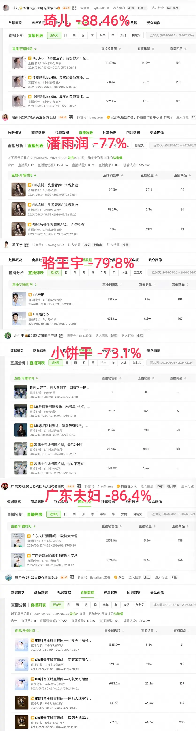 图文 | 躺姐 来源|互联网江湖 “口红经济”也崩塌了。 在宏观经济增速下降时,消费者往往倾向于选择相对廉价的非必要消费品,如口红等等,来寻求精神上的慰藉,这种消费行为的变化又被称为“口红经济”。很多投资人会以这个现象来决策经济下行周期时的投资标的,相应的商家或是平台也会向这方面倾斜,寻求更多的利润。 但在今年618,这个定律似乎失效了。 最近几天,各大平台的618活动都已经陆续开始,对于风头正劲的各个直播间来说,美妆是必争的战场。然而,不管是李佳琦还是抖音头部,大量直播间已经出现了“脚踝斩”式的崩塌。 抖音许多头部主播的表现令人大跌眼镜。 根据飞瓜数据,同样是在618首播的成绩: 抖音的广东夫妇,去年成交额4.5亿,今年6114万,同比下跌86.4%; 琦儿,去年1.11亿,今年1292.3万,跌88.46%; 潘雨润,去年2952.9万,今年674.8万,下跌77%…… 被抖音倾斜资源最多的贾乃亮,享受了最好的选品和优惠券,以及最优质的流量,但在5月21日首播,成绩是近12小时成交3.8亿,次日播9小时成交7000万,抖音几乎倾注所有资源,仍与去年广东夫妇有很大差距。 而去年的最大顶流广东夫妇,今年也无法延续成绩。今年5月26日,寄望甚高的爆发场仅卖出1.44亿,比去年峰值下降68%。 ![]() 显然,这个成绩没办法令人满意,更反映出整个美妆品类在被直播电商近几年“压榨”之下的疲态。 而一个更关键的趋势是,货架电商和直播电商之间竞争的天平,也开始出现了变化。 美妆风光不再? 今年抖音商城618于524正式开卖,但很多主播从515就开始抢跑618。至今,大部分涉及美妆的抖音头部主播都完成了首秀。小杨哥淡出,东方甄选(HK:01797)、交个朋友多平台经营,让全行业都风头不盛。 不仅是前述那些抖音美妆的王牌主播成交额出现下滑,新晋主播也后继乏力。 例如,新晋抖音美妆头部主播的呗呗兔,今年5月22日首播销售额达到1978万,超过去年大促首播;但到了5月24日,呗呗兔两场直播加起来销售额只有49.6万,25日两场更只有36.5万。 量级从千万掉到十万,呗呗兔在抖音618大促的非爆发单场成绩甚至比不上自己4月份的场均销售额114.2万,更比去年4月场均254万降低80.5%。 直播电商狂飙猛进的这几年,美妆个护这个品类在其中是有很大功劳的,可以说,双方属于双向奔赴、互相成就。 根据多个机构的测算,自2017年兴起的直播电商,已经成为整个市场最重要的卖货形式,渗透率从2018年不到2个百分点,升至2023年的30%左右;2017-2022年,直播电商市场规模的年复合增长率达到182%,是亮眼的“后起之秀”,其意义不亚于再造一个“拼多多”。 正是因为直播电商具有强互动性、强感染力等特点,天然更适合像美妆个护这样的非必要消费品类,二者结合,迸发出了强大的生命力,不仅诞生出如李佳琦这样的带货明星,也让抖音这样的内容平台快速崛起,成为不可小觑的电商新势力。 2023年双十一期间,抖音电商美妆个护的成交额达到近790亿元,在所有大类中排名第四;而根据尼尔森IQ的数据,2023年全年抖音在美妆个护品类的渠道增速高达56.6%;个护品类下的头发护理、口腔护理及皮肤护理等类别在抖音电商均实现了高速增长。 而今年,一路高歌的直播电商的美妆护肤品类,首次显现出颓势。 要知道,作为全年第一场电商大活动,特别是对于美妆个护这样的非必需品类来说,618购物节对前后几个月的消费虹吸效应是非常明显的,大促覆盖范围内的五六月份很容易就能达到上半年的顶峰;但综合来看,除了去年新崛起的主播,大部分美妆和涉及美妆护肤的泛垂类主播,不管爆发也好、平时也罢,今年总体销售额很可能是在下降的。 从宏观数据看,也确实不太好。根据国家统计局数据,今年1至4月,全国社会消费品零售总额156026亿元,同比增长4.1%,其中,化妆品类的同比增速只有2.1%,比去年同期下降了7.2个百分点;单看四月份,化妆品类甚至出现了负增长。 造成这种情况的一个首要原因,就是消费行为的变迁。可以很明显地看到,各个平台上的消费者都呈现出了这样的趋势:之前用五千档次护肤品的今年改用千元,之前用千元的今年改用百元。 所以,在商家侧,直播间里有竞争力的产品和品牌越来越少、越来越集中。昨天,公众号“聚美丽”发了一篇文章,标题说得很直接:珀莱雅(SH:603605)吃到欧莱雅掉下来的人,韩束吃到自然堂/百雀羚的人。 一方面,更加具有性价比的产品才是消费者的选择;另一方面,也是商家激烈竞争带来的必然结果。四月份,在化妆品类零售额同比下降2.7%的情况下,美妆备案新品高达81428件,环比增加了57.26%,达到近三年的新品备案数的历史最高。大量企业推出新品备战夏秋两季,让未来一段时间的产品竞争空前激烈。 于是,在整个美妆品类的两端,生产端大幅增加新品供给,新品层出不穷,竞争越来越激烈刺激;消费端,消费者越来越精打细算,消费者尽量少花钱,因一时冲动而上头下单的越来越少。而作为两端中间的带货主播,在这种状况下自然会觉得更“难”。 货架才是出路? 当然,除了美妆行业的大环境不好,今年618大量垂类带货主播成交额崩塌还有另一方面的原因,就是模式困境。这种困境不仅体现在像美妆这样竞争烈度极高的品类,其他依然保持高增长的品类迟早也会碰到。 在商品的全链路中,一个很简单的逻辑是“两点之间,直线最短”。整个价值链上参与的环节越少,消费者获得的让利越大;同理,对于生