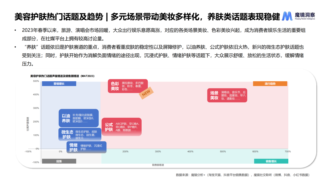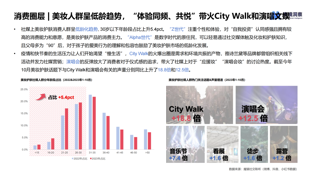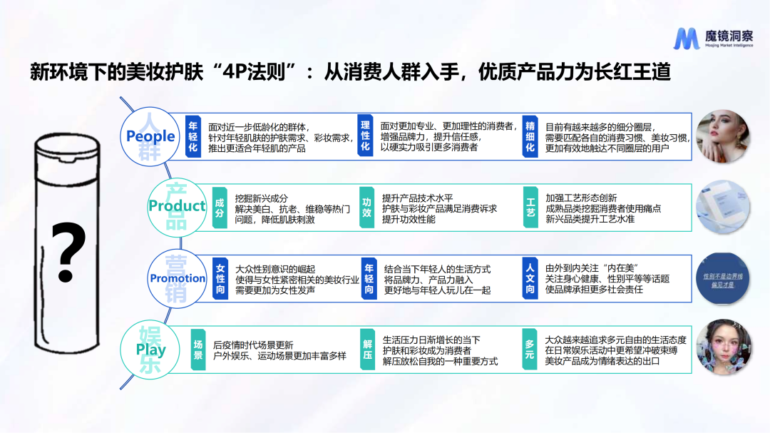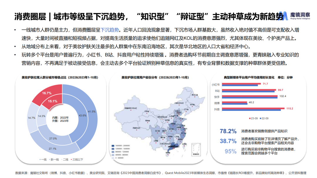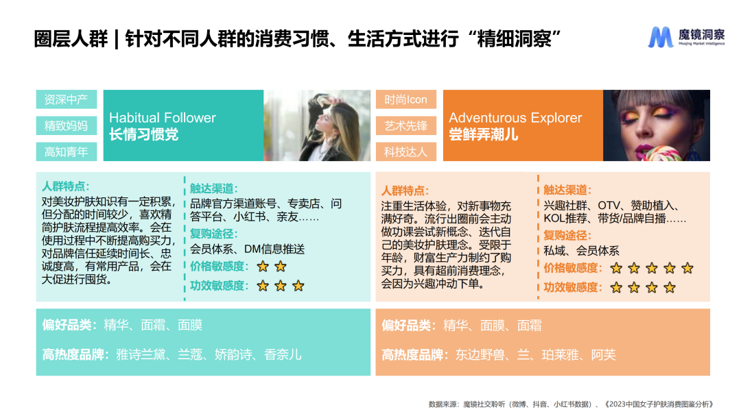 本文要点 1.美妆护肤整体市场增速放缓,“小样经济”火爆,“原生感”审美趋势带动妆前/底妆增长; 2.美妆人群呈低龄化趋势,城市等级呈下沉趋势,精致女王、大碗好用族、长情习惯党、尝鲜弄潮儿等代表人群拥有不同的消费习惯; 3.2023年春季以来,旅游、演唱会市场回暖,大众出行娱乐意愿高涨,对应的各类场景美妆、色彩美妆兴起,“养肤”仍是护肤赛道重点,“微生态护肤”兴起,护肤开始作为消解负面情绪的途径出现。 2023年中国消费者购买美妆护肤产品的主要渠道位于线上,占整体销售额的61.4%。截止到2023年10月,魔镜数据显示美容护肤和彩妆赛道线上销售额达到3174.8亿元,相比去年同期增长5.4%,整体增速放缓。同时线上社交媒体讨论声量同比增长41.8%,春季户外活动复苏需求与频发的肌肤问题相冲突,刺激社媒相关话题讨论度增长。 从渠道来看,抖音销售额实现增长,其分价格段销售额分布呈沙漏形,百元以下商品销售额323.3亿元,千元以上商品销售额348.8亿元,平台上高端市场和下沉市场兼容,主要源于抖音吸引高端品牌入驻以提升客单价的平台战略,以及许多网红主播也在向带货高端产品转型。 在消费决策周期拉长,消费者更加理性谨慎的大趋势下,”小样经济“火了,小样相比于正装产品客单价更低,降低了试错成本,有利于品牌更多地激发消费者的购买潜力。截至2023年10月,美容护肤和彩妆类体验装线上销售额分别同比大幅上涨75.6%和268.2%,社媒上相关声量分别同比上涨148.8%和86.2%。 随着宋慧乔“裸感妆”、鞠婧祎“白开水妆”火爆全网,审美趋势越来越强调“原生感”,化妆力求最大限度凸显肌肤原生质感,整体妆容更加干净利落,这场风潮不仅刺激粉底、定妆、素颜霜等底妆相关品类增长,也拉动了妆前产品的增长。 ![]() 面对增速放缓、竞争激烈的美妆护肤市场,该如何认识消费者,找寻消费新趋势? 为此,魔镜洞察基于多年消费者市场研究、产品创新方法的服务经验积累,提出新环境下美妆护肤开品“4P”法则,即从people人群需求入手,夯实product产品力,利用promotion营销和play娱乐加持。 ![]() 01人群洞察:拆解美妆消费圈层,了解当下美妆消费者 年龄分布:美妆人群呈低龄趋势,社媒上美妆护肤消费人群30岁以下年龄段占比上升5.4pct。“Z世代”注重个性和体验,对“自我投资”认同感强且拥有较高的消费能力和意愿,是美妆护肤产品的消费主力。 ![]() 城市分布:一线城市人群仍是主力,但消费圈层呈下沉趋势。近年人口回流现象显著,下沉市场人群基数大,虽然收入绝对值不高但是可支配收入增速快,大量时间被直播和短视频占据,对提高生活质量的追求使他们追随网红及KOL的消费意愿强烈,尤其体现在美妆、个护类产品上。 ![]() 针对不同人群的消费习惯、生活方式进行“精细洞察”: 精致女王:对自我形象有较高追求,美妆护肤知识丰富,看重成分、功效等使用端实际指标,护肤步骤较为繁琐、有针对性。对新鲜事物接受程度高,可支配收入高,购买力强。 大碗好用族:不太关注美妆护肤,诉求以维稳和日常为主,对于相关知识了解甚少,会习惯性购买同一产品,在有新的需求时再尝试更换。由于对品牌产品认知有限,对促销力度感知较弱。 ![]() 长情习惯党:对美妆护肤知识有一定积累,但分配的时间较少,喜欢精简护肤流程提高效率。会在使用过程中不断提高购买力,对品牌信任延续时间长、忠诚度高,有常用产品,会在大促进行囤货。 尝鲜弄潮儿:注重生活体验,对新事物充满好奇。流行出圈前会主动做功课尝试新概念、迭代自己的美妆护肤理念。受限于年龄,财富生产力制约了购买力,具有超前消费理念,会因为兴趣冲动下单。 ![]() 02话题追踪:分析社媒热门话题背后的热点以及消费趋势 2023年春季以来,旅游、演唱会市场回暖,大众出行娱乐意愿高涨对应的各类场景美妆、色彩美妆兴起,在社媒平台上引起大量讨论。 “养肤”依旧是护肤赛道的重点话题,以油养肤、公式护肤依旧火热,新兴的微生态护肤话题也受到关注;同时,护肤开始作为消解负面情绪的途径出现,沉浸式护肤、情绪护肤等话题下,大众展示舒缓、放松的生活状态。 ![]() 文章来源:“魔镜洞察”,未经允许不得转载。 文章代表作者观点,版权归原作者所有,热传平台仅提供信息存储空间服务。 |