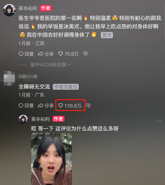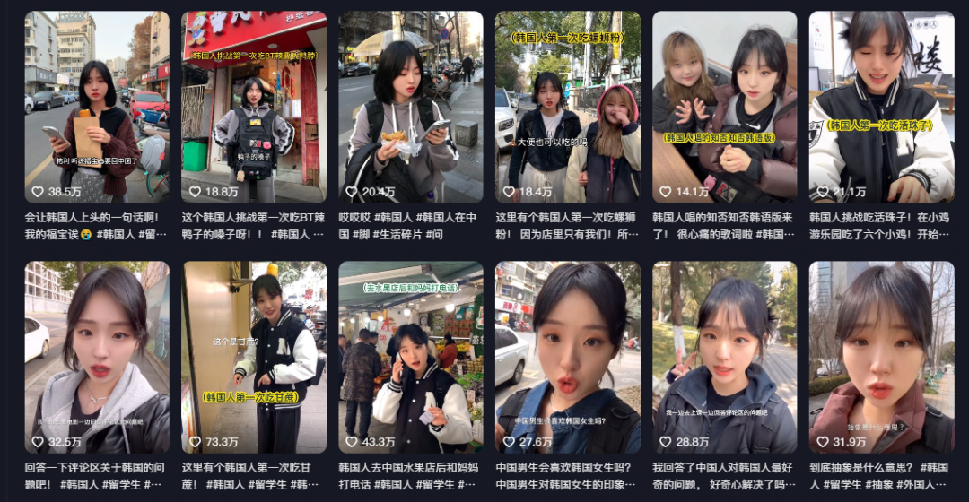 来源|新榜 作者 | Bamboo 编辑 | 小 八 鸡同鸭讲、文化冲击、呆萌可爱、搞笑美女……当这些元素出现在同一个账号里,会发生什么? “基本祐利”(下文简称祐利)给出的答案是:两个月全网涨粉超500万。 ![]() 祐利是一名在中国上学的韩国留学生,经常在生活中受到文化冲击,呆萌的表情配上“塑料”中文,催生了不少搞笑的名场面: 医生问她“平时喜欢侧着睡觉吗”,她秒变空耳大师听成“厕所睡觉”; 医生说低头她抬头,按摩师让她往后靠她往前伸; 在提供免费食物的澡堂和足疗店,她激动地表示“都是天堂”; 看到中国街边10块钱3斤的西瓜,她打电话给在韩国的妈妈表示对水果价格便宜的震惊。 ![]() 从看中医到体验中式洗澡和按摩推拿,再到第一次吃螺蛳粉、喝北京豆汁,祐利凭借“已读乱回”和“第一次体验”系列迅速走红抖音。 新榜旗下数据工具显示,“基本祐利”近两个月抖音涨粉450万,其中4月涨粉300万;其B站账号也在近两个月涨粉67万。 ![]() “基本祐利”到底是如何走红的?她的内容模式可复制吗?中韩差异为何会成为流量密码? 韩国人记录中国上学日常,两个月全网涨粉超500万 韩国人第一次看中医,到底能有多搞笑? 不久前,祐利晒出自己和中医的对话视频,除了对摸手腕就能看出身体状态感到震惊,她还用蹩脚的中文和医生上演了一出“鸡同鸭讲”的中文对话。 ![]() 她听不懂“月经”,却知道“例假”;她好像听懂了“例假多少天”的问题,却说出“30天”的答案。 ![]() 一番略显费力的问诊后,祐利又认真地问“我好的地方在哪”,没想到医生噼里啪啦说了一堆关于肠胃的问题,引得祐利不停追问“那么我正常的部分在哪”。 ![]() 截至发稿前,这条视频抖音获赞达660万,是“基本祐利”账号获赞最高的一条视频。 从看中医到体验中式按摩和洗澡,今年3月初,祐利开启各种“第一次”的挑战,记录自己在中国体验新鲜事的经历。 这些选题思路与去年“李炮儿”爆红的《玩得就是真实》系列有异曲同工之妙,往往在开头把悬念拉满,吸引用户停留。 不同的是,韩国人的身份让祐利即便做一些普通的事情,比如吃甘蔗、吃螺蛳粉和鸭脖,也能制造出极具反差和喜感的效果。 ![]() 此时,祐利的视频获赞集中在几十万,虽然账号流量迈向新的台阶,但离出圈还有一定的距离。 直到她和路人的一次对话,打开了“已读乱回”的流量密码。 3月31日,她在“第一次吃鸭血粉丝”的视频中,和一位路人叔叔闲聊了起来,祐利不断表达对小笼包和鸭血粉丝的喜爱,但路人却语速较快地表示本地人不爱吃这个。 这段“已读乱回”的名场面戳中了网友的笑点,迅速传播发酵。 ![]() 截至发稿前,该视频获赞超300万,也将“基本祐利”的账号推向涨粉高潮。目前,“基本祐利”全网粉丝超过550万,不到两个月全网涨粉超500万。 “已读乱回”笑点拉满,网友涌向评论区疯狂玩梗 走红之前,祐利已经在抖音记录了半年多的日常生活。 2023年9月30日,她发布了一条自我介绍视频,表示自己是在南京上大学的韩国留学生,想记录一下在中国的日常生活。 从上课做pre和准备考试的学习日常,到吃食堂和参加万圣节派对等生活日常,这些大学生vlog式内容获赞往往会收获几万点赞。 可爱,是她评论区中经常出现的关键词。 祐利是典型的韩国人长相,鹅蛋脸、单眼皮,柔和的五官搭配“半永久”空气刘海,围巾、大衣、针织衫、卫衣和棒球服等韩式单品出镜率较高,像极了韩剧里的女大学生。 ![]() 软萌的外表下,祐利也时常表现出韩国人的经典表情——翘起单侧嘴角外加瞪眼,如果放在韩剧角色身上,往往会飚出一句“阿西吧”的韩国国骂。 ![]() 可爱的颜值和性格让祐利吸引到第一批粉丝,完成账号从0到1的积累。新抖数据显示,“基本祐利”在4个月时间里吸粉近30万。 ![]() “这是我中国朋友的小狗。” “我很喜欢吃东西,特别是辣的。” “我的汉语水平还不那么高,所以你看我视频的时候,可能会经常发现错误,请原谅一下。” 祐利的中文水平,像小学生作文,也像中国人初学英语时的表达,简单的“主谓宾”结构夹杂书面语词汇,虽然能听懂,但从口音和语法上一下子就能听出来是外国人。 ![]() 因此,网友们拿捏了祐利中文水平的“漏洞”,纷纷涌向评论区玩梗。 有不少网友喊话祐利去“阿巴斯”的评论区学习中文。 ![]() “阿巴斯”是一名在河南的巴基斯坦人,经常在抖音晒出旅行的照片,因回复网友刁钻的留言贡献出不少笑料。 网友:阿巴斯,什么时候来北京,我骑着你去爬长城 阿巴斯:谢谢 网友:阿巴斯你知道吗,但丁真去过地狱,但丁真没去过地狱 阿巴斯:我不知道 ![]() 如今,阿巴斯“已读乱回”的衣钵传到了祐利手上。 有网友玩起文字游戏,用“我可以给你点颜色瞧瞧”的俚语忽悠祐利,祐利不负众望地没有看懂,开心地表示“谢谢”; ![]() 有网友开始出中文题,考祐利“干一行行一行一行行行行行”等绕口令的意思; ![]() 还有人展示起中文的博大精深,用乱序的文字迷惑祐利。 ![]() 甚至网友一句“全障碍无交流”的精准概括,都吸引了128万网友点赞,连祐利本人好奇为什么有这么多点赞。 ![]() 评论区之外,祐利继续一边体验中国生活,一边贡献“已读乱回”的名场面。 在体验中式按摩时,祐利和按摩师的对话令人啼笑皆非。 按摩师:拉伸能拉吗? 祐利:拉屎? 按摩师:你可以试一试。 祐利:拉屎试