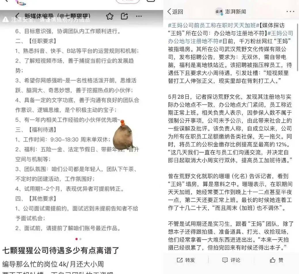 作者 | 松露、Bamboo 编辑 | 张 洁 来源|新榜 “背刺”打工人一事闹大后,“王妈”和背后MCN机构荒野文化做出了让步。 5月26日,荒野文化官方账号发布声明,否认了此前网络质疑的无社保传闻,同时对员工待遇调整做出说明: 一是取消大小周,实行双休; 二是给试用期员工缴纳社保; 三是提高员工薪资,所有员工工资不低于6000元; 四是按时结算群演薪资; 五是升级员工工作设备。 随后,“王妈”扮演者“七颗猩猩”用个人账号转发这份声明,再次为员工待遇做出解释,并在评论区积极回复网友关于公积金、试用期社保等问题。 ![]() 沸沸扬扬闹了好几天的“最强打工人嘴替”王妈背刺打工人事件,看上去终于落定。 一些围观群众或许看不懂为什么一家MCN的员工待遇问题能闹这么大、连续霸榜热搜好几天,这还是要从“王妈”这个人物说起。 王妈是系列短剧《重生之我在霸总短剧里当保姆》的核心角色,由千万粉丝网红“七颗猩猩”出演。在剧中,王妈是一个冤种打工人化身,却不愿当受气包、经常为打工人鸣不平,用一种无所畏惧的美好精神状态,吸引了不少打工人的关注和喜爱。 然而,就在前几天有网友爆料,王妈背后MCN机构荒野文化没有双休,大小周办公,一个月工资4000元,试用期不缴纳社保,需要员工自备电脑。 还有前员工在媒体采访中称:“在职时天天加班,经常工作到半夜,甚至连续工作过十几二十天,周末加班也不调休。” ![]() 高强度的连轴转工作,却薪资微薄还没有社保,与短剧中呈现的为打工人发声的形象大相径庭。 “王妈”扮演者王志欣的过往事迹也被围观,作为00后她大学期间就因拍段子月入70万,23岁就给爸爸全款买下保时捷卡宴,抖音星图显示“王妈”系列短视频上线后一条广告开价60万元,两个月广告收入已经达到960万元。 这种台前和幕后的反差,让网友们坐不住了,#王妈公司待遇#等相关话题被刷上微博热搜,不少人感慨“谁是王妈?原来我才是王妈!”,连人民日报都出面点评“王妈成了自己讽刺的模样”。 ![]() 5月29日上午微博相关热搜截图 或许是一种人设的反噬,网友们想寻求打工人的共鸣,却得到一种“背叛感”——“原来王妈不是打工人,而是资本家”,这种荒诞的对比,让大众情绪火上浇油。 “七颗猩猩”的账号流量也因此受到波及,新榜旗下抖音数据工具新抖显示,“七颗猩猩”近两日开始掉粉,终结了此前因王妈系列短剧一个月涨粉300万的强劲势头。 ![]() 从大学生博主到保姆王妈,“七颗猩猩”是如何炼成的? 王妈“塌房”的本质,是网络上讨喜打工人人设和现实中老板身份的强烈对比给“网络打工人们”带来的刺痛。 或许连“七颗猩猩”自己也没想到,从打工人嘴替“王妈”首登热搜到背刺打工人“塌房”霸屏热搜,仅仅过了不到两个月时间。 ![]() 3月初,“七颗猩猩”开始更新《重生之我在霸总短剧里当保姆》系列,她饰演的的王妈是剧中霸总男主的保姆,不仅要做脏活累活还要为男女主的“神经”行为收拾烂摊子。 从剧情勾勒出王妈的一天大致是这样的: 一大早起床拖地干活打扫卫生,做好饭后躲在楼梯间吃个盒饭,却听见男女主吵架一言不合把桌子掀了,不仅要重新做饭还要收拾地板,老板一句话就要随时随地加班,包括但不限于做四个胃口的饭菜、操办家宴、照顾孩子、应对恶毒女配和半夜陪女主淋雨; 王妈工作勤恳也爱摸鱼,偶尔偷拿主人首饰过过瘾,再偷偷还回去,只要工资到位似乎什么工作都愿意干,她和帅气同事赵管家还有一条搞笑男女的爱情线,但更多时候,两个人总是聚在一起吐槽老板。 一边“一份钱打5份工”,一边犀利吐槽,王妈仿佛千千万万个打工人的缩影,现实中敢怒不敢言的“烦死了”有王妈说,不敢骂的“颠公颠婆”有王妈骂。 因此,王妈一度被网友称为“打工人嘴替”。 新抖数据显示,凭借短剧系列,“七颗猩猩”一度单月涨粉300万。截至发稿前,《重生之我在霸总短剧里当保姆》更新了20集,累计播放超18.5亿;《重生之我在短剧里当主角》系列更新16集,累计播放超11.2亿。 ![]() 内容带来的泼天流量,也让“七颗猩猩”的广告报价水涨船高。 ![]() 星图数据显示,“七颗猩猩”20秒内视频报价为45万元,60秒内视频报价50万元,60秒以上视频报价为60万一条;其粉丝量200万的小号“王志猩”,60秒以上星图广告报价达10万元。 ![]() 据观察,目前《重生之我在霸总短剧里当保姆》和《重生之我在短剧里当主角》两个系列共更新了36集,其中有21条视频植入了品牌广告。“一猩60万”“王妈两个月广告收入或达960万”等词条也火速冲上热搜。 此外,“七颗猩猩”在带货领域也有所布局。 抖音“七颗猩猩”商品橱窗跟买人数超过5.5万人,商品销量超过6万件。新抖数据显示,其账号近一年未开启直播带货,近三个月进行了3场聊天直播,累计场观超164万。 ![]() 虽然未进军抖音直播带货,但“七颗猩猩”将直播重心放在了771万粉丝的小红书账号上。 ![]() 她曾以“王妈”和“王丫鬟”的身份分享好物,带货商品集中在美妆和零食领域。新红数据显示,“七颗猩猩”近三个月直播15场,其中10场为带货直播,场均观看人次近9万。 此外据了解,“七颗猩猩”名下还有一家名为七颗猩猩商贸中心的公司,从事服装批发等业务,在淘宝店铺销售视频中的同款服装。但据观察,“七颗猩猩的店铺”淘宝销量惨淡,销量最高的单品T恤月销仅4