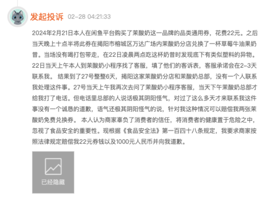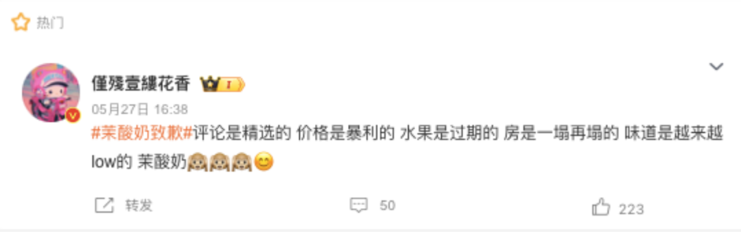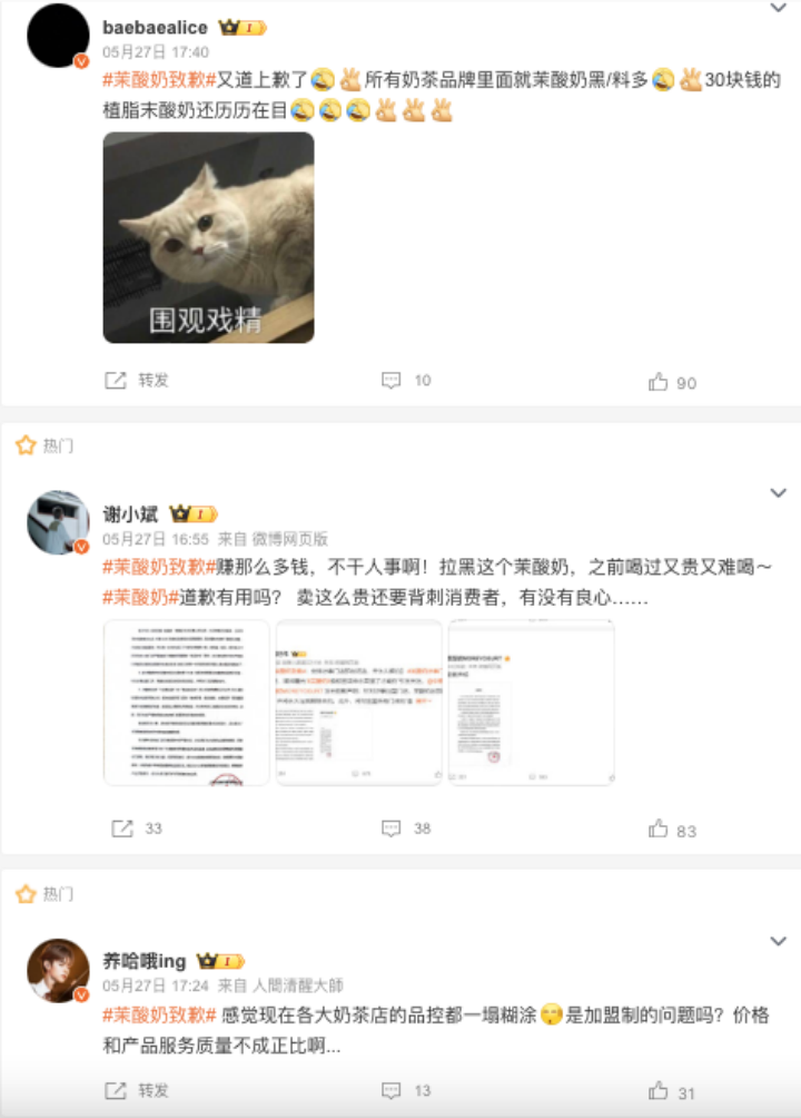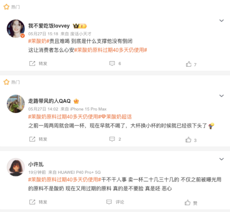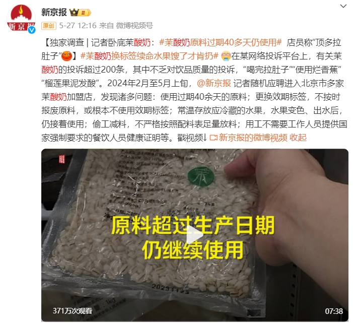 作者 | 刘钦文 编辑 | 趣解商业 曾经因为高价被称为“酸奶刺客”的茉酸奶,又“刺”了消费者一剑。5月27日,据《新京报》报道,茉酸奶原料过保质期40余天仍使用,原料废弃的标准取决于店长的嗅觉。 一经报道,该话题立刻登上微博热搜。网友纷纷评论“评论是精选的、价格是暴利的、水果是过期的、房是一塌再塌的”...... ![]() ![]() 图源:微博截图 酸奶作为新茶饮的细分赛道,在近几年热度持续飙升。但一向“用料考究”的茉酸奶,已经不是首次在食品质量上出现问题;过去一年已经出现了包括产品的植脂末争议、被上海市消保委点名质疑产品配料成分、更换效期标签等事件。 01.频上“热搜”的茉酸奶 5月27日,《新京报》发布独家调查报道《卧底茉酸奶:原料过保质期40余天仍使用,闻出馊味才放弃》称,茉酸奶在北京市的多家加盟店存在诸多问题,包括:使用过期40余天的原料;更换效期标签,不按时报废原料,或根本不使用效期标签;常温存放应冷藏的水果,水果变色、出水后,仍接着使用等问题。 ![]() 图源:新京报微博截图 当天下午,茉酸奶品牌运营主体公司上海伯邑餐饮管理有限公司立即作出回应,并发布致歉声明,表示媒体报道所涉及的4家门店严重违背了茉酸奶所提倡的“食品安全”理念,在日常运营中均未严格执行茉酸奶总部的运营操作和培训标准,公司已第一时间即刻进行整改并将永久与其解除合约。 ![]() 图源:茉酸奶微博截图 在其道歉微博下,有网友评论“相信只是个例”“员工培训要到位”等内容;但值得注意的是,若是用户想要对该微博进行评价,则显示“审核评论中,仅自己可见”。 ![]() 图源:微博截图 相比之下,“茉酸奶”“茉酸奶致歉”等相关微博话题下的内容则是另一个画风。“卖这么贵还要背刺消费者”“一杯小小的奶茶都这么多幺蛾子,没被曝的不敢想还有什么?”“上次是植脂末,这次是馊了的水果,下次是啥? ” ![]() 图源:微博截图 茉酸奶"过期食材事件"被曝光后,监管部门也迅速跟进。5月27日晚间,北京市朝阳区市场监管局针对“原料过期”涉及的茉酸奶伊藤洋华堂店立案调查,并对辖区其余20家茉酸奶门店开展全覆盖执法检查工作。 ![]() 图源:北京朝阳市场监管公众号 5月28日,北京市石景山市场监管局通报茉酸奶(北京石景山万达店)存在食品安全问题,确认了媒体曝光的使用过期原料等违法行为,并表示将对相关问题进行立案处理,涉事门店暂停营业。 ![]() 图源:石景山市场监管公众号截图 除了此次被曝食材过期问题外,就在两个月前,2024年3月13日,茉酸奶还因芒果酸奶奶昔的脂肪含量异常高而被上海市消保委点名。 ![]() 图源:上海市消保委公众号截图 据上海市消保委检测发现,茉酸奶的芒果酸奶奶昔用的酸奶量并不多;但脂肪含量却高得很奇怪,是蛋白质含量的3.25倍,是乳糖含量的2.77倍。“这些多出来的脂肪一定不是酸奶里的,也不会是芒果里的。那就需要茉酸奶跟消费者说明一下,在芒果酸奶奶昔加了啥?” 上海市消保委认为,“现场制售食品由于没有明示的产品配料表,消费者只能通过品牌方的宣传来了解和选择产品。因此,品牌方有责任提供真实、准确的产品信息。” 当日晚间,茉酸奶回应媒体时表示,“其主要原料为酸奶、芒果和基底/100%牧场牛乳(消费者可二选一),其中基底主要成分为进口乳粉。‘芒果酸奶奶昔’中的脂肪主要来源于酸奶和基底,糖分主要来源于芒果,酸奶和基底,不含有任何人造反式脂肪酸,也未添加植脂末,所有原料完全符合国家相关标准”。 不过有消费者评论称,“恶心不是在植脂末,而是打着健康,黄金奶源之类的(名义),让一堆为了喝酸奶减肥的女生喝的却是冰淇淋原液。” ![]() 图源:微博截图 此外,早在2023年7月,有网友晒出茉酸奶部分产品使用了一款名为“上野曼道牌雪糕”的原料,该款雪糕的配料包含“葡萄糖浆、精炼植物油、乳清粉”等。 这一消息立即在网络上引起了广泛讨论。因为精炼植物油就是氢化植物油,即植脂末,植脂末作为替代天然奶油的低成本原料,被广泛应用于很多奶制品当中,是一种合法的食物添加剂;但因可能含有反式脂肪酸,长期摄入对人体健康不利,因此用量有一定限制。 “植脂末风波”使得茉酸奶陷入争议。至今,对于“是否使用植脂末”这一点,茉酸奶始终未正面承认或否认,仅表示,“我们的配料和产品符合有关国家规定。” ![]() 图源:罐头图库 2023年8月4日,茉酸奶发布声明,宣布自8月1日起,茉酸奶全国门店的所有酸奶奶昔产品将升级使用全新版本奶基底。新版本奶基底无植脂末、无氢化工艺、无人造反式脂肪酸,并强调这是对消费者健康负责的举措。 不到一年时间,茉酸奶就发生三起食材相关问题。“茉酸奶作为一个高端酸奶品牌,整体的品牌力、美誉度还是不错的,在消费者的心中,它的品质应该是比较靠谱或者说是有保障的。这些食品安全事件,对于茉酸奶的整体影响还是比较大的;其重度消费人群,信任度肯定会下降,对其整体销量也会有影响。”中国食品产业分析师朱丹蓬表示。 02.加盟商“上位”成实控人? 近年来,茉酸奶以其独特的口感与营销策略,在竞争激烈的酸奶市场中异军突起,收获了大量忠实客户。 据“趣解商业”了解,茉酸奶成立于2014年,创始人赵伯华最初在上海临港开出了第一家门店,之后陆续在上海其他区域开出了多家直营店。茉酸