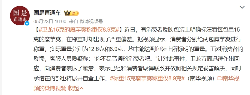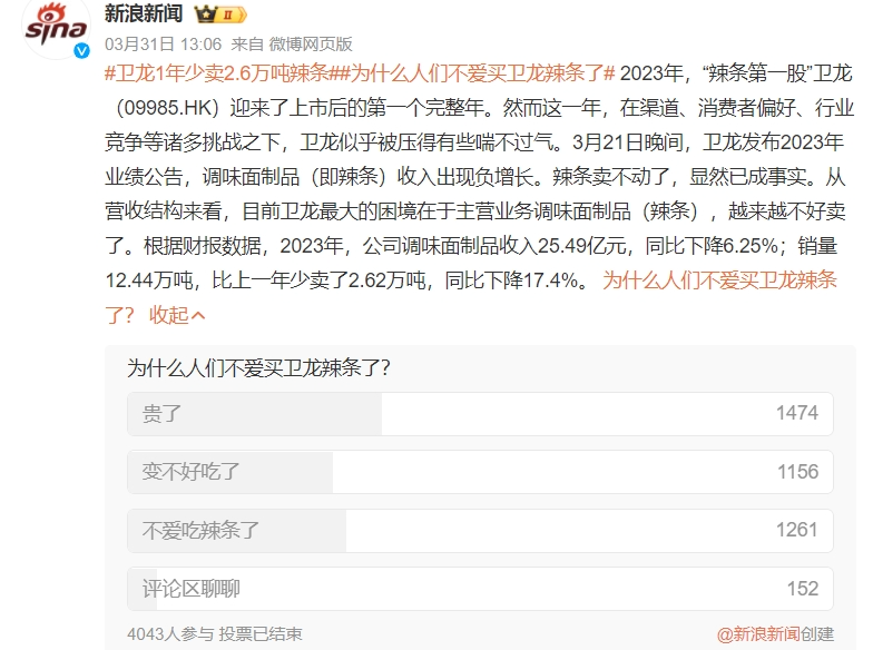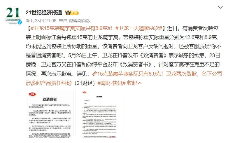 作者 | 于婞 编辑 | 趣解商业 净含量标着15克的卫龙魔芋爽,实际重量只有8.9克?近日,抖音网友“燕子哥”的一条视频把卫龙美味(9985.HK)的产品质量问题推上了“热搜”。 网友在视频评论区纷纷表示,“15克本来就少你还给我少5克”、“我对卫龙心连心,卫龙对我动脑筋”...... 5月23日,卫龙一天内道歉两次,表示问题正在解决,欢迎消费者监督,同时邀请当事用户担任品牌质量监管大使,未来也将加强持续优化生产管理体系。 ![]() 图源:微博截图 卫龙还表示,作为行业头部企业,卫龙不辩解、不推脱,将主动配合调查并向公众公示调查结果。 01.卫龙错在哪了? 站在此次风暴中心的“魔芋爽”,是卫龙当前的热门单品,也是卫龙在辣条之外着力打造的第二增长曲线。 魔芋凭借“低脂、饱腹”等标签,踩上了健康饮食的风口;卫龙敏锐的抓住了这一风向,自2014年起就率先上市了魔芋爽产品。 如今盐津铺子(002847.SZ)、良品铺子(603719.SH)、百草味等不少零食品牌也在卖魔芋产品;但凭借先发优势,卫龙魔芋爽在同品类中的心智渗透率高达78%(来源:“里斯咨询”数据),远超其他品牌。 对于卫龙公司自身来说,魔芋爽在公司营收中的占比也越来越高。据卫龙年报数据显示,2023年,包括魔芋爽在内的蔬菜制品实现营收21.19亿元,同比增长25.11%,占公司总收入百分比由上年度同期的36.6%增至43.5%,可以说是与包括辣条在内的调味面制品品类并驾齐驱。 ![]() 图源:卫龙美味2023年报截图 据“趣解商业”了解,卫龙为了实现生产效率最大化及拓展产品组合,采用了自有工厂与OEM代工相结合的生产方式;但魔芋爽作为公司的“拳头产品”,是由卫龙的魔芋工厂专门生产,并非代工生产。 作为“国民品牌”,卫龙理应有一套完备的工业生产流程体系和相应的质检筛查机制;卫龙有必要认真核查是哪一步出了问题,让有问题的产品流入了市场。 自有工厂专门生产还能“翻车”,中国食品产业分析师朱丹蓬认为,“这还是卫龙的质量内控体系出现了一些纰漏;这些纰漏其实跟老板的经营理念、高管的重视度、以及在整个生产的过程中品控的疏忽,有非常大的关系。” 此外,面对投诉时,卫龙客服质疑称“你不是普通的消费者吧”,也不禁让人“心寒”。 ![]() 图源:微博截图 艾媒咨询CEO兼首席分析师张毅也表示,此次事件暴露了卫龙在整体的内部运营方面是出了问题的。 年报数据显示,2023年卫龙管理费用为4.59亿元,同比下滑4.7%;而经销及销售费用大涨27.4%,为8.07亿元。经销及销售费用占总收入的比例也由上年度的13.7%上升至16.6%;其中,用于推广及广告的费用为2.14亿元,较上年度的1.39亿元增加了53.6%。 也就是说,从经营层面,卫龙在营销方面的投入越来越多。 卫龙在发展的过程中确实从营销上尝到了不少甜头,其极具网感的营销手法,如借鉴微商梗、小广告风、非主流QQ空间风、游戏风等热门广告元素,让品牌在一众辣条企业中脱颖而出,俘获了不少年轻人的芳心。 然而近期卫龙魔芋爽的电梯广告却因为“15秒22个低”太吵被网友吐槽称“这是一条让打工人发疯的电梯广告”,还有网友直呼卫龙广告“扰民”。卫龙官方对此回复表示“会尽快做出调整。” ![]() 图源:小红书截图 同时,卫龙还主打“新国货”和“情怀营销”。这些营销方式在平时或许能获取不少关注,但一旦出现问题,也可能面临大众情绪和网络流量的“反噬”。 卫龙需要反思,公司如今的经营存在哪些问题? 02.“辣条”还卖得动吗? 作为“辣条一哥”,卫龙可以说是一代人的“童年回忆”;在上市前,卫龙业绩稳定上涨,也一度成为资本眼中的“香饽饽”。 2021年5月,成立20多年的卫龙首次公开进行Pre-IPO轮融资;投资者名单明星云集,包含高瓴、腾讯、红杉等一线投资机构。 ![]() 图源:天眼查截图 据卫龙美味《招股书》数据显示,卫龙合计拿到了融资6.59亿美元(约合人民币47.75亿元);其中,CPE源峰(中信产业基金)投资2.18亿美元,高瓴投资1.1亿美元,腾讯、云锋基金分别投资6000万美元,红杉中国、Duckling Fund、厚生投资分别投资2700万美元,海松资本投资2000万美元,上海泓漯认购1.1亿美元。 ![]() 图源:卫龙美味《招股书》截图 按照当时的预期,卫龙的投后估值达到了94亿美元,超过600亿元人民币。不曾想,收获首轮融资当年,“新消费”的热度开始减退,卫龙的业绩增速也开始下滑。 2021年,公司实现营收48.2亿元,但净利润只有8.27亿元,与上一年基本持平;2022年,卫龙净利润跌了近8成,只有1.51亿元。 ![]() 数据来源:wind 与此同时,卫龙的上市之路也出现卡顿。自2021年5月首次递表港交所,卫龙共递表港交所3次、2次通过聆讯;一直到2022年12月15日才在港交所上市,成为“辣条第一股”。 不过上市当天即“破发”,当天报收10.02港元/股,跌5.11%,市值236亿港元,较此前估值顶峰缩水近六成;截至5月29日,报收5.69港元/股,总市值133.8亿港元,较上市时市值近乎“腰斩”。 ![]() 图源:东方财富截图 这也意味着,以600亿元估值认购的高瓴、红杉、腾讯、云锋等资本大佬们,投资都亏损了;即便是IPO期间进入的投资机构,也都处于浮亏状态。 不过机构股东在卫龙的持股比例只有5.7%;截至2023年末,卫龙创始人刘卫平实控的和和全球资本有限公司,持有卫龙美味19.04亿股,持股比例80.99%;其中实际控制人刘卫平拥有卫龙80.99%的表决权。 ![]() 图源:企查查截图 市值缩水的背后是辣条业务增长乏