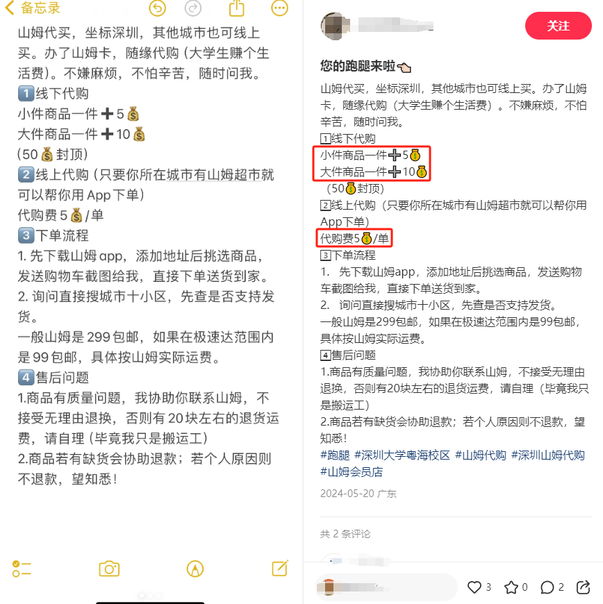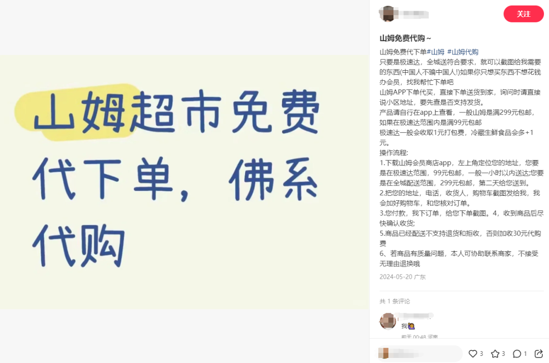 作者 | Hiu 编排 | 日尧 审核 | 日尧 来源 | 互联网品牌官 月薪两万,买不起一切! 前段时间,话题#月薪两万不敢在商场买衣服#猝不及防冲上了微博热搜第一位。 ![]() ▲ 图源:微博 这让与两万月薪还隔着十万八千里的我,在透心凉之余又如打翻了五味瓶子,直到看见“我在山姆做代购,月入10w+”这条消息,悬着死了的心又活过来了。 难道说:原来打工不是唯一的出路,代购山姆可以走上致富之路!? “山姆热”吹到了县城 山姆代购们的效率有多高? 听说有些城市的山姆门店还没建设好,当地的代购群就已经建好了。 “东西跟不要钱似的,整箱整箱地往购物车里搬,甚至一个人连推好几辆车结账。”这是山姆会员偶尔会在山姆门店看到的场景。 ![]() ▲ 图源:小红书 不用怀疑,他们就是山姆代购,而且全都是专业的、职业的。 在完成采购后,他们会往城市边缘开,驶向三四线县城,那是山姆官方尚未涉足的领土。 县城消费者的购买力,不容小觑。 今年五一假期返乡的张倩,在做客住在县城高档小区的大表姐家时发现,她家里的山姆产品浓度颇高。客厅摆放着山姆抽纸与零食,双开门冰箱里面冷藏着山姆网红的瑞士卷、小青柠、椰子风味发酵乳,不出意外,冷冻室还有山姆原切牛排和冻蓝莓。 某位代购道出了真相:山姆之所以得到“县城中产”的追捧,是因为他们有钱没地方花。 我认为这只是其一,而另一个最重要的原因是,“县城中产”也想得到山姆承诺的「为菁英生活提供高品质商品」。 ![]() ▲ 图源:小红书 互联网磨平了城市之间的信息差。 目前仅在一二线城市开店的“网红超市”山姆,没想到自己吹捧起来的这股中产热风最终还是刮到了三四线城市,而且比一线城市刮得更为猛烈。 前几年,代购还没发展成成熟产业链时,为了代购山姆的爆款单品,有人甚至愿意加价几十元。 至于为什么愿意“无条件”相信山姆,消费者给出了自己的理由——山姆的档次看上去就不一样。 也有人认为是山姆“品质佳”的标签深入人心。 即便山姆货架上的某些商品,如车厘子、蒙牛鲜牛奶、维达纸巾等,其他超市都有售卖而且还是来自同一家供应商,但山姆家的更能受到消费者的追捧。 “山姆品质确实好,虽然说不上来具体好在哪里”——这大概就是山姆致力于为中产阶级塑造“有品质”生活的最大的成功之处吧。 也有明白人给出了另一番解读,指出在山姆的网红表象之下,代表的是另一种追求“不提价但升级”的生活方式。 如某书平台上,山姆已经与“穷鬼”一词碰撞出了灿烂的花火。 17.9元足足2L的蒙牛鲜牛奶、19.9元一盒30枚重1.59kg的山姆精选鲜鸡蛋、23.8元一袋7个的贝果(三种口味可选)、59.8元16片装的瑞士卷、49.9元24包的经典压花纸面巾、79元1.5kg的山姆衣物留香珠…… ![]() ▲ 图源:山姆会员商店小程序 并不是说价格有多便宜,而是能在品质与价格之间达到某种平衡,让你在掏钱包的那一刻真实地体验到“质价比”。 山姆代购,月入十万? 这个数字确实具备很大的诱惑力,但要想赚到这么庞大的数字,同时也具备不少的阻力。 首先,前期肯定像做生意一样,先积累自己的目标客户群。 在代购行业,最常见的就是拉群,主要通过某书等公域流量寻找目标,进而转化为某信上的私域流量。 ![]() ▲ 图源:小红书 在全国,它们有一个高度一致的名称——山姆代购群。 凑够人头后,接下来就到了重头戏,怎么赚钱? 《互联网品牌官》了解到,山姆代购的盈利途径一共有以下几种: 一种是比较“傻瓜式”的,线下带人进门店结账,收费5元/次。也就是说的卖次卡,在网上也很常见,价格从3元到9.9元,一般不超过10元。 一种是通过线下跑腿代购,或是直接在山姆会员商店App选择线上下单,每件商品收取相应的代购费,从只加一两块钱到收取商品价格的10%不等。 ![]() ▲ 图源:小红书 不过随着越来越多的代购涌入,竞争变得更为激烈,有些直接在线上下单的已经不收取代购费了,或者每单只收几块钱。 除了收取代购费,赚取积分是代购另一条获利途径。 山姆会员卡一共分两档,有260元的普通会员卡和680元的卓越会员卡。 持有卓越卡的会员能享受到更多的福利与优惠,其中最重要的一项就是拥有2%积分返利权益,每张卡每个月最高返利500元。 换而言之,当月消费满25000元,次月将获得500元的现金券,可以直接抵扣消费金额。 ![]() ▲ 图源:小红书 此外,卓越卡还有一个重磅福利,每一个季度符合山姆消费规定的消费者,都有一次抽签获得2瓶飞天茅台原价购买权的机会。 一些代购大户手头上持有数十上百张卓越卡,每个月光是金额返现都不是一笔小数目。 再者,作为消费大户,他们比普通消费者有着更高的茅台中签概率。两瓶单价1499元飞天茅台,转手又是一笔可观的收入。 这么看来,月入十万,好像貌似有点点easy。 但实则不然,前期的客户积累需要很高的沉没成本,业务做起来之后,还要同时兼顾引流、运营、售后等系列工作。 确保代购体系能正常运转,需要稳定的客流和足够多的订单量。 否则,传闻中的月入十万,不过是纸上谈兵、空中楼阁。 在东莞跟女朋友一起做代购的小金,几乎全职做山姆代购,生意最好的时候一个月的订单额超10万,但即使有这般业绩月入过万依旧困难。 被挤爆的山姆,正成为香港人的购物天堂 山姆是一家很神奇的超市,因为不仅深受一二线居民的喜爱,也能俘获县城里七大姑八大