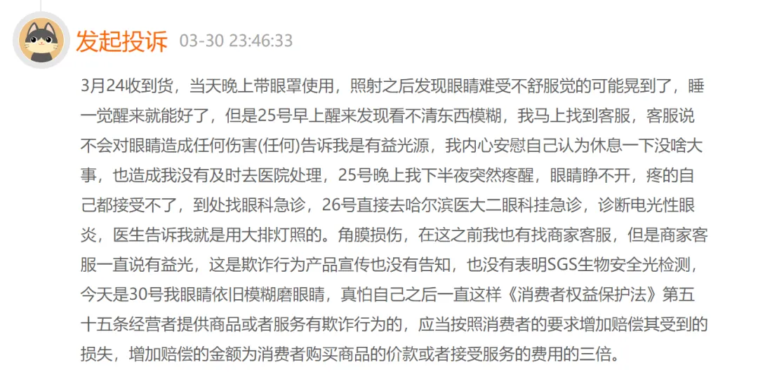 来源:翟菜花 随着颜值经济的火爆和医美普及度的提高,近年来,国内家用美容仪赛道愈发受到关注。 在此背景下,大量国际美容仪品牌相继进入中国市场,不少国内美容仪品牌也异军突起,结合强势的营销举措,赢得不少消费者的青睐。 然而,家用美容仪销售火爆背后,却是市场乱象丛生、产品虚假宣传频发、质量问题屡屡发生的真实现状。 一直以来,如何规范美容仪市场发展、整治美容仪市场乱象都是市场监管和消费者十分关注的问题,很多品牌和知名主播都曾在美容仪产品上翻过车。类似“几千元美容仪变‘毁容仪’”的新闻,更是成为美容仪赛道乱象的注脚。 近日,恰逢618大促之前轰轰烈烈的品牌蓄水期,又有一家知名美容仪品牌陷入了“伤眼”的争议。有意思的是,在众多消费者投诉、媒体关注之后,品牌方“SEAYEO昔又”坚决宣称“此类报道属于严重不实”,还将此事件引向“谣言”、“恶意发布”、“商战”的方向。 那么,消费者该信谁?SEAYEO昔又美容仪又是否真的存在产品隐患呢? 01、昔又“大排灯”伤眼投诉引发关注 5月24日,国内美容仪器知名品牌SEAYEO昔又被某自媒体曝出旗下产品PRO蓝光表现不合格,为RG2中危害级别。该消息一经传播,迅速在抖音、小红书等社媒引起热议,引发不少消费者对于产品安全性的担忧。 各类报道源自于媒体对黑猫投诉上的一则消费者投诉的关注。 3月30日,一位消费者在黑猫投诉平台上投诉称:3月24日收到SEAYEO昔又大排灯,当天晚上戴眼罩使用,照射后发现“眼睛难受不舒服,觉得可能晃到了,睡一觉醒来就能好了”。但是3月25日早上醒来却发现眼睛看不清东西,该消费者联系客服,对方称(产品)不会对眼睛造成任何伤害,并告诉消费者(大排灯的灯)是有益光源。 ![]() 但在联系客服的当晚,该名消费者就在半夜被疼醒,“眼睛睁不开,到处找急诊科”。3月26日,消费者在哈尔滨医科大学附属二院眼科就医时,被诊断为“电光性眼炎”。根据医生的说法,“是大排灯造成的角膜损伤”。 如果说“电光性眼炎”、“角膜受损”这样的个例尚且还无法让产品问题受到广泛关注,那么随后而来的国际权威检测机构SGS的一则检测报告,直接让SEAYEO昔又大排灯成为众矢之的。 媒体曝出的SGS检测报告显示,昔又大排灯产品“蓝光表现不合格,为RG2属于中危害组别,使用该产品0.25s以上会产生视网膜蓝光危害及视网膜热危害”。 ![]() 与此同时,在小红书、抖音等社交媒体上,同样也存在着关于SEAYEO昔又大排灯伤害视网膜、致使视力下降的网友反馈。 比如在小红书上,有消费者投诉SEAYEO昔又大排灯存在“让近视度数加重”、“光太刺眼”、“用完不舒服”等问题,即使戴上了护目镜,照完光依然会感受到眼睛干涩。 ![]() 值得注意的是,随着媒体的关注,似乎正有越来越多的产品负面反馈案例开始涌现。 ![]() 而对于诸多关于“大排灯伤眼”的情况,SEAYEO昔又方面在官微回应表示,佩戴护目镜使用不会对眼睛产生任何影响,属于“无危险等级”。 同时,昔又方面认为,问题是消费者未正确使用产品所导致。“SEAYEO昔又大排灯产品均配有提示及详细的使用说明书,在使用SEAYEO昔又大排灯M3模式时,都明确要求必须佩戴护目镜使用,且配赠护目镜均有测试报告,可过滤95%的蓝光,故佩戴后使用不会对眼睛产生任何影响。”昔又澄清声明中写道。 02、真相扑朔迷离,仍有关键问题待解 尽管深陷舆论风波,但通过SEAYEO昔又方面发布的声明与反馈能够看出,品牌方并不认可网络上对于产品的质疑。 据媒体报道,在事件引发关注后,针对关键的SGS检测报告“不合格”说法,SEAYEO昔又第一时间将样品Pro送到了SGS检测中心进行复检。令人奇怪的是,在这份SGS检测报告中,显示SEAYEO大排灯PRO全部蓝光模式的表现为合格,属于无危险类,同时对视网膜部分也显示为通过检测。 ![]() 一样的SGS的报告,怎么会出现不同的结果? 据SEAYEO昔又技术负责人介绍,出现这种现象的原因是媒体报道中所使用的检测报告的检测方式是错误的。其报告的检测方式是直接裸眼测试蓝光,而实际上不管是Pro款还是经典款,使用或检测中都需要佩戴护目镜或者闭眼,这一点在产品及说明书上都有提示,佩戴护目镜以后则不存在对眼睛的伤害。 能够看到,SEAYEO昔又其实第一时间针对网络上的质疑给出了有力的澄清。客观来看,此次昔又“大排灯”伤眼事件中,最大的问题点在于检测报告中的问题。 或许也正是因为对产品检测的底气,SEAYEO昔又才声称“此类报道属于严重不实,在此期间(618大促)发布如此不属实信息并大量传播谣言,不排除被恶意发布的嫌疑”。甚至,5月28日,SEAYEO昔又还在其小红书账号表示,“没错,这就是商战”,并在内容中提及竞品品牌“极萌”,直指极萌“涉嫌编造、恶意竞争”。 ![]() 但同时也需要指出的是,SEAYEO昔又目前并不能完全扫清市场疑虑,因为品牌方目前仍有关键问题待解。 虽然检验合格,并且指出是消费者使用方式错误才导致的问题,但回顾媒体报道出来的各类消费者投诉,有不少伤眼质疑就是在消费者按要求佩戴护目镜的情况下出现的。在这种情况下,把问题全部抛给消费者使用错误,显然值得商榷。 而且,在各类公开回应里,SEAYEO昔又方面一直并未就消费者在黑猫投诉上反馈的“昔又大排灯灼伤眼睛不予处理”一事进行直接回应。也就是说,到底为何消费者在按要求使用产