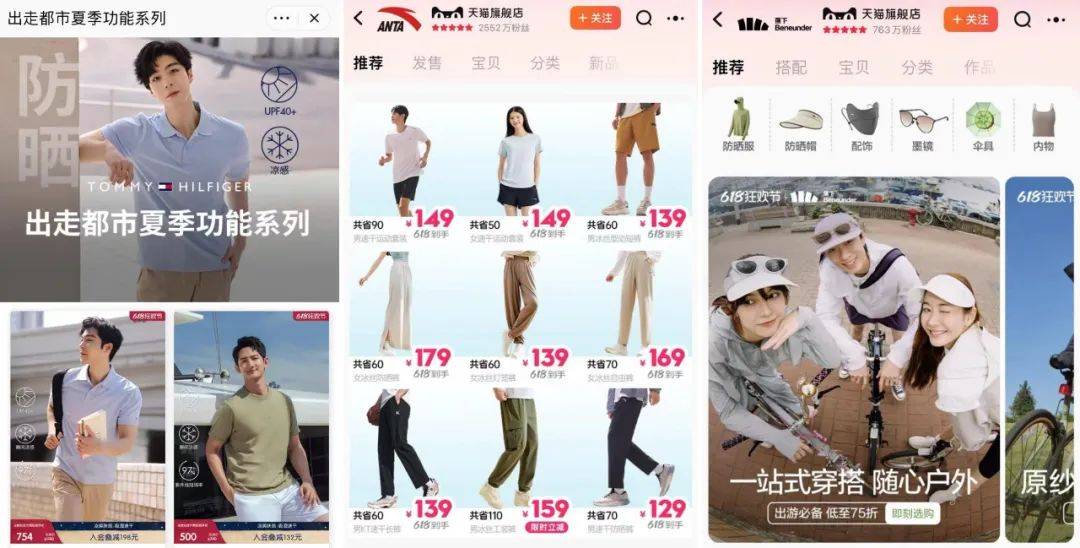 来源|深响 作者|吴鸿键 凉感、速干、导湿、防晒、UPF50+……今年夏天,这些关键词席卷了整个服装行业,回荡在各个品牌的直播间。 夏装轻薄多样、更新频繁,向来是服装行业的风向标。去年此时,我们关注到「防晒」概念渗透到各个品牌和人群,「防晒服」成为最热单品,品牌纷纷基于户外场景进行营销。今年,「防晒」热潮不仅愈演愈烈,还演化出了新的现象。 防晒服赛道激战依旧。你会看到各个品牌都把自家的防晒服放在线下门店、线上店铺显眼位置,并配合直播间重点讲解。与此同时,它们也在常规款式上大讲「功能」,例如: 优衣库把凉感高弹的AIRism面料用到了连衣裙、背心、T恤、Polo衫、短裤等产品上;海澜之家、森马、七匹狼都在突出T恤、Polo衫、裤子的“凉感”科技;Tommy Hilfiger上线了“出走都市夏季功能系列”,旗下产品主打防晒凉感和吸湿速干。 安踏618的主卖品有速干套装、防晒裤;安德玛的直播间爆款是速干衣;蕉下上线了全身防晒穿搭。有的品牌甚至直接将“buff叠满”,一件衣服“冰丝轻薄透气速干防晒”特性一应俱全。 简而言之,无论是大众品牌还是专业户外品牌、运动品牌,如今都把「功能」作为产品标配。服装行业的每一次涌动,都是消费市场深层变化的具象表现,我们从已有的变化中,得出以下三个观察。 ![]() Tommy Hilfiger、安踏和蕉下的功能性产品,截图来源:各品牌天猫旗舰店 「功能」,一个自我说服的理由 从消费者视角看,「功能」是说服自己购物的理由——两件T恤,一样都是200块,一件有凉感和速干,另一件没有,那么前者看起来就更划算。还有,当消费者在“家里已经有不少T恤和裤子了,到底要不要再买一件”的思考中纠结时,「功能」就扮演了“推一把”的角色。 这样微妙的消费心理,和大环境的变化有关。 “平价高质”是今天消费市场最大的确定性,为此,电商平台对内优化机制、对外比拼“价格力”,品牌则要竭力在降价折扣、品牌调性、经营增长等事项中找平衡。一般来说,品牌有两种路径可以走: