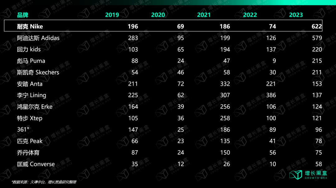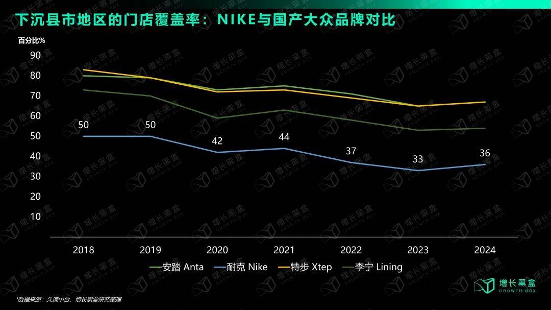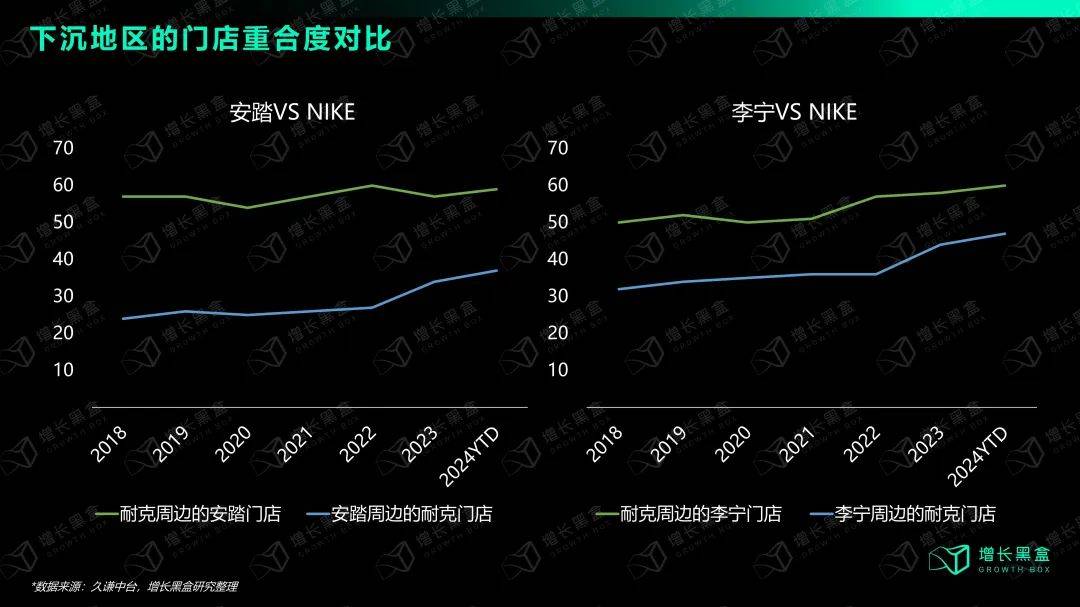 增长黑盒对耐克全国门店数据进行了分析,并对比了其它头部国货品牌。 前文已经提到,从门店数量来看,其下沉县市覆盖率为36%,远低于其它品牌;从门店分布占比来看,耐克在下沉地区门店数量占比自身总门店数量的20%,低于安踏李宁 - 然而,这种差距正在逐年缩小。 ![]() 除此之外,增长黑盒也将耐克与国货品牌的第一梯队品牌安踏的门店重合度进行了对比。在下沉地区,10家耐克门店周边一公里可能有6家安踏门店,但10家安踏门店周边一公里可能只有4家耐克门店,二者差值明显,也就是说安踏侵占的耐克的地盘,远比耐克侵占安踏的地盘的比例要高。 ![]() 以此方法对比李宁,我们发现虽然差值比安踏要小,但基本与安踏保持一致:10家耐克门店周边一公里可能有6家李宁,但10家李宁门店周边的一公里只有5家耐克。 为什么会出现上述差值呢?我们推测主要还是此前耐克的主动为之,即在开店的时候主动选址更好的位置 - 但这些高端地段在下沉地区的空间有限。从门店类型分布来看,耐克门店有30%集中在商场,显著高于其它品牌。不过从近年来的数据可以看到,这个比例正在回落,耐克的门店分布也在变广。 ![]() 2023年,耐克在下沉地区开新店的数量位居全国第一,远超竞争对手。其新开店数量比安踏、李宁、特步加起来还要高一倍。 ![]() 从开店总数占比来看,耐克在2023年下沉地区开的新店占比总新店数的52%,2024年四月更是达到了60%。也就是说耐克最近扩张的主战场都在下沉市场。 ![]() 在耐克DTC官方经验的加持下,经销商未来的下沉并不是难事。与大众国货相比,耐克虽然下沉覆盖率落后,但因品牌力领先,无论是店效还是坪效都远超国货品牌 - 耐克全方位覆盖下沉市场或许只是时间问题。 ![]() 得益于经销商+直营的双重布局,耐克在下沉市场追赶了国产大众品牌的进度,这个时间差,便是耐克未来的增量空间。 6.结语 通过对耐克DTC战略的分析,我们看到了其对冲DTC风险的巧妙之处在于:
