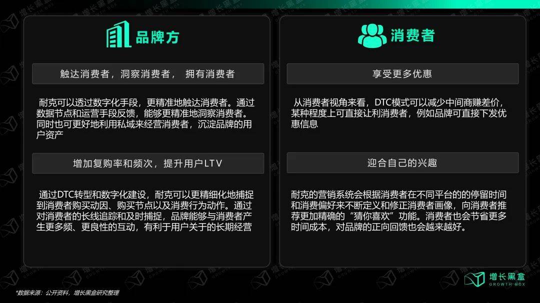调研发现,DTC战略目前依然是集团内部最优先的战略等级。为了提振业绩,耐克更需要通过推广已经跑通了DTC模式的经验赋能经销商,以此来覆盖更大的市场。开头提及的CEO和CFO的相关言论也是向经销商释放此种信号。 只能说之前大家把耐克的DTC模式吹的太过了。理性看待的话,DTC本身提供的增长驱动力只是一部分而已,必然也存在高速发展的时间窗口期。由此作为杠杆去撬动传统的经销商体系,才是我们当前应该关注耐克的地方。 2.耐克的“连环局” 2017年,耐克的品牌总监Trevor Edward公开表示:耐克的零售实在太过平庸了("undifferentiated, mediocre retail won't survive.")[4]。由此,DTC改革正式拉开序幕。 这句话其实非常“凡尔赛”,当年耐克的营收高达300亿美金,稳稳占着全球鞋服第一的宝座。风头正盛却要自我革新,可见其对于DTC战略的坚定。 然而,在短短几年内耐克就从CDO阶段聚焦自身直营业务、削减经销商,跨越至CDA阶段重启与经销商的合作。 这种战略摇摆受到了媒体诟病,从而延伸出第二个问题:如果DTC的路线没走错,干嘛要变回去呢?这不是等于亲口承认自己DTC战略失败了? 我们发现,耐克对经销商的变脸,与象棋的经典战术“先弃后取”几乎一致:先弃掉己方某子,再通过变局谋回失子劣势,或夺回一子、或取得攻势。 耐克之所以在2017年选择allin DTC模式、将经销商作为“弃子”,动机可以从三个层面来理解: 首先,DTC模式能够为品牌方提供一手的用户数据、用户洞察,实现用户资产积累来反哺业务效率。 这基本都是正确的废话,耐克想得到,其他人也想得到,并不存在什么信息差(如果你实在想看,我们也认真的总结在下面了)。 ![]() 其次,更关键的是生意增长的逻辑。 耐克转型DTC,究其根本还是因过度依赖经销商,导致了巨头生意的不可控性以及利润受到大幅挤压。 早在2012年耐克的DTC渠道业务只占其整体营收的12%,经销商渠道业务占88%,后者处于绝对的主导地位。但就因为这种过度依赖,耐克历史上出现过不少“城门失火,殃及池鱼”惨痛教训。 近十年随着美国零售业的日渐萧条,动辄就有经销商破产新闻。例如耐克美国最大的经销商之一Sports Authority于2016年申请破产导致耐克的4800万美元应收账款瞬间成为坏账。[5] 无独有偶,耐克的一众经销商诸如City Sports 、Eastern Outfitters和Modell’s Sporting Goods也都先后陷入破产困境。经销商时不时的破产、闭店新闻难免令耐克神经紧绷。 “没有中间商赚差价”的广告语相信大家都已经耳熟能详。对品牌来说,DTC最致命的诱惑就是利润率高,原本被经销商吃掉的差价可以通过直达消费者将其收入品牌囊中。另外,DTC模式下品牌可以为消费者提供更优质的服务和体验,这也为品牌创造了溢价空间。 我们的数据显示,尽管耐克DTC营收增速放缓,但目前其DTC的毛利率仍维持在50%,整体综合毛利为45%。究竟哪个渠道的利润空间更大一目了然。 最后,脱离时代背景谈变革都是空谈。 2016-2017年,正是欧美DTC新品牌浪潮的爆发期,无数资本涌入了消费赛道。这其中涉及两大时代红利: