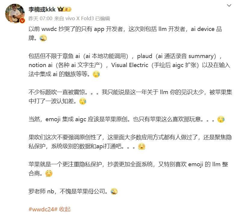 来源:ZAKER 北京时间6月11日凌晨,苹果全球开发者大会(WWDC)2024首日的主题演讲在嘘声中结束。今年WWDC因为AI的加入热度明显比去年上升,苹果为我们带来新一代操作系统、个人智能系统Apple Intelligence和国行Apple Vision Pro上市时间等内容。不过从科技圈媒体的评价到普通网友的反馈来看,大家并不买账,认为苹果“缺乏创新”的声音是主流。 例如,前魅族高管李楠里在微博上开炮,“苹果就是一个更注重隐私保护,抄袭更加全面系统,又特别喜欢 emoji 的 llm 整合商”,直言苹果的iOS 18“各种抄袭没法看”、“果粉别谈原创性了”。 ![]() 图源:微博 资本市场和华尔街的分析师们显然并不这样认为。WWDC开始前几周,已经有不少声音认为苹果可以借助AI取得成功,主题演讲结束后,华尔街在经历短暂的迟疑后,似乎接受了苹果的AI愿景。 直观表现是美国时间12日苹果股价上涨7%,飙至历史新高。截至周二收盘,苹果股价达 207.15 美元,市值一夜大增 2142 亿美元,总市值达 3.176 万亿美元。 资料显示,华尔街看好苹果的主要原因是 Apple Intelligence将推动iPhone的升级周期;借助苹果封闭系统的垄断优势,庞大的用户规模为AI功能创造海量的需求。 那么,华尔街的表态,对普通用户来说有没有参考价值?苹果这次大会是否真的如部分自媒体所言“不值一提”?或许我们能找到不同的答案。 新一代操作系统亮点颇多 首先今年的重头戏,最受关注的iOS 18,从功能的升级数量和质量来说是值得肯定的。其中iOS 18中的通话录音、自定义通知中心、佩戴AirPods Pro点头摇头接挂电话、App 应用锁这四个功能,都具有很强的实用价值。 ![]() 通话录音功能的意义不必多说,苹果曾因手机不支持通话录音,流失了不少用户。 自定义通知中心能够允许用户去修改通知中心的布局和样式,可以根据个人需要个性化定制,日常使用的功能可以放在前排,提高使用效率。 佩戴AirPods Pro耳机时点头摇头即可接挂电话可以免去在地铁、商场、办公时用手或者Siri语音命令接挂电话的尴尬,堪称i人福音。 App应用锁可以结合家长控制使用,控制孩子看视频、玩游戏的时间,在给陌生人使用手机时也可以将相册等有着用户大量隐私的App锁起来,此外还可以利用此功能直接隐藏关键App。 除此之外iOS 18还有3项升级是属于“我可以不用,但你最好得有”的: 主屏幕自定义功能,可以根据喜好改变桌面图标的颜色,可以自由放置图标的位置,并新增了深色模式下自动为应用图标填充深色的选项,用户对手机主题的掌控度进一步提高。 全新的相册App,苹果称为“迄今最重大的设计革新”,可以将相片按照主题自动归类,底部新增更多按键,新增隐藏屏幕截图功能,新增旅途回忆功能,还可以按人脸对图像归组。 软件端的卫星短信支持,这一在安卓旗舰手机中早已普及的功能终于也轮到苹果用户拥有,可实现无网络情况下发送卫星消息,即便对方没有开通卫星服务也可以接收。虽然这个功能仅限于短信消息,并不像华为可发图片消息,但已经是一大进步。 ![]() 其他设备的系统也有功能升级。iPadOS 18终于原生内置计算器App,之前苹果为什么坚持不给iPad拥有计算器App?让人费解;watchOS 11将更新的重心放在健康和健身追踪功能的革新上;全新的macOS后面可以在Mac上直接操控iPhone,Windows+安卓早已拥有的功能,苹果用户终于也能拥有了。 对WWDC2024的新一代系统升级进行简单盘点后,可以发现这些升级都是很实在的。特别是用户最多、作为基本盘的iOS,iOS 18的诚意可比iOS 17多多了。另外不要忘了华尔街分析师们非常看好的苹果个人智能系统Apple Intelligence,它除了能让苹果的AI生态自成一派,给用户带来的体验提升也相当明显。 ![]() 名字是一贯的高大上,Apple Intelligence本质是我们熟悉的部署在设备端的本地大模型。苹果表示,Apple Intelligence拥有强大的、直觉的、完整的、个人的、私人的五重特性,将生成模型置于 iPhone、iPad 和 Mac 的核心位置。 不幸的是马克·古尔曼的爆料对了,Apple Intelligence有硬件限制,比如在手机端只支持搭载 A17 Pro 的 iPhone 15 Pro / Max,其他设备大概率也只有和iPhone15 Pro同时期、M系列芯片起步的设备才支持Apple Intelligence。 这就是前面提到的华尔街看好Apple Intelligence能“推动iPhone升级周期”的原因,旧设备用户想要使用Apple Intelligence只能换新机。 ![]() Apple Intelligence直接内置在新一代系统中,使用指定机型的用户升级至iOS 18后就可以免费使用。Apple Intelligence将会和全新Siri结合,让Siri有更强的上下文理解能力、可识别屏幕内容并拥有丰富的产品知识库,这些功能将会分批次推送到Siri中,未来还会有更多的功能陆续加入。 ![]() 除了结合Siri,Apple Intelligence还可以提供文案重写、强化专注模式、文字生成表情包、自动生成备忘录插图、草图生成图片、一键消除修复图像、通话录音转写成文字等常用功能。另外苹果还宣布了和 OpenAI 合作,未来将会在 Siri 中链接GPT-4o,让Siri变成通晓天文地理的真正“智能助手”;如果你是ChatGPT的用户,还可以访问体验中的付费功能。 ![]() ![]() 今年的WWDC注重对旧系统的“查漏补缺”,推出了不少对日常体验有实打实帮助的功能,对解决日常生活中使用iPhone时遇到的各种不便很有帮助。另Apple Intelligence的加入顺应了AI时代的潮流,在未来苹果设备摇身一变成为名副其实的AI产品,至少用户的体验方面不会落伍,也能为AI