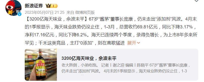 来源:互联网那些事 波云诡谲的大A江湖,海天味业曾经是跟茅台“齐名”的超神存在,但时过境迁,如今的摆在海天味业面前的,却是一份上市以来最差的业绩答卷,与舒适区渐行渐远的“酱油一哥”,该如何拓开新局面? 01,“酱油茅”神坛跌落? 时光倒回到2021年1月,海天味业市值突破7000亿大关,将巨无霸中石油都甩在了身后,成了名副其实的A股市值榜TOP巨兽,甚至与贵州茅台一道,被无数投资者亲切尊称A股“两大神水”,然而区区3年光景,海天味业最新市值已不到2000亿,蒸发的5000亿,美丽的泡沫?还是无奈的失落? ![]() 回到业绩基本盘,2023年,海天味业实现营收245.59亿元,同比下滑4.1%,尽管下滑的幅度不大,但却是近十多年来的首次营收下滑,此外,据同花顺统计数据显示,2018年之后,公司的毛利率就开始了逐年下滑,2019~2023这5年间,毛利率累降12个百分点。 ![]() 图源:同花顺 增速下滑,毛利下降,其实并不仅仅发生在海天身上,横向对比千禾味业、加加食品和中炬高新等几大调味品巨头的近5年业绩,不难发现,绝大部分都处在下行区间,加加食品更是连续3年负增长,上市调味品巨头中,似乎就千禾味业一家实现了V字反弹。 ![]() 图源:红星资本局 2021年末,海天味业的经销商数量为7430家,2023年末,这一数据已下滑至6591家,3年间,减少了839家经销门店,也引发了一些质疑,不过,海天味业官方回应称“经销商数量与营收之间不是呈正向比例关系……更注重经销商的发展质量……” 海天的解释不无道理,毕竟一些竞争力不足的门店淘汰也是时间早晚,还不如大力发展绩优门店,以图对整体业绩的贡献,只不过调味品江湖,已进入到存量博弈阶段,想让业绩回暖,对任何一个品牌而言,都比较困难。 回到具体的产品版块,2023财年,海天味业酱油、调味酱和蚝油三大王牌产品线分别实现营收126.37亿元、24.27亿元、42.51亿元,同比分别下滑8.83%、6.08%和13.74%。对营收贡献第二大的蚝油下降幅度最高,其次是对营收贡献最大的酱油板块。 与之形成反差对比的是千禾味业,2023年,千禾味业营收同比增长高达31.62%,业绩的迅猛增长的首功,当记在酱油板块,千禾酱油报告期内贡献营收20.4亿元,同比增长34.85%,占总营收比高达63.6%。 千禾的例子似乎说明,即便在存量市场,想要实现业绩的增长,也不是没希望。 另据国家统计局相关数据显示,2023年,中国餐饮行业全年收入高达52890亿元,同比增长20.4%,餐饮收入双位增长必然利好细分的调味品行业,所以,海天味业的业绩下滑,“锅”可能并不在大环境,因为整个大环境是比较利好的。 当然,离开体量谈增长显得有些耍流氓,毕竟,如果看板块营收的绝对值,海天酱油高达126.37亿元,是千禾的6倍之多,如果看公司整体营收,海天味业可以说实现了对包括中炬高新、千禾味业、加加食品在内的调味品巨头们的默秒全。 在海天这种体量级别上,要获得反映在财报数据上的增长,意味着其对应版块的增量要远高于中炬高新、千禾和加加等,另外,在调味品江湖,并不仅仅只有这几大上市巨头在呼风唤雨,还有金龙鱼这种超级巨头的跨界掠食,甚至还有一些像欣和、东古、太太乐在下沉渠道或细分市场各有优势的品牌在蚕食着行业蛋糕。 海天味业想重回高光,确实不容易。 02,重回“高光”无望? 春江水暖鸭先知,大环境和公司真实经营状况的变化,没有谁会比当事公司自己先感知到,作为大哥大的海天,怎么可能不提前布署应对?实际上,海天确实尝试过多元化转型,从未放弃过找寻调味江湖的第二增长曲线的努力。 2023年7月,茅台跨界搞了冰淇淋,海天也不甘人后,快速跟进,在广州正佳广场搞了一个冰淇淋Pop-up店,名叫“酱温”,茅台主打酱香冰淇淋,海天主推酱油冰淇淋,也着实吸引了一波眼球,这种举措你要说对业绩的增长贡献吧,可以忽略,但是却为企业吸引到了弥足珍贵的曝光度——360行、行行都需要流量 拉长时间线观测,海天味业甚至还在毛利率并不诱人的食用油和粮食等产品线上进行过纵深布局,实现了大米、食用油、酱油、调味酱、蚝油、饮料等品类的全覆盖,当然,这些举措对海天味业的大盘子来讲长期是利好的,但对于营收的增量贡献,短期可能并不明显。 摆在海天面前的当务之急,其实是亟待提速的库存消化能力 2023年,海天味业酱油、调味酱和蚝油的库存量分别同比激增152.54%、165.68%、61.93%,海天解释称库存上升的主要因素是春节延后,且备货集中在本期末所至。 据食品行业知名观察家朱凡蓬称,近2年来,海天味业舆情不断,“酱油生蛆”、“添加剂”都没有得到妥善处理,影响了消费者对品牌的信任,终端消费者对酱油并没有那么高的忠诚 度,调味品市场竞争本就十分激烈,海天味业(业绩)下滑不足为奇。 ![]() 截自:《北晚在线》相关报道 ![]() 截自《新黄河客户端》报道 ![]() 截自:微博大V时评 ![]() 截自:微博专业媒体时评 换言之,这些负面舆论对业绩的冲击,已不容忽视,或者说,通过实际行动消弥这些负面的影响,重构消费者的品牌心智,食品安全与品质彻底无忧,才是提升库存消化能力和让业绩重回正增长轨道的有效良方! 当然,从长期来看,海天味业仍然具备品牌影响力和研发创新力这两大核心优势。 2019年~2023年,海天味业的研发投入分别为5.87亿元、7.12亿元、7.72亿元、7.51亿元、7.15亿元,是行业老二中炬高新的平均值的近4倍、行业老三千禾味业的平均值的近8倍之多,虽然