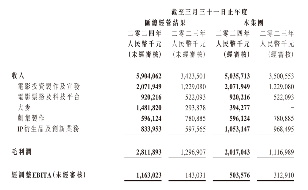 来源/港股研究社 作者丨在辉影视文娱市场的火热仍在延续,新定档的电影和演出,不断引人关注这个行业的生机。而这个行业的支持者、受益者,就站在一线。 5月29日晚,阿里影业发布截至2024年3月31日的2024财年业绩公告。社会文娱消费的热情,对优质项目的把控能力,收购大麦后更完善的盈利结构,贯彻科技提质增效的布局,共同推动阿里影业闯出了一番新气象。 ![]() 这一财年,阿里影业总收入同比增长44%至50.36亿元;经调整EBITA盈利达到5.04亿元,同比增长61%,归母净利润达到2.85亿元。即便增长势头已经足够强,阿里影业的后劲仍不可低估。基于大批优质内容和科技储备,以及对市场的理解,一个具备内生动力的可持续业务模型,正在它的手中成型和发展。 文娱市场红利中的内容领先 国内文娱市场表现强劲,已经成为一种常态。考虑到阿里影业在去年末完成了对大麦的收购,从收入结构看,这次财报的重点,首先就在于影视制作宣发和大麦这两个“20亿级”和“10亿级”业务。同时,它们也是文娱市场内容驱动发展最直接的体现。 从影视市场看,电影业强势复苏,是整个文娱市场的核心节奏。根据国家电影局公布的数据,2023年全国电影票房总量同比增幅达到82.6%,推动票房数据达到549.15亿元。而把优质单体内容的市场影响力拎出来,全国票房过亿、破10亿的影片分别达到了73部、11部。 ![]() 阿里影业抓住了其中哪些机会呢?如财报所示,通过合制、主宣发、联合出品、联合发行、买断等不同的参与模式,阿里影业参与了去年暑期档的两部明星影片《孤注一掷》和《消失的她》,今年春节档的票房冠军《热辣滚烫》和亚军《飞驰人生2》,以及《长安三万里》、《三大队》、《周处除三害》等垂直领域高口碑作品。 ![]() 稳定的业务节奏,是阿里影业的主要亮点。它并不拘泥于特定的内容生产模式,而是广泛参与好项目,覆盖重点档期和重点人群。在行业热度持续走高、好项目层出不穷的情况下,阿里影业在报告期内参与出品、发行的总影片数量逾60部,其中15部进入同期票房前20,面对去年接近13亿人次观影的大盘,抓住不同品类的优质内容,可以用合理的参与模式撬动更大的成果,并取得了高于行业的投资回报,可见其策略行之有效,初步形成内容领先姿态。 影视市场如此,演艺市场同样火热。最大的看点是,收购大麦后的首次业务并表。截至报告期末,大麦GMV同比激增超500%,大麦业务交易总额(GMV)同比增幅逾500%,演唱会头部项目覆盖率接近100%,成为演出行业用户首选购票平台。 毫无疑问,演出市场水温居高不下,大麦的龙头地位不会动摇。它的加入,除了带来新的业绩增长极之外,还完善了阿里影业的业务结构,有望通过协同创造更多商业机会。 ![]() 并且,在未来一段时间,阿里影业依然具有内容驱动增长的确定性。一方面是其手握超过50个投资待映项目,超30个版权及开发项目,横跨多个垂直领域、类型丰富,具有较好的转化前景;另一方面是今年一季度,全国营业性演出场次、票房收入、观演人数的同比增速分别为72.71%、116.87%、77.88%,部分热门演出依然处于供不应求状态,大麦还会继续扶摇直上。 “蜜月期”远未结束,阿里影业的成长性值得期待。 多元优质资产的长线价值 电影内容投制及大麦演出两大业务之外,阿里影业存有更多亮点。电影票务及科技平台的收入同比增长76%至9.2亿元,增速名列多业务第一;IP衍生品及创新业务的收入同比增长9%至10.53亿元。事实上,在阿里影业“内容+科技”双轮驱动的战略中,这两部分业务价值效应的重点是两种资产:科技资产和IP资产。它们的亮点在于可复用、可持续的长期价值。以科技资产为例,阿里影业在去年的金鸡百花电影节上,官宣其一站式宣发平台灯塔推出“灯塔AI智能宣发助手”,通过接入AI技术对数据进行处理,为宣发提供更强的辅助功能。 比如,当前消费者对文娱内容的情感和注意力,极易受到社交媒体传播的影响,所以一部影片上映周期内可能存在变化复杂的媒介特征。通过AI助力的数据分析和智能洞察,影片宣发将更贴近院线和社媒的动态,化变量为增量,甚至依靠观众与内容的连接创造独特优势。要在激荡的影视市场拿到确定性,灯塔AI提供了强大、可持续的赋能。 此外,灯塔AI在今年1月进行了升级,进一步聚焦票房预测、预售分析等功能。阿里影业旗下的橘子工作室,已经掌握了AIGC为场景物料服务的生产和应用能力,且阿里影业已将AIGC、数字人、虚拟拍摄等技术均引入了影视行业的相关流程,逐步兑现为生产力。 ![]() (图源:灯塔专业版APP) 如果说科技的作用重心在生产宣发,那么IP就是扩大内容生命周期价值的基点。阿里影业对IP的思考极为全面,这一点可以从其储备与开发的路线中得到体现。 对于影视方面的强IP,阿里影业强调“影剧联动”。比如今年春节档,电影《飞驰人生2》和优酷《飞驰人生热爱篇》网剧打出了亮眼的协同效应,IP热度共振为表,元素互映、素材库共享、节奏同频为里,共同实现了IP价值最大化。 未来,这方面的机遇或许有三个:一是阿里影业选择合适的头部影片,更多地进行剧集同步开发;二是进一步发散改编思路,向舞台剧、音乐剧等类型拓展,与大麦产生协同效应;三是与旗下潮玩品牌锦鲤拿趣合作开发,延长影视内容生命周期,锦鲤拿趣目前拥有超过10个原创潮玩IP,合作影视内容超40部,经验丰富