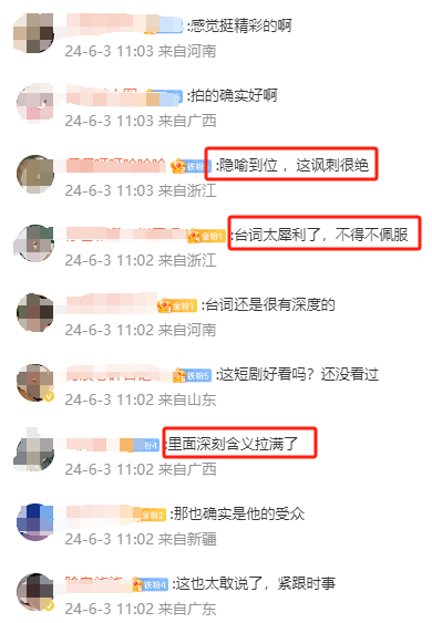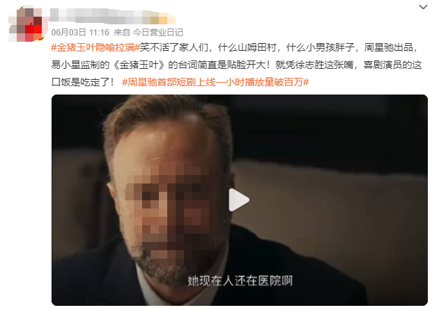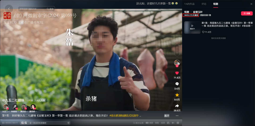 作者 | Hiu 来源 | 互联网品牌官 重生之我靠短剧夺回我的一切。 龙年伊始,#咪蒙一个寒假靠2部短剧收入过亿#的话题,彻底撬开了短剧行业的大门,为资本市场注入了热辣滚烫的新鲜血液。 而前不见伴随着背刺打工人等塌房舆论而大爆出圈的“王妈”,将短剧宇宙的吸金力再一次具象化。一部《重生之我在霸总短剧里当保姆》,便能让“七颗猩猩”账号的广告月收入达到7位数。 最近,短剧市场的热闹繁荣之风还刮到了喜剧之王那儿。 6月2日,周星驰带着他出品的首部短剧《金猪玉叶》向我们走来了。 ![]() ▲ 图源:抖音@九五二七剧场 年少时欠星爷的电影票,如今可以在短视频赛道偿还了? 01、《金猪玉叶》上线,星爷入局的首部短剧 6月2日17时,《金猪玉叶》在抖音@九五二七剧场上线第一集。上线一小时播放量突破百万,截至发稿,播放量已突破3500万。 ![]() ▲ 图源:抖音@九五二七剧场 这是抖音与周星驰达成独家合作的“九五二七剧场”推出的第一部作品,由周星驰出品、易小星监制、马史导演,邀请到了徐志胜、蒋诗萌、土豆、派小轩、张百乔等众多知名喜剧演员参演。 由于讲述的是网络诈骗(杀猪盘)、职场不公等社会议题,首集上线该剧便在微博上斩获了#金猪玉叶隐喻拉满#、#金猪玉叶太敢拍了#等话题。 它成功地吸引了我,从没看过短剧的我为此特意点开看了。星爷出品,果然没让我失望。 “华威已经被开除了”、“提可托可也要被封杀了”、“山村家里排核废水”、“山姆家那么多枪击案”、“胖子和小男孩是个雷”……一句台词一个梗,网友直言这台词简直就是贴脸开大,内涵满满。 ![]() ▲ 图源:微博 其中,脱口秀演员徐志胜集合了隐喻、暗讽和无厘头等特点的神吐槽演出,直接让他成为了首集的“MVP”(全场最佳)。 网友热评:“还以为星爷王者归来,结果徐志胜拿了第一。” 《互联网品牌官》了解到,《金猪玉叶》第一季共有24集,每集时长在5-6分钟左右。 与主流的竖屏短剧不一样,《金猪玉叶》采用横屏拍摄,可以视作由一部120分钟电影剪辑成24集的横屏短剧。 除了这一点之外,不收费也是《金猪玉叶》的另一大特点,这注定了它与资本市场追逐的那类短剧有着完全不一样的气质。 此前,易小星在接受媒体采访时也曾表示,自己和周星驰都不想跟风做霸总题材的短剧,“做点不一样的短剧,做一个有星爷气质的、电影化的短剧剧本”这是他做短剧的愿景。 那么,易小星的期望达成了吗? 02、“含星量”被质疑,感受到周星驰的存在吗 期望与失望这对双子星,常常会围绕在我们喜欢的人身上。而且喜爱度越高,产生的情绪引力作用就越强。 基于这个原理,回过头来看跟周星驰这个超级大IP扯上关系的《金猪玉叶》,无论周星驰在其中承担着什么样的角色,这部剧都会被打上深刻的“周星驰”烙印。 在享受着天然的流量效应所带来的红利之时,自然也得接受更为严苛的审视。 正所谓,期望越大失望越大。 奔着周星驰名头而来,第一批失望者诞生了。 这一小戳人打出了差评,皆因“星味”不足,没有感受到周星驰无厘头式的喜剧风格。 有网友认为“不好笑,和周星驰一点关系都没有”。 也有人质疑周星驰在该剧的参与程度,是否只是挂个名头而已。 ![]() ![]() 对此,易小星在主创分享会中曾透露,周星驰在本次作品各个环节不可或缺,人物、剧情设定和后期剪辑等方面均给出指导创作。 他还提到,剧中埋了100多个向周星驰致敬的彩蛋。比如,男主房间墙上的《喜剧之王》海报,部分惊悚桥段借鉴了《回魂夜》的音乐和镜头语言等。 在第一集中,男主角朱浩(饰演者 史元庭)杀猪佬的造型便是明显致敬了周星驰的经典电影《国产凌凌漆》。 ![]() 而对于不友好的声音,史元庭在自己的个人账号上也回应过,“我们这部戏的每一集剧本,每一个字,星爷都是有看过,星爷都是有把关的。我们拍摄的时候,每一天拍摄剪辑出来的素材,星爷都是有看的。” ![]() ▲ 图源:抖音@演员史元庭 抛开“含星量”这一点,有不少网友都肯定了《金猪玉叶》,给出了颇高的评价。 网友留言“有电影质感”、“有点意思,这么敢说挺刺激”、“台词很有深度,不得不佩服”。 ![]() 诚然,特别是徐志胜扮演的狗腿子以黑色幽默的方式暗讽职场潜规则,还紧跟时事,在剧情中融入中美技术对抗、日本核废水、美国枪击乱象等现实议题。 比如,女主叶小莱的上级是山姆,这里的山姆暗指漂亮国。华威和提可托可则分别暗指华为和TikTok(海外版抖音)。 ![]() ▲ 图源:抖音 比如,山姆拒绝女主叶小莱请假的理由是“谁家还没点事”,狗腿子员工则附和道:“去年木村(日本员工)家里排核废水,那么大的事,人家都没回家看一眼,山姆家那么多枪击案,人家不也是默默承受吗?” ![]() ▲ 图源:抖音 再比如,女主提到的两个雷“胖子和小男孩”,是带有历史知识点在里面的,他们代表的是漂亮国投向小日子的两颗真“雷”。广岛的蘑菇弹叫小男孩,长崎的外形较圆的叫胖子。 身上不揣着点知识点,还真看不懂这部短剧要表达的是什么。 ![]() ![]() 还有一个冷门知识点,“九五二七”的厂牌名也是有渊源的,它出自周星驰的经典影片。在《唐伯虎点秋香》中,周星驰饰演的唐伯虎混入华府当仆人,当时采用的编号就是“9527”。 ![]() ▲ 图源:微博 03、疯狂的赛道,狂飙的短剧 据艾媒咨询《2023-2024年中国微短剧市