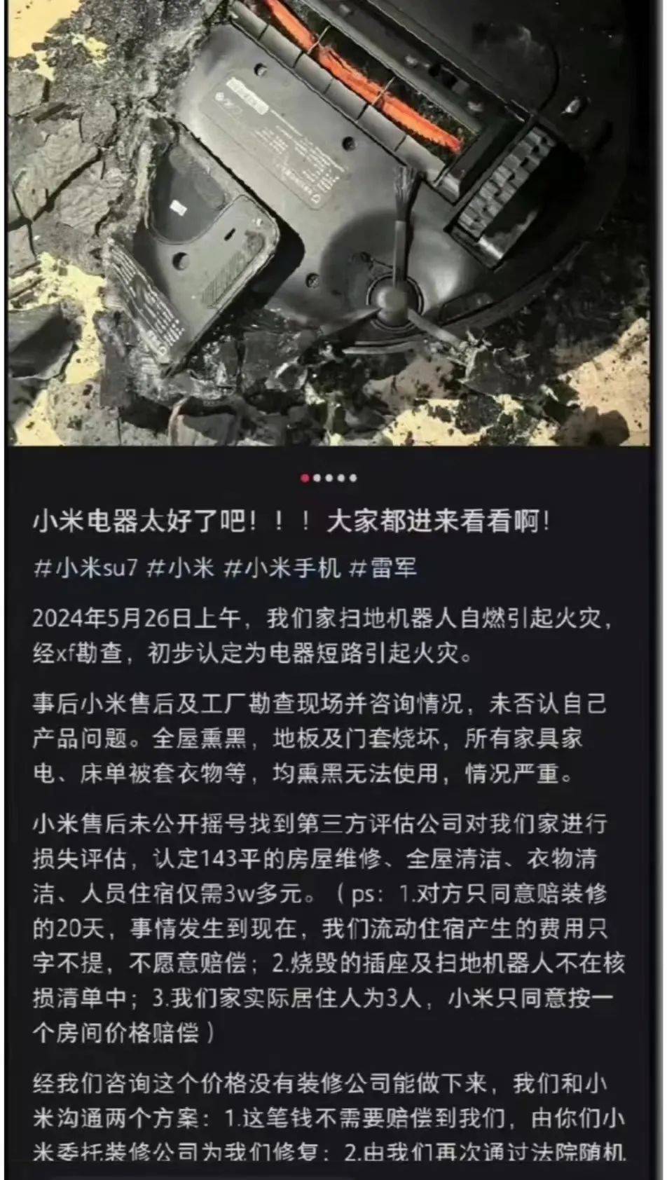 小米火了,物理意义上的。 01、小米扫地机自燃 6月15日,江苏南通的一位女士在小红书上发帖称,5月26日上午,她家的扫地机自燃引起火灾,经消防勘查,初步认定为电器短路引起火灾。 ![]() ●图源:小红书出现自燃的扫地机是由追觅科技有限公司代工的小米米家扫地机,型号为1T,于2020年上市,售价2299元,定位为中高端产品。 据张女士提供的信息,她的这款扫地机是朋友赠送,2021年于小米线下渠道购买。 张女士也发布了火灾后的现场照片,现场被烧得很严重,包括部分木质框已被烧黑,黑烟已经将部分吊顶熏黑,所幸并无人员伤亡。 ![]() ●图源:网络张女士同时也晒出了火灾事故简易调查认定书,火灾事故原因为扫地机充电底座线路故障引燃周边可燃物导致,直接经济损失10000元。 针对此次事故,小米售后及工厂勘查现场并咨询情况,未否认自己产品问题,同时小米售后未公开摇号找到第三方评估公司进行损失评估,认定143平方面的房屋维修、全屋清洁、衣物清洁、人员住宿需30000多元。 张女士并不认可小米的赔偿,她表示对方只同意赔装修的20天住宿,事情发生到现在,他们对流动住宿产生的费用只字不提,不愿意赔偿。 张女士称经咨询没有装修公司能30000元做下来房屋的重新装修,前后这件事已沟通20多天,双方对赔偿金额问题依旧没有达成共识。 小米坚持只能赔偿这么多,并且态度强硬,表示不接受市场监督管理局调解。 02、到底是不是友商买的黑稿? 随着618的到来,有博主早早预言,会有小米空调的黑料或黑稿热搜。 ![]() ●图源:微博@瓦力测评意指小米会因为在家店领域占据市场从而动了一些友商的蛋糕,会遭到友商舆论层面的攻击。 虽然没有小米空调的黑稿,但小米电器的负面热搜也确实如约而至了。 不过,当然也不能这口黑锅甩给友商,毕竟俗话说得好,“苍蝇不叮无缝的蛋”,就小米扫地机自燃这件事,确实是小米方的责任。 其实小米旗下的电器产品一直很受消费者的喜欢,比如空调、电视、吹风机、电灯等,价格便宜的同时质量也有保证。 但这次的小米扫地机事件让更多的消费者知道了小米的很多产品是由其它公司代工出来的,并非由小米自己出品,这可能会降低消费者对小米家电的认可。 因为很多消费者是分不清代工和贴牌的区别的,近年来,以南极人为首的一些服装品牌引领了一股贴牌之风,但质量却难以保障,很多消费者分不清自己买到的衣物到底是不是南极人的,于是干脆直接放弃了这个品牌的所有商品,同时拉黑了所有贴牌/代工的品牌。 其实代工和贴牌是有区别的,简单来说,贴牌就是制造方负责产品从研发、设计到生产、后期维护的全流程,品牌方只需要挂上自己的品牌进行销售即可。代工则是工厂只负责生产这一环节,产品的研发仍由品牌方掌控。 所以严格说起来,代工的质量是比贴牌要高不少的。可小米扫地机这次依然出现了重大事故,虽然不能把锅全甩给代工,但很明显,代工的产品肯定没有小米自己的工厂制造能让消费者更安心。 对于这件事,部分网友质疑在张女士放出的火灾事故事实中,为何只露出了两行,被码上的三行究竟是什么,张女士是否隐瞒了自己的一些责任? ![]() ●图源:网络其实按照事故调查认定书的内容模版,打码的内容应该是接警时间和小区地址房间号等隐私信息,因此本次事故的主要责任是小米方无疑,不存在张女士使用不当的责任。 而此事的主要的矛盾是张女士对小米赔偿的3万元不满意。 小米方面认为3万元足够张女士对房屋进行一个重新的装修,而张女士认为3万元不足以对房屋进行重新装修。 对于这一点,只能是公说公有理,婆说婆有理,在协调无果后,双方应该会走法律程序,届时会有最公正的鉴定与评判。 至于本次事件是否的友商的黑稿,实在是不好判断。说它是吧,本次事件小米确实有很大责任;说它不是吧,发生的时间又确实太巧了,正好在618的前几天,势必会严重影响对小米旗下产品的销量。 到头来也只能是一笔糊涂账。 或许小米可以向比亚迪学习。 后者面对产品被贬低、拉踩和恶意诋毁的情况,昨天在全网征集黑公关的有效线索和证据,对提供者奖励20万-500万人民币,得到了大家的好评。 ![]() ●图源:微博@小迪快报而小米作为常年被拉踩的对象,或许也可以采取相同的策略,跟上比亚迪的节奏,反守为攻,共同打击黑公关行为,建设良好的营商环境。 03、扫地机器人是不是中产陷阱? 扫地机、洗碗机、烘干机被称为懒人装修必备三件套。 价格也十分美丽,想拥有一套质量质量说得过去的懒人三件套,至少需要大几千块钱,质量稍微好一点就得上万元。 ![]() ●图源:淘宝截图老一辈人装修房屋大概率是不会选择这三样的,毕竟上半生习惯了做家务。 但年轻人会更喜欢这些能解放家务的新科技,毕竟辛苦上了一天班,回到家肯定想躺着看会电视,没心思去做家务,有个扫洗一体的智能扫地机确实挺惬意。 可当大伙真花了几千块钱把扫地机买到手,发现和想象中的又不一样,概括的说,扫地机是方便,但又不那么方便。 原因是扫地机确实可以帮助我们扫地拖地,但是也留下了一些其它问题:扫完拖完后地上的毛发会缠绕在机器上,臭水垃圾需要我们自己去处理,扫地机有时候会撞坏墙壁和家具,有时候扫完后并不干净,而是一种均匀的脏。 种种问题都需要我们动手去帮扫地机解决,网上也有不少“扫地机就是智商税