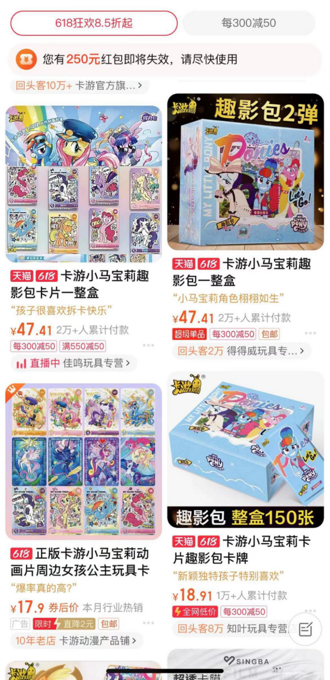 还记得小时候的干脆面集卡游戏吗?如今,这种风潮又回来了,只不过现在的10后小学生玩得比我们当年高级多了。 最近,小马宝莉卡成为小学生们社交中的“硬通货”,无论是线上还是线下,都引发了热烈的追捧。这个圈子被亲切地称为‘马圈’。圈内的孩子们热衷于购买、收集和交换这些卡片。如果不参与其中,似乎就会被视为“out”了。 但这可不是我们记忆中五毛钱的干脆面,一盒小马宝莉卡要上百元起步,买了卡片之后,还要买卡册,卡包之类的周边配套产品,价格都不便宜。 有娃的家长才知道这个爱好有多烧钱,有些孩子为了集齐卡片,甚至花费了上千元。更令人震惊的是,有新闻报道称,已有小学生使用家长的手机在直播间下单,花费了上万元购买这些卡片。 那么,这些小小的卡片究竟有何魅力,能够风靡整个小学生群体呢?它们是如何吸引孩子们的注意力的呢? 小马宝莉卡火成什么样了? “每晚睡前,孩子要将收集的小马宝莉卡摆放在地毯上欣赏,随后再把它们放回盒子,笑得很开心,有时甚至要抱着卡盒睡觉。” 一位五年级的学生家长对笔者说,孩子对小马宝莉卡的痴迷已经达到了难以自拔的地步,甚至将自己的压岁钱全部用于购买这些卡片,几乎停不下来。家长十分不解,为何这些简单的卡片能拥有如此大的魔力? 《小马宝莉》这部美国孩之宝公司出品的动画片,曾在2013年登陆央视少儿频道等国内电视平台,讲述了一群憨态可掬、性格各异的小马学习魔法、守护家园的故事。但当时并未引起广泛反响,没想到十几年后,其周边产品——小马宝莉卡却意外地火爆起来。 ![]() 图源:《小马宝莉》剧照 笔者发现,多所文具店、杂货店都将其摆在最显眼的货架上。小马宝莉卡通常按包出售,趣影、彩虹、辉月、暮光等,每包价格从2元至10元不等,而最贵的暮光包甚至达到50元一板,每板仅包含4包,每包内只有五六张卡。 整盒购买的话价格更高,行话叫“端盒”,如一整盒辉月包售价从180元至488元不等。 小马宝莉卡的线下销售网络非常广泛,几乎覆盖了孩子的生活圈,包括商超、便利店、文具店、玩具店、母婴店甚至书店,再加上同学之间的互相影响,使得集卡游戏在孩子们中间愈发流行。 这种火爆现象不仅局限于线下,线上平台同样热度不减。在电商平台上,小马宝莉卡带动了单店最高200万件的月销量,并成功登上淘天垂类热卖榜。 ![]() 而在小红书平台,关于“小马宝莉卡”的笔记数量高达71万篇,商品超过14万件,单平台话题浏览量超过2.5亿。甚至出现了专门的“小马拆卡博主”和“小马卡牌直播间”等拆卡博主,每晚拆卡直播间能吸引上千人围观。 在社交平台“你为小马宝莉卡砸了多少钱”的话题讨论中,家长们表示为孩子购买小马宝莉卡所花费的金额,从几百元到上千元不等,甚至有些家长说已经花费了上万元。上一个如此爆火的卡牌还是奥特曼。 有趣的是,这种卡牌热潮还形成了性别分化,即“男玩奥特曼,女玩小马宝莉”。这一现象令人好奇,为何这些卡牌能够如此吸引小学生们的心? 卡牌商家是如何吸引小学生的? 卡牌商家们深谙人性,赋予了卡牌一种难以抗拒的上瘾特质。特别是小马宝莉卡,其精心设计的四个属性:情绪价值、社交属性、价值属性和盲盒属性,让小学生们沉浸其中,欲罢不能。 首先,卡牌具有情绪价值。以小马宝莉卡牌为例,它们不仅设计精美,而且蕴含了友谊、勇气和忠诚等正面的价值观。这种色彩鲜艳且视觉吸引力强的设计,极大地满足了孩子们天生具有的收集和整理事物的倾向。 同时,小马宝莉的可爱形象和温馨情节设计,也给予孩子们一种心理慰藉,让他们在这个虚拟世界中找到了快乐和安慰。 其次,卡牌具有强烈的社交属性。孩子们通过集卡、换卡和讨论卡牌,建立并巩固了彼此的关系。在这个卡牌“圈子”里,不懂卡牌或没有参与集卡的孩子可能会感到被排斥。因此,卡牌不仅成为孩子们交友的媒介,也成了他们社交身份的象征。商家甚至不需要过多推广,孩子们就会自发地成为卡牌的宣传者,吸引更多的潜在客户。 ![]() 图源:小红书@小怡思 再者,卡牌还具有明显的价值属性。由于卡牌的数量有限,且受到财力的限制,孩子们之间会形成攀比心理。拥有更多、更高等级、更稀有卡片的孩子,往往会获得更多的崇拜和尊重。 五年级的小泉对笔者说道,他们班上十个女生中有九个女生都在玩小马宝莉卡,拥有稀有卡越多的女生会成为全班女生羡慕的对象。 “你以为她们买的是卡牌,其实是同学们的崇拜。”这种攀比心理促使孩子们不断追求更多的卡片,甚至不惜向父母索取更多的零花钱来购买。 最后,卡牌还具有盲盒属性。跟盲盒类似,一张张小小的卡片被随机装入卡包中,孩子在抽卡的时候,并不知道里面有什么,这种不确定性激发了他们的好奇心、冒险欲望,甚至“赌徒”心理。 以小马宝莉卡为例,有“R”“SR”“SSR”等诸多类型,分别对应着稀有、超稀有和特级超稀有。奥特曼卡牌也是如此,根据卡牌工艺分为R、SR、SSR、LGR、USR、GP、XR等二十多个等级。孩子们为了抽到最为稀有的卡片,常常会持续购买,难以自拔。 这种分类不仅增加了收集的难度和挑战性,同时也提升了稀有卡片的价值。如小马宝莉卡热门卡片二手流通价可达数百元到数千元。值得注意的是,在巨大利益诱惑下,市场上已经出现不少稀有卡片的高仿卡。有小学