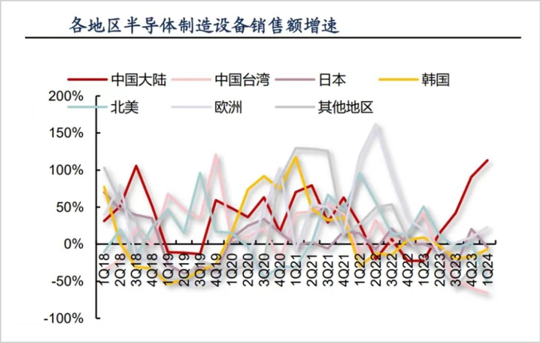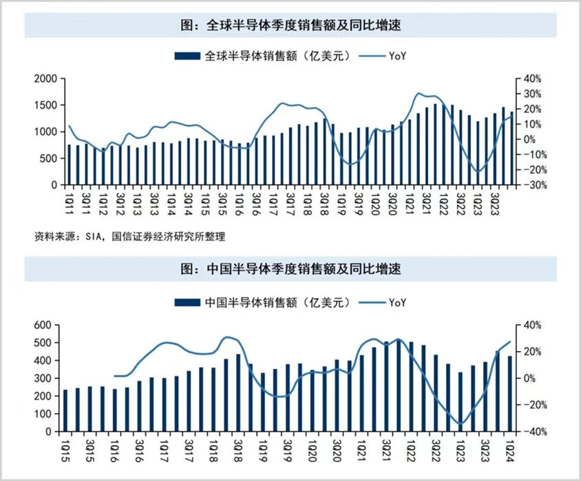 01、复苏正在进行时 涨价是周期反转最直接的讯号。 2024年,功率半导体率先开始提价,三联盛全系列产品上调10-20%,蓝彩电子全系列产品上调10-18%,高格芯微全线产品上调10-20%,捷捷微电TrenchMOS上调5-10%等。进入5-6月,华润微、扬杰科技等功率大厂又先后有新的谈价动作。 涨价潮甚至已经开始从元器件向晶圆代工端扩散。 根据最新的市场消息,台积电3nm代工计划涨价5%以上,先进封装明年年度报价也约有10%-20%的涨幅,受此消息影响,6月18日,台积电台北股价跳空高开,盘中再创历史最高纪录。摩根士丹利也在最新的报告中提示,华虹半导体晶圆厂目前的利用率已经超过了100%,预计在下半年可能会将晶圆价格上调10%。 对于产业链的冷暖,身处其中的企业最能感知。 晶圆厂领域,中芯国际2024Q1营收125.94亿元,同比增长23.36%,环比增长3.63%,同时指引Q2营收继续环比增长5%-7%;封测厂中,长电科技今年一季度营收68.42亿元,同比增长16.75%。通富微电一季度营收52.82亿元,同比增长13.79%。 2023年第一季度,兆易创新、卓胜微、韦尔股份、澜起科技、晶晨股份、瑞芯微、北京君正、圣邦股份、紫光国微等国内头部芯片厂商的平均库存周转天数高达351天,随后在二季度下降到298天,三季度下降到268天,四季度下降到243天,到2024年Q1,继续下降到240天。 价格,库存,业绩,产能利用率,所有这些指标无不印证着半导体产业周期上行的事实。无论是从历史规律视角出发,还是基于现实基础考量,这种复苏都有强烈扎实的逻辑支撑。 首先,半导体产业本身就有明显的周期性,盛极而衰,否极泰来,且历史上看下行阶段(销售额同比增速从峰顶到谷底)持续的时间一般为4-6个季度。 以过去十年的数据为例,2013Q1-2014Q4为景气上行时期,2015Q1-2016Q2转为景气下行;2016Q3-2018Q2转为景气上行阶段,2018Q3-2019Q3为景气下行;2019Q4-2021Q4景气度提升,2022Q1-2023Q1再次陷入疲软。根据SIA披露的数据,全球半导体季度销售额同比增速自2023年一季度触底后跌幅持续收窄,到四季度同比转正,按照历史规律,新一轮景气周期已经开始酝酿。 ![]() ▲图源:国信证券 另一方面,AI的长驱直入普遍提升了全社会对算力和存力的需求,而这些需求最终都将由半导体承载。 Transformer类AI大模型所需算力平均每2年增长750倍,按照Gartner的预估,2022年全球AI芯片市场规模为442亿美元,到2027年这一数据预计将增长至约1200亿美元。各领域存储容量也将同步增长,根据美光科技的预测,2021-2025年DRAM容量的CAGR为14-19%,NAND容量的CAGR为26%-29%。 在最新发布的2024年春季版半导体市场预测,世界半导体贸易统计组织WSTS对2024年半导体市场规模的预测从5883.64亿美元上调至6112.31亿美元,同时将2023年全球半导体市场规模调整为5268.85亿美元。 这意味着,2024年半导体市场的规模将同比增加16%。 02、设备是稳稳的幸福 兼具弹性和确定性,如果要找出本轮半导体新周期最值得关注的细分领域,那一定是设备。 首先需要明确一点,先进制程逻辑器件相比成熟制程对刻蚀、薄膜沉积(特别是ALD、EPI)、量检测、热处理等多种设备的需求有很大提升,这种提升同时体现为设备总用量和单台设备价值量两个维度。来自一线的调研数据显示,月产1万片晶圆的12寸先进制程产线需要氧化/高温/退火设备41.5台,是12寸成熟制程产线的1.9倍,需要量检测设备87台,是成熟制程产线的1.7倍。 当下半导体设备有很大增量扩容空间,国内市场尤其如此。 中国半导体产业虽然市场规模大,但国产化率低,2023年,中国大陆芯片自给率只有约12%,高端数字芯片重度依赖进口。根据灼识咨询的统计,中国AI芯片市场规模约占全球AI市场规模30%-40%,其中很大一部分订单被英伟达拿走,2023财年,英伟达在中国大陆地区的营业收入达到58亿美元,占其总收入的21.45%。 在高端芯片海外代工受限的背景下,中国半导体产业要想跟上全球发展速度,就必须提升高性能处理器和存储器本土制造能力,进而必须加大设备投放,而高端半导体制造设备的进口又是受到严格管制的。 所以,国产设备的春天就要来了。 根据SEAJ的最新统计,今年一季度全球半导体制造设备销售额264.2亿美元,同比下滑2%,中国大陆却逆势大增113%,连续四个季度成为全球最大半导体设备市场。另据开源证券测算,基于先进存储逻辑晶圆厂资本开支加大以及产线设备国产化率提升,中国大陆半导体设备销售额有望从2023年的366亿美金增长到2027年的657.7亿美金,CAGR达15.8%。 ![]() ▲图源:信达证券市场空间大,且竞争格局好,国内半导体设备各细分领域能打的企业就只有那几家。薄膜沉积设备环节的核心玩家是北方华创和拓荆科技,刻蚀设备环节的主要参与者是中微公司和北方华创,光刻环节上海微电子一马当先,CMP设备领域华海清科首屈一指…… 当少量企业分大量蛋糕,必然带来业绩爆发力。 2024Q1,北方华创营业收入58.59亿元,同比增长51.36%,归母净利润11.27亿元,同比增长90.4%,公司合同负债92.51亿元,相较于2023年末增长11.23%;拓荆科技实现营业收入4.72亿元,同比增长17.25%,在手销售订单(不含Demo订单)金额64.23亿元,较上年末增长18.21亿元,同比增长近40%;中微公司营收16.05亿元,同比增长31.23%。 2018-2022年,国内半导体设备公司的增长主要受益于成熟制程扩产以及产线设备国产化。从去年开始,国内先进晶圆厂的采招开始边际加速,同时对国产设备的验证导入力度也正在加大。中微公司CCP刻蚀