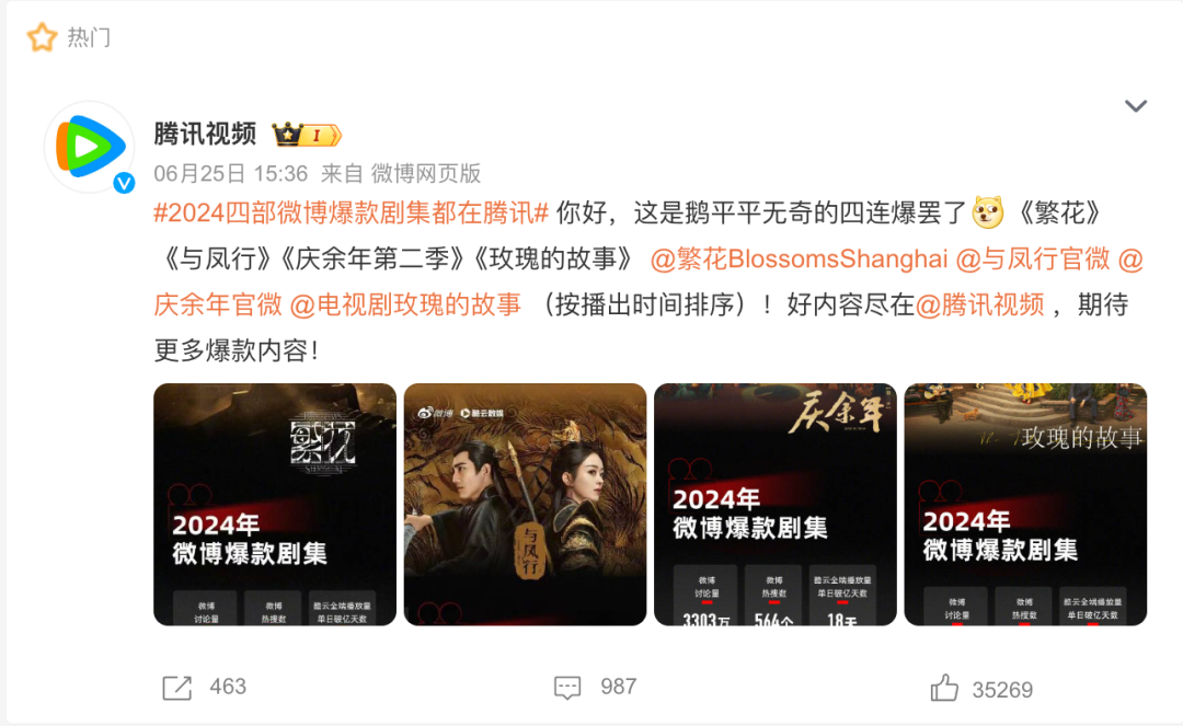 @松果财经原创 作者| 璟松 随着玫瑰的故事落下帷幕,#腾讯四连爆#的话题也火速登上热搜第一。随后腾讯视频官博火速发博认领爆款。 ![]() 而在“腾讯赢麻了”背后,有一个身影也不容忽视——阅文集团。 在2023年年报中,阅文集团执行董事、首席执行官兼总裁侯晓楠就曾表示,相信2024年将成为阅文的“爆款之年”。 而事实也确实如此,上半年四部爆款,除《繁花》外,《与凤行》《庆余年2》和《玫瑰的故事》均出自阅文集团之手。除了在播放量及全网讨论声量上独领风骚,在招商方面更是一骑绝尘。有博主统计,上半年,在剧集广告招商方面,仅3部剧视频广告时长超过3000秒,即《庆余年第二季》、《与凤行》、《玫瑰的故事》,足见吸金能力。 ![]() 截图:Data达瓦里氏 下半年,阅文还有《大奉打更人》等知名IP剧集排队上线,蓄势待发。 剧集成功的B面,根植于阅文“取之不尽”的IP池。 此前,阅文集团于安徽省举办2024阅文创作大会。会上,阅文集团CEO兼总裁侯晓楠宣布,阅文还将建立“10亿生态扶持基金”,在社区共创、IP开发和平台体验三个方面加大投入,从作品的创作初期开始就陪伴其成长。 深入来看,阅文集团此举正是在“抛砖引玉”,其核心就是做好IP的放大器。 01、网文IP市场上演“大跃进” 中国社会科学院文学研究所发布《2023中国网络文学发展研究报告》显示,截至2023年底,中国网络文学阅读市场规模近3000亿元,阅读用户近5.4亿,作品数量超3600万部,作者规模达2400余万。 行业规模突破3000亿元,这释放了一个重要信号,说明网文行业足够广阔和也足够包容。而这其中,网络文学IP市场也迅速崛起,2023年其市场规模大幅跃升至2605亿元,同比增长近百亿。 具体来看,数字阅读产业与影视文娱产业加速融合,各个文化载体之间的壁垒逐渐消退。衍生形式上,网络文学从最初的出版、改编影视剧、漫画等,进行了进一步的细分。 ![]() 数据来源:伽马数据(CNG) 从文娱IP收入来源上看,可以更为直观的看到这一趋势。伽马数据显示,游戏与影视虽仍是IP营收的主力军,但玩具、赛事直播、主题展以及其他也开始有自己的“一席之地”。 例如,热度极高的《庆余年2》《玫瑰的故事》均改编自同名爆款小说,一个出自阅文白金作家猫腻之手,另一个源自当代作家亦舒笔下。两大作品之所以高热度,离不开好的故事、有实力的主创改编以及好的演员、强质感的拍摄。 更值得一提的是,原本令人头疼的插播广告,由于平台围绕IP特色进行广告植入的创新,也实现了内容和商业化之间的平衡,消费者和品牌方都乐见其成。 与此同时,热门的IP、爆火的剧集也催生了更多衍生产品,比如IP玩具、同人游戏以及周边产品等等。比如,阅文旗下90后另一耳熟能详的作品,唐家三少的《斗罗大陆》,从影视剧集到动漫制作,再到手办玩具、手游、主题展览,衍生产品覆盖众多领域。 由此可见,网文IP正在展现其更强的延展力和影响力。 此时,随着移动互联网趋势的根深蒂固,年轻读者越来越喜欢碎片化阅读,更享受在短时间内获得阅读爽感,这也催生了2023年表现火爆的短剧。 2022中国网络文学蓝皮书显示,2022年全年网络文学改编微短剧新增IP授权超300部。据相关业内人士透露,这一数字相较前年至少翻了一番,而且还在持续增长。 再加上网文IP具备便捷的改编效率、视频内容短小精悍等特性,这使得微短剧成为了市场的重要玩家,短剧持续稳定产出的背后,对网文IP的需求也越发巨大。 同时,游戏公司也逐渐成为网文IP越来越重要的买单方。伽马数据显示,文娱IP收入上,游戏收入占文娱IP市场总营收的37.2%。 而且,不仅占比高,新游戏的推出也处于超高速状态。据GameLook统计,2023年,国家新闻出版总署共下发新游戏版号数为1075个,同比增长109.96%,相比2022年已然翻番。 尤其今年,腾讯旗下的重磅IP之作《文明》系列、《星之破晓》、《黑神话:悟空》也将陆续与玩家见面。 如此一来,各大制作方想要有足够的内容接续,并盘活整个文娱市场,这便需要充实的内容库做后盾。由此,扩大内容池、创造更多有影响力的IP作品成了关键的第一步。 02、下一步,网文IP的未来畅想 现如今,网文IP作为整个内容衍生产业链的核心之一,成了各大巨头发力的重要方向。 近来,阅文佳作不断地同时,年初强势出圈的微短剧《我在八零年代当后妈》也让番茄火了一把。官方数据显示,截至2023年11月,番茄小说IP衍生已售出75部小说版权,同时有18部作品正在进行动画开发。预计2024年将有10余部“番茄系”影视作品上线。 番茄加速IP产业进程的意图“跃然纸上”。 ![]() 图源来自深瞳商业 还有,与番茄同为“免费系”的七猫也有动作。2023年5月,七猫的第四届现实题材征文大赛,首次特邀爱奇艺作为合作伙伴,参与评估参赛作品的IP价值,足见七猫对于IP开发与共创上的重视。 抛开主流阅读平台不说,豆瓣、知乎等社区型平台也在转型孵化故事内容型IP。其中,豆瓣凭借《好事成双》《九义人》《装腔启示录》等作品,实现口碑热度双丰收。 在这一趋势下,对内容从业者而言,如何在保证数量的同时,持续产出精品成为最大的挑战。只是,“爆款公式”始终是一门“玄学”。 究其根本,这是市场风云变幻所致。现如今的网络文学作家逐渐走向年轻化,整体文风、故事题材也开始出现不同以往的转变。 2022年中国网络文学发展研究报告显示,