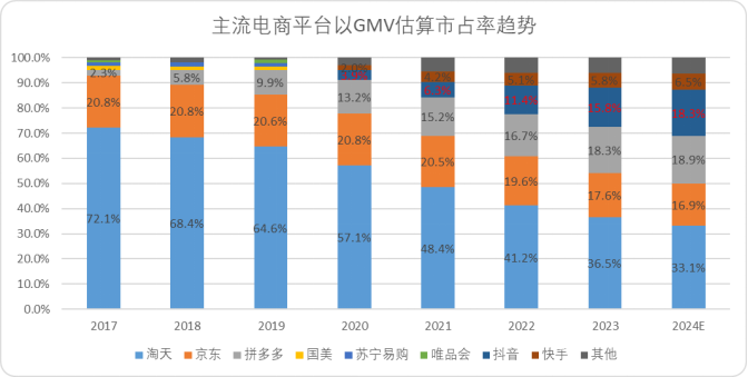 7,是一个神奇的数字。某种程度上,我们的人生境遇都是被“7”所统御: 倘若将财富阶段进行切割,22岁毕业为原点,我国平均初婚年来为29岁(28.67岁),正好是7年财富变化的周期;而35-36岁,正处于刚需购房年龄平均期,也是所谓中年就业瓶颈;两个7年周期后50岁阶段,儿女面临大学就业新一轮周期,自此形成第一轮闭环;57岁是中国实际平均退休年龄,财富增量和储蓄的关系再一次发生变化,形成一轮大闭环。 ![]() 图:人生财富积累7年维度的各个阶段,来源:锦缎研究院 也就是说,对于一个普通人,财富转化代际大约就是7年一周期。市场经济作为以人为参与节点的活动,它的周期嬗变,亦因此紧密相连。 最近7年,对这一规律感触最深的行业,当属汽车与电商:过去7年间,与普通消费者密切相关的经济领域内,发生明显自然迭代转变的,就是这两个类目。 以电商为例: 2017年正值电商壮年,当年的双十一成交额首次突破2000亿大关,除传统豪强淘天京东外,,商超转型的苏宁国美,小而专的购物平台当当、唯品会、网易考拉均能占据一席之地,电商龙头们百花齐放,各路捷报层出不穷。 反观今年的618,昔日的电商龙头平台们一改往年宴宾客、高楼起的喧哗,默默地淡出了大众的视野,有很多电商玩家早已淡出了历史舞台,就连霸主阿里,也不复当年之勇,市占率下降了近一半。 反倒是依赖内容、技术半路杀出的抖快等短视频平台,分食增量的市场份额。 今来古往,所有的变化都是在潜移默化中发生。我们今天来探讨下:之于电商,短视频究竟改变了什么? 01、中国电商的2017—2024 迄今,自2018年抖音尝试短视频商业化的各种模式以来,正好跨过了一个消费代际。而这7年也正是电商行业受短视频为首的内容行业冲击最大的阶段。 寻根溯源,我们先从数据层面来审视,7年间电商市场出现了哪些变化。 宏观层面: 近两年电商产业的主流叙事带来的印象就是萧条,每逢618或着双11,总会冠以“最惨”“最黯淡”的名号,让人不经怀疑电商市场是不是早已迈入下坡路。 从电商宏观来看,却是另一番景象。 1、国内电商市场规模 过去7年间,国内网上实物零售的规模由7.2万亿增长至15.4亿翻了一倍有余。从增速方面看,受累于高基数的压力,自2020年开始增速降至10%左右,今年一季度放缓至1%,4-5月强势反弹,增速重回10%规模线以上。 从增量来看,2023年以来网上实物零售额增加1.64万亿,超过了2019-2022年的增速。从规模角度来看,电商市场还远未到面临下行的严峻时刻。 ![]() 图:2017-2024实物网上零售额及增速,来源:Choice金融客户端 但如果以消费者的视角出发,电商市场确实处于潜移默化的变化中。 2、消费者群像 过去七年间,参与网购的用户规模从5.33亿增长至9.15亿,以网上实物零售额与网购用户规模的比值来看,人均年网购金额从1.35万元增长至1.69万元。 但从物流行业的数据来看,虽然业务量和运转销量均有提升,但最明显的变化,就是单一包裹价值(网上实物零售额与快递业务量比值)从178.13元下降至116.8元,多频低价似乎成为网络零售的新趋势。 ![]() 从咨询机构统计的网购用户平台抉择因素,也可以的出相对应的结论。无论是售前相关的信誉度、口碑或是售中售后的客服、物流乃至整个支付体系,所有的决策链路影响力都在下降。 只有价格成为过去几年中唯一增长的决策因素,多快好省的奥义似乎只有“省”在发光发热。 ![]() 以2023年度热卖商品的价格趋势来看,成交指数排名TOP2000的商品中,90%的商品低于50元,而“9块9”的商品占比高达38%,电商行业也逐渐迈向理性繁荣。 ![]() 消费类目的变化可以总结为从头部转向长尾,因为缺少2017年具体的数据,我们以2019年商务部发布的《中国电子商务报告(2019)》为基数来看,头部的CR5占比由65.2%下降至62.6%,CR10品类占比由90.9%下降至86.4%。 长尾需求和定制化的产品在电商平台发展迅猛,包括体育用品、金银珠宝、五金电料、建筑装饰乃至酒水等等传统渠道占比较多的实物类目,逐渐迁移至网络经营。 ![]() 微观层面: 4、平台竞争变革 各个电商平台格局在过去7年间发生了天翻地覆的转变,行业市占率经历了较大规模的洗牌,整体的格局从一超一强,多点分散,转变为多巨头格局割据,但头部企业数量明显下滑。 2017年正值淘天的巅峰期,以GMV估算市占率高达72.1%,京东占据20.8%,卖场转型的国美苏宁分别占据一席之地。 2024年,淘天的预估市占率下降至33.1%,拼多多成为行业老二占据18.9%,抖音18.3%,京东下滑至16.9%,除去相对割据的美团,其余传统卖场很难再取得超过1%的占有率。 ![]() 5、三个消费代际差 值得一提的是,过去7年间我国的网民结构发生了翻天覆地的变化。移动互联网的普及带来了大量50岁以上网民,占比从9.4%增长至32.5%。 ![]() 图:我国网民结构变化趋势,来源:Choice金融客户端 如果以7年一个消费代际计算,2017年的互联网主力是30岁左右,当前是50岁以上群体,差距在三个消费代际左右。 6、供给侧的变革 过去7年间供给侧的变革基本贴合了需求侧的变化 最明显的差异性是,白牌或“新”品牌登上王位。2017年电商平台主要的营运逻辑在维系客户盘,抬高客单价;2024年几乎所有的电商平台都在讲低价,国货。 数据层面并没有直接披露印证白牌数据占比提升的直接数据(毕竟大多数SKU只要上架都会给自己注册个商标),但我们从代营运(主要目的是提升长线品牌价值和服务)和营销服务