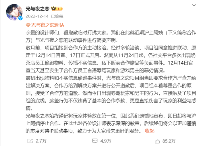 来源:DataEye 近期,茶饮品牌与游戏联动频繁。 今年3月,《光与夜之恋》与喜茶联动,让玩家与可以同自家“纸片老公”扯证; 4月,《崩坏:星穹铁道》与茶百道联动,活动还没开启就先登上了热搜; 6月,《恋与深空》与茶饮品牌古茗联动,《王者荣耀》与益禾堂联动。 其实,茶饮品牌近几年的花式IP联动已是屡见不鲜,游戏、动漫、影视剧、明星都成了新茶饮品牌冲销量和保持热度的助手。在这其中,能够打破圈层,提高曝光度的当属与各种二次元作品的联动。 出圈,有,翻车,也有。为什么茶饮品牌会成为游戏联动首选?出圈者靠的是什么,翻车者又做错了什么? 今天,DataEye研究院从厂商案例、本质剖析、未来趋势三个方面,聊聊“联动”这回事。 一、联动不断,风波不断 DataEye研究院统计了近一年以来,游戏厂商与茶饮品牌联动的案例(部分): ![]() 针对热度较高的“联动”案例,我们具体来看: 《未定事件簿》与茶百道联动,茶百道旗下不少门店爆单,工作人员甚至还临时拉来其他新茶饮品牌员工来救场。 甚至在活动开启前,有不少玩家目击到茶百道员工连夜背题,打包时更是充满了求生欲,生怕拿错对应人物的正确物料,毕竟就像员工自己互相提醒的一样,拿错物料相当于给玩家发错老公。 ![]() 去年12月,《恋与制作人》同Coco都可推出了对应李泽言、周棋洛、白起、许墨、凌肖5位男主的饮品,随活动套餐赠送的拍立得小卡、亚克力相卡、旋转立牌周边的质量超乎预期的好。 除此之外,活动前期CoCo还对全国门店的员工进行了严格培训,让员工们能切身地感受并理解制作人对男主的情感,避开“雷区”。 ![]() 喜茶与《原神》联动,不仅店员忙,看着机器不停地往外突突,直呼:“根本做不完”。 消费者也特别忙,想领游戏里原石和尘歌壶家具的,得去小程序答题,题目还是随机的,刷题需要时间,为了互帮互助,网友都整理题目答案合集了。 ![]() 今年3月《光与夜之恋》联动喜茶,“打了一场翻身仗”(22年底与沪上阿姨联动,可是踩了个轰隆响的大雷。)。延续“喝喜茶,领喜证”的节日喜悦传统,本次联动推出了“喜证”及人物合照透卡,让玩家与可以同自家“纸片老公”扯证。 ![]() 今年4月,《崩坏:星穹铁道》与茶百道联动。而早在3月,茶百道发布一则微博“谁懂,最近看到这个就想翻一下”并配图两张垃圾桶图片,立马“引爆”全网。 ![]() 不过这次的联动还是遭到了很多玩家吐槽,主题店少就算了,打卡点覆盖城市也那么少,买两杯只送一份贴纸,还是限量的。 今年6月,《恋与深空》与古茗联动,不少玩家在微博表示:“溜玩家从3月溜到6月,期间穿插着周边泄露和员工剧透,活动还没开始古茗就开始道歉了,而活动开始后,有网友表示,古茗以往也与其他品牌IP进行过联动,但都比这次要更加用心,而且在长达3个月时间后,做出来的产品画面质量低、备货量少,让人觉得很敷衍。 结合近一年以来游戏与茶饮品牌联动情况来看: 1、联动合作共计有13款游戏,其中乙女、二次元游戏占比较高,分别为5款和3款。 2、6款游戏与茶饮品牌联动话题热度破亿,3款游戏话题热度在5000万以上一亿以下,1款游戏在4000万左右,仅2款游戏热度没有突破千万大关。 但总体而言,游戏与茶饮品牌联动都能在活动期间为双方带来一定热度,而热度较高的游戏还是主要集中在乙女和二次元。 二、品牌变现,联动成为双赢的手段? 品牌联动本质上是一种主动破圈、扩大品牌声量以吸纳更多用户的手段。 从联动的游戏来看,多数还是以乙女和二次元为主。 之所以这两类游戏会如此高频的与茶饮品牌合作,一是因为,游戏的消费市场、用户规模、付费能力都发展到不可忽视的地步。二是拥有类似的圈层消费人群,相对来说合作适配度比较高。 首先在用户规模上,据《2022年中国游戏产业报告》显示,我国游戏用户规模6.64亿,游戏已然成为Z世代年轻人互联网生活中的重要组成部分。 研究报告预计,未来五年内游戏内容产业规模将突破千亿元人民币,其中动漫产业占比将超过44%。 其次,游戏用户已逐渐具备消费实力。当初那群成长于移动互联网时代的Z世代人群已逐渐步入社会,具备更高的消费能力,对于游戏文化内容消费需求自然也是持续增长。 此前,蜜雪冰城新品“糯香柠檬茶”因酷似少女的臭脚袜子泡水味,被《明日方舟》玩家抢到脱销,虽然品牌与游戏并没有联名,但也 由此可见,玩家具备一定的消费实力,也愿意为自己的“兴趣”、“好奇”买单。 DataEye研究院发现,每当游戏官宣和茶饮品牌的合作,社交平台上就会有很多玩家寻找同城的“打卡搭子”,可以一起参加线下活动,帮忙拍照。 ![]() 乙游、二次元玩家其实很难在现实生活中获得认同感,相对来说游戏中的同伴会更容易让玩家产生惺惺相惜的情感,因为她们喜欢同一种文化,志同道合,所以经常能看到乙游玩家在社交平台上求搭子,本质上就是在寻求一种认同感,而线下的联动活动作为一种渠道将线上玩家连接起来。 两方受众群体均偏向年轻化,乐于尝试和接受消费市场上的新鲜事物,拥有对未知圈层的探索欲及好奇心;其次,身处个性化消费时代,年轻群体的解压方式多依赖于正向的“情绪消费”,玩转社交媒体的他们是双方品牌都易转化的目标受众。 因此,这一类型的联动天然地能够为新茶饮斩获流量。 短期来看,活动产品的热销印证了联动对销量的助益,社