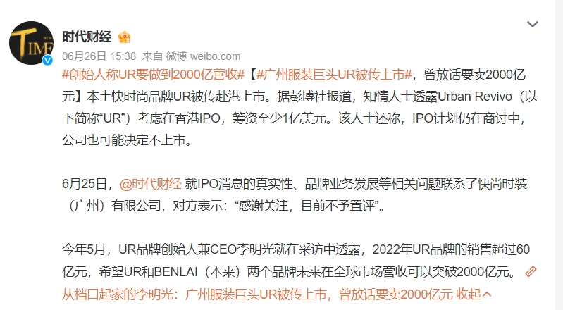 作者 | 刘亮 编辑 | 趣解商业财经组 近日,媒体报道有知情人士透露称,快时尚品牌URBAN REVIVO(以下简称“UR”)正考虑赴港上市,筹集资金至少1亿美元(约合人民币7亿元);该人士还称,IPO计划仍在商讨中,公司也可能决定不上市。 对此,UR方面对媒体表示称:“感谢关注,目前不予置评”。 ![]() 图源:微博截图 今年5月,UR品牌创始人、CEO李明光就在采访中透露,2022年UR品牌的销售超过60亿元,希望UR和BENLAI(本来)两个品牌未来在全球市场营收可以突破2000亿元。 如今传出IPO消息,这个被视为“中国版ZARA”的服装行业独角兽企业能否打动资本市场? 01.ZARA的中国学徒? 2006年,曾经在广州做过外贸档口服装生意的李明光创办了UR,成为国内最早的快时尚品牌之一。也是在这一年,全球快时尚品牌巨头ZARA正式进入了中国市场,售价在百元左右,漂洋过海而来的潮流时尚服饰很快俘获了一批年轻人。 接下来的十余年间,“快时尚”风靡一时;乘着这股东风,UR也获得了资本的青睐。 据“天眼查”数据显示,2010年至2019年期间,UR主体公司“快尚时装(广州)有限公司”(以下简称“快尚时装”)共完成了五轮融资,其中不乏戈壁创投、红杉中国、景林投资、黑蚁资本等知名投资机构,还包含了两家服饰上市公司海澜之家和比勒芬音。 ![]() 图源:天眼查截图 值得一提的是,被传上市前,快尚时装发生了系列股权结构变化。 2022年11月,数名股东集体退出了快尚时装,由原先多股东持股模式转变为单一股东全资控股,调整完成后广州狮子座控股有限公司持有快尚时装100%的股份。 ![]() 图源:天眼查截图 而在2024年6月18日,广州狮子座完成了更名与增资,成为“广州时尚动势投资控股有限公司”。在UR最新宣传口径中提及的“全球时尚零售集团FMG(时尚动势集团股份有限公司)”就是这家公司。据“天眼查”信息显示,法人依然是李明光,但公开资料中已无法得知快尚时装背后的股东细节。 截至2024年6月26日,根据股权结构来看,FMG当前持有快尚时装100%的股份,该公司由时尚引擎(香港)有限公司100%控股。 ![]() 图源:天眼查截图 此次股东变更,也引发市场对其IPO上市的猜想。有业内人士表示,一般来说企业在计划上市前,部分股东集体退出,可能是为了精简上市主体股权架构,由大股东回购小股东股份;亦有可能是境内投资主体退出,改由境外投资主体进行IPO。快尚时装的股权变动符合这一现象。 ![]() 图源:罐头图库 UR的崛起离不开ZARA的引路,二者无论是在用户圈层,定价、服装款式还是上新速度都有的一拼,因此UR一度被称为“Zara的中国学徒”。UR创始人、CEO李明光曾经在接受采访时坦言,UR是ZARA在中国的验证者和受益者。 UR给自己的定位是“快奢时尚品牌”,目标用户是20-40岁的白领群体,产品定价则从几十元到上千元不等,但总的来说价格要略低于ZARA。 作为ZARA在中国的“学徒”,UR学到了ZARA的精髓——依托快速反应的供应链,做到款多量少、紧跟潮流、频繁上新,将快时尚和高效供应链管理相结合。UR在品牌定位上还做了进一步升级,定位在“快奢时尚”;在线下门店选址和形象打造上,不仅要大还要足够高端奢华。 “大店”一直是UR的开店战略。2006年,UR首家门店在广州正佳广场开业,占地超1000平方米,那个阶段鲜少有本土品牌开出超过200平大店。如今,UR已将店铺开到了上海、成都、北京、厦门、武汉、天津等一二线城市,平均店铺面积超千平,最大店铺面积达4400平方米。 02.青出于蓝胜于蓝? 近几年,H&M、ZARA、GAP等这些在国内曾经光鲜的欧美快时尚品牌,接连关店、或退出中国市场,不断上演败退。 根据ZARA母公司Inditex集团财报数据,2018年ZARA在中国内地的店铺数量是183家,截至2024年1月31日,仅剩96家,六年关掉了近百家门店。ZARA姊妹品牌Bershka、Pull&Bear和Stradivarius在2022年已经完全退出中国市场。 在市场增长明显放缓的趋势下,UR却在逆势扩张,时至今日其开店速度还在持续攀升;截至今年5月,UR全球门店超过了400家。 ![]() 图源:罐头图库 然而成立已经十八年的UR,在成立的前十年都是亏钱的;早年,UR采取的策略是以规模换利润。直到2014年后,UR开放了特许经营加盟,在2014年-2018年间,UR平均以每年50家门店的速度扩张。 除了线下门店,UR还发力线上渠道,销售占比约30%;根据天猫“618”发布的榜单,今年“618”期间,UR在女装销售排行榜中排名第二,仅次于优衣库;在服饰店铺销售排行榜中排名第三,仅在优衣库、蕉内之后。 纵观UR能够逆势发展,重要原因之一是对时尚潮流风向捕捉和反应速度足够快。不过,快速扩张下,UR的设计风格变化也发生了较大变化;从刚开始有调性的小众品牌,逐步变成大众化的“快餐”品牌,这似乎也是快时尚品牌的通病。 2022年,UR曾深陷“抄袭”事件,因UR当季热卖款与多位小众设计师相撞而在社交媒体平台上惹来争议。 ![]() 图源:微博截图 UR还有被很多网友吐槽的一点是其所谓的“快奢”更多是体现在价格上,而非实质的品质提升。“月薪多少才能穿得起这个牌子?”在小红书上,有网友发笔记表示,“现在的快消品动不动一件上衣就299 399 499,裤子369 399 499,我真的买不起了。” ![]() 图源:小红书截图 “记得以前UR还简单高级,现在是换设计师了?而且价格比以前还贵。”有网友吐槽道。 在社交媒体上,还有很多关于吐槽UR衣服质量“以次充好”、品控不严,甚至是在官方旗舰店买到“假货”的帖子
