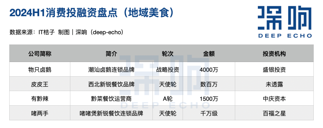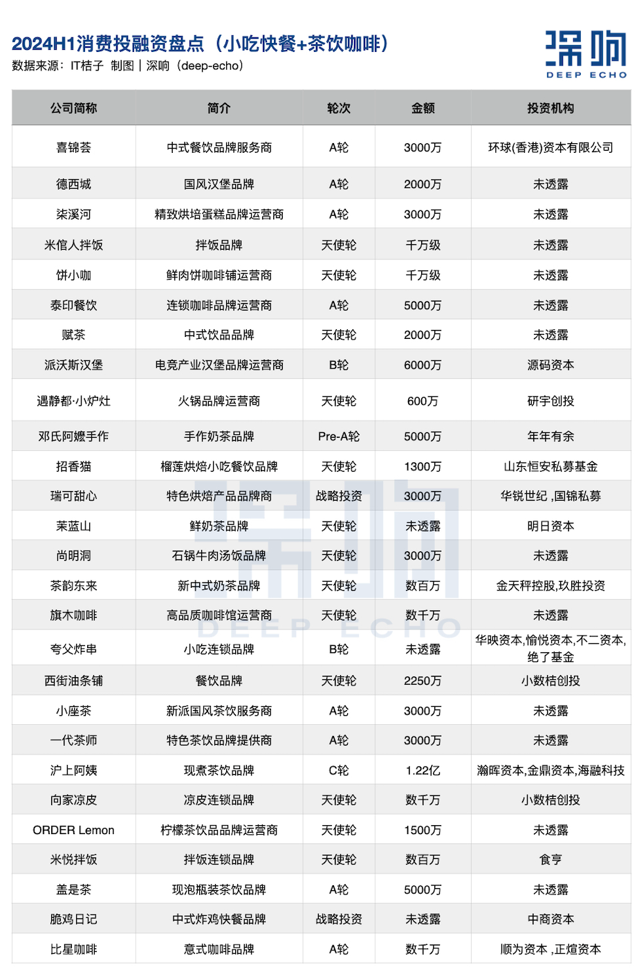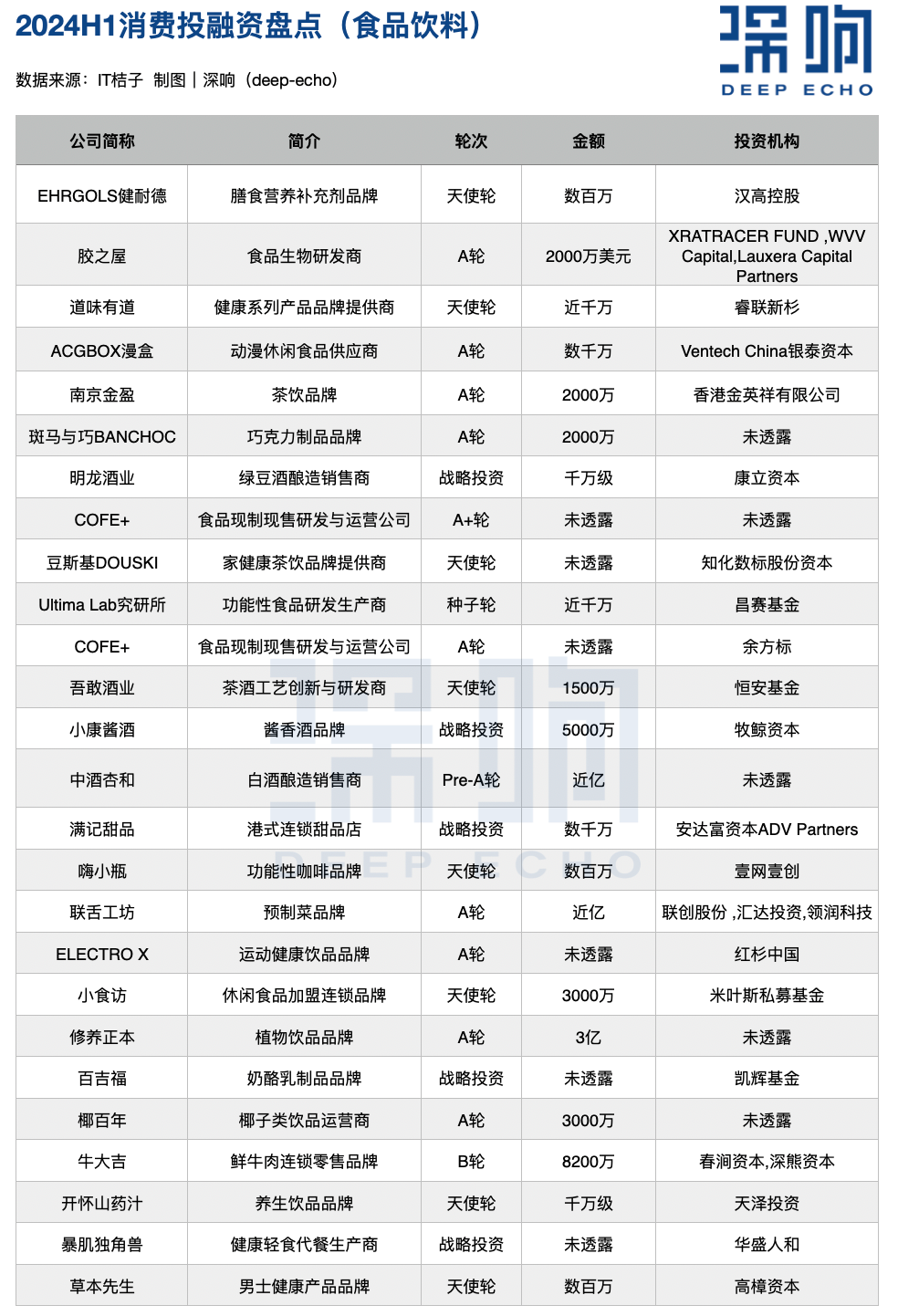 01、“运动功能”和“中式养生”,「健康」风潮的两个答案 「健康」概念盛行不是新鲜事。从“零糖零脂零卡”的元气森林,到各种即食鸡胸肉、植物基产品出现,再到乐事将“减50%饱和脂肪”作为推广重点,这股风已经吹了许久。 今年上半年,行业又有了新的变化。变化体现为:目前「健康」概念在食品饮料领域分化出了两种路数:一种是针对运动人群的功能性产品创新,另一种是围绕“中式养生”衍生出来的新产品。 红杉中国投资的“ELECTRO X粒刻”是第一种路数的代表。ELECTRO X粒刻主要的产品是天然苏打水和无香精电解质饮料,品牌以此为基础丰富产品线,匹配运动人群的不同需求(如在日常场景提供0糖产品,在高强度运动场景提供快速补充能量的产品)。 类似的项目还有即溶咖啡品牌“嗨小瓶”、轻食品牌“暴肌独角兽”。前者定位为功能性运动咖啡;后者则有高蛋白肉类、全麦烘焙类、慢碳主食类、灵魂调味类、轻卡冲饮类、减腹零食等品类产品。 在推广上,以上品牌都在借势运动项目或场景——ELECTRO X粒刻和骑行及跑步赛事(如2024北京半程马拉松赛事)有合作、暴肌独角兽和乐刻运动有联动、嗨小瓶也在试图开拓健身房、轻食餐厅等场景。 除了一级市场的资金流动,「深响」还观察到,广州线下便利店(711、喜士多等)冰柜的醒目位置多被无糖饮品占据,这些产品中既有新品牌,也有传统品牌做的无糖新产品(如:统一的无糖茶产品)。「健康」概念,正在塑造食品饮料行业新的样貌。 ![]() “中式养生”产品的逻辑则是:把传统的滋补产品、中医药概念和药膳逻辑,用新的方式“再做一遍”。 拿到融资的公司中,“胶之屋”的主打产品是即食花胶、花胶原液原蛋白肽;修正药业集团旗下的“修养正本”的产品是修正人参姜黄枳椇子植物饮品;“Ultima Lab究研所”的产品是针对护肝市场的“究护-小蓝片”和针对饮酒市场的“究护-酒神秘宝”;“开怀山药汁”用铁棍山药制作中式养生饮品,“康康哒”则主打中式养生萃饮。 “中式养生”项目更强调有滋补效果的原料和具有群众基础的“药食同源”逻辑。“草本先生”品牌从解酒产品切入男士健康赛道,今年一月获得高樟资本投资。公司创始人招勇曾提到,消费者更倾向于传统的药食同源文化,依赖食补来保健身体,“这与中国文化紧密相关”。 近年来,中医文化和药食同源在不同层面都得到支持,“中式养生”也因此不断出圈。相关的产品和项目,也在从“大健康”领域进入消费级市场。 02、“万店”趋势延续,地域口味崛起 餐饮业近年的变化和两个推动力有关,一个是万店连锁,另一个是“文旅热+社交媒体”。 万店连锁已经被讨论过很多次。相比美国,日本,中国的餐饮行业连锁化程度不高,拓展空间可观。与此同时,冷链和中央厨房的发展、加盟制的创新、行业数字化能力的补齐,种种变量都让“万店”愿景看上去不再遥远。 趋势中,标准化、易操作的饮品和刚需高频的小吃快餐,被认为是更有可能拿下万店王冠的品类。这一逻辑从去年延续至今。我们看到,中式汉堡、炸串、炸鸡、拌饭等品类仍是市场关注重点。此外,即使行业竞争强度居高不下,但茶饮咖啡仍是重要吸金赛道。 ![]() “文旅热+社交媒体”则让更多新品类得以快速增长。文旅热对应的是人的流动,社交媒体上的探店短视频和目的地图文攻略对应的是信息的流动。更广泛和深度的流动,让那些原本局限于地域的美食在全国收获影响力。 这方面最典型的例子是潮汕美食。在小红书、抖音、视频号等平台,随意一搜就能找到大量和生腌、牛肉火锅、卤鹅、肠粉相关的视频和笔记。急速膨胀的美食认知度,让相应的餐饮品类有了渗透更大市场的可能。 今年5月,潮汕卤味品牌“物只卤鹅”获得盛银资本旗下的泰兴盛银鲜食之都产业基金4000万元战略投资。根据公开信息,融资标志着物只卤鹅“正在积极加速拓展华东市场,向规模倍增的目标前进”。 类似的情况还有:今年1月获得融资的“啫两手”定位为啫啫煲新锐餐饮连锁品牌,啫啫煲是粤菜经典菜式,目前正成为粤菜小正餐中的新兴品类;主打黔菜餐饮的“有黔辣”今年1月获得A轮1500万元战略投资,贵州菜同样是近年在社交媒体上颇有热度的菜系。 ![]() 健康、运动、文旅等概念不只是在食品饮料和餐饮行业激起水花。从上半年的数据看,和这些概念相关的平台、场景和品牌也在收获融资。 运动健康方面,中高端连锁健身服务商“古德菲力”上半年完成近2亿元C轮融资;社区智能健康平台“坚蛋运动”完成了由贵州文投领投、麦纯电商跟投的数千万元A+轮融资;女子塑形健身舞蹈学院运营商“集美文化”完成了天使轮融资。文旅方面,酒店/民宿经营商(如“知遇知寓”、“蓝畔酒店”)、民宿管理系统服务商(如“来单啦”)、旅游服务提供商(如“集食玩乐”)均有融资动作。 项目投资方里也出现了有意思的角色,如Keep、小红书、携程。它们都是线上平台,也都身处文旅和运动浪潮中。Keep投资了瑜伽服品牌“tan theta”、小红书战略投资了酒店民宿管理系统平台“订单来了”,该项目也得到携程的追加投资。 各种动态反映的是:运动和文旅赛道正在释放新活力,行业需要更多符合新兴需求的供给。这既带来了新品牌的成长机会,也让线上平台有更多延伸的可能,比如Keep向消费品牌的布局