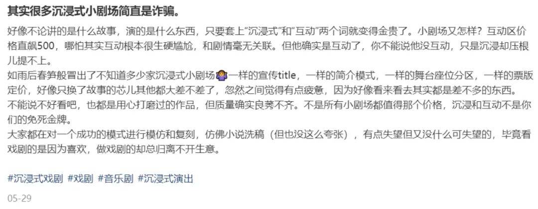 作者|夏夏 戴上面具即可化身幽灵穿梭在20世纪30年代的复古酒店之中,跟随麦克白狂奔或是看女巫起舞; 购买一张“船票”,便能登上《三体》世界里的“万有引力号”,亲历太空危机,决定太阳系命运; 坐在理发店内却突然遭遇一场谋杀案,需要作为目击证人探寻线索,找出真凶…… 这些新奇体验的来源并非剧本杀,也不是主题乐园,而是来自于时下深受年轻人喜欢的沉浸式戏剧。 在社交平台上,有不少剧迷发帖介绍自己的“入沪连打”经历:四天十一场、七天十场、十九天二十五场,即便做个“特种兵”也要在两天时间里连刷四部剧再离开上海。还有不少年轻消费者把走进沉浸式剧场当作是一种周末娱乐消遣方式,享受一段逃离现实、躲进奇幻世界或是异次元空间的闲暇时光。 沉浸式戏剧令一众年轻消费者“上头”的魔力到底在哪?在沉浸式剧场的带领下,沉浸式经济将迎来怎样的未来? 1、沉浸式戏剧到底有多上头? 沉浸式戏剧起源于数十年前的美国百老汇。彼时一群戏剧从业者试图对传统戏剧的场地设置、观剧规则提出挑战,尝试跳出原有的剧场空间,增加演员与观众的交流与互动,于是让观众更贴近表演区的环境式戏剧应运而生。 在环境式戏剧中,观众就坐在故事发生的场景里,不仅能近距离观看演员的表演,还能与演员互动。例如,被剧迷们称为“小酒馆”的《阿波罗尼亚》以及“小赌场”的《桑塔露琪亚》就属于环境式音乐剧。 ![]() *《阿波罗尼亚》剧照 而真正的沉浸式戏剧则是环境式戏剧的升级版,观众不仅身处戏剧故事场景之中,还能拥有一定的身份,可以掌握推进剧情发展的线索,甚至左右故事最终的结局。 例如在上海版《不眠之夜》中,观众可以灵活地在麦金侬酒店中走动,跟随不同的角色解锁不同的剧情。在一些推理悬疑题材的沉浸式话剧中,观众还需要面对一众专业演员的演绎,投票找出真凶,可谓是加强升级豪华版的“剧本杀”。 由于环境式戏剧和沉浸式戏剧具有一定的先锋性,所以在诞生最初并未得到广泛的推广。直至2011年,英国实验戏剧公司Punchdrunk以莎士比亚著名悲剧《麦克白》为蓝本在纽约曼哈顿制作出《不眠之夜》(Sleep No More),以装置艺术和肢体戏剧的结合带来了开创性的视觉冲击,颠覆了传统剧迷的认知,成为了沉浸式戏剧的鼻祖之作。 2016年,上海文广演艺集团历时7个月将北京西路上的一栋废弃建筑改建为6层楼、10000平方米的麦金侬酒店。《不眠之夜》中国版在此拉开了帷幕,并掀起了一波观剧潮。有数据显示,截至2023年上演7周年时,《不眠之夜》票房数据已经达到了4.7亿元,观演人数达55万,平均上座率超过90%。 目前,《不眠之夜》上海版已经连续演出超过1900场。由于其场景丰富、互动灵活,有着巧妙的主线、支线剧情,每位观众都能有不一样的探索发现,甚至说每一次观剧都能有新鲜的体验,由此吸引了不少剧迷反复刷剧。曾有媒体报道称,有死忠粉为了解锁多线剧情重复观看了280多次。 ![]() *《不眠之夜》剧照 在小红书平台,有网友为了解锁所有人物剧情看了十次左右后表示,“在我看来,沉浸式戏剧更像是你本人即为导演,以双眼为镜头剪辑出自己所见的剧情,因此每一天,每个人,每一次的体验都是不同的”。 戏剧从业者小D向惊蛰研究所介绍道,“近两年,沉浸式戏剧在国内的流行,跟体验式经济、场景化消费的兴起等有关。它的特点是通过人与人之间产生联系、产生互动的方式,让更多观众参与进来。譬如打破传统表演空间,打破‘第四堵墙’,在各种非剧场环境来演绎剧情,也是一种沉浸式体验”。 大投资的《不眠之夜》为观众提供了广阔的空间,让观众能够自由跟随演员走动,而轻运营的《阿波罗尼亚》等沉浸互动式剧目则选择在容纳人数在100-200人左右的小剧场内进行驻场表演。虽然小剧场的表演空间有限,但能使观众离演员更近,也让观众身临其境地融入戏剧场景之中。 戏剧科普账号“云歌的一排一座”的作者“喵喵哒”告诉惊蛰研究所,“小剧场的好处是可以让观众离演员更近,他就在你眼皮底下进行表演。在《阿波罗尼亚》《桑塔露琪亚》中,整个布景就像一个真实的酒馆或者赌场。位置最近的观众就坐在赌桌的周围,赌桌就是舞台,演员就在你面前唱跳。有些时候,演员还会跟观众进行互动,比方说把麦克风递给观众,而演员根据剧情人设随机应对。这是观众在小剧场当中才能获得的独特体验。” ![]() *《桑塔露琪亚》座位图 2、票价不菲,剧迷难逃“被割” 大型沉浸式戏剧用恢弘广阔的场景搭建、专业的演员团队、精心设计的剧情脉络以及出色的互动性,为观众带来了极致震撼的视听体验,而高昂的票价同样“震撼人心”。 去年12月,剧迷们还在争辩《不眠之夜》790元的票价到底值不值。到了今年7月,《不眠之夜》的工作日全场票已经涨到890元,周末场全场票涨到了990元。 此外,依托上海影视乐园而建,具有4组剧情主线、15条人物主线、100多条支线剧情、70余位专业演员参演的大型原创沉浸式戏剧《新世界庄园》,其入场券价格也高达799元。与之相比,北京环球影城的旺季单日成人票的票价也不过638元。 ![]() 如果说这些大型剧目的高票价是在转嫁投入成本,小剧场上映的“高价”沉浸式戏剧,更像是在精准收割剧迷。 北京77剧场上演的全景沉浸互动剧《大真探赵赶鹅2》票价分为288元、388元、488
