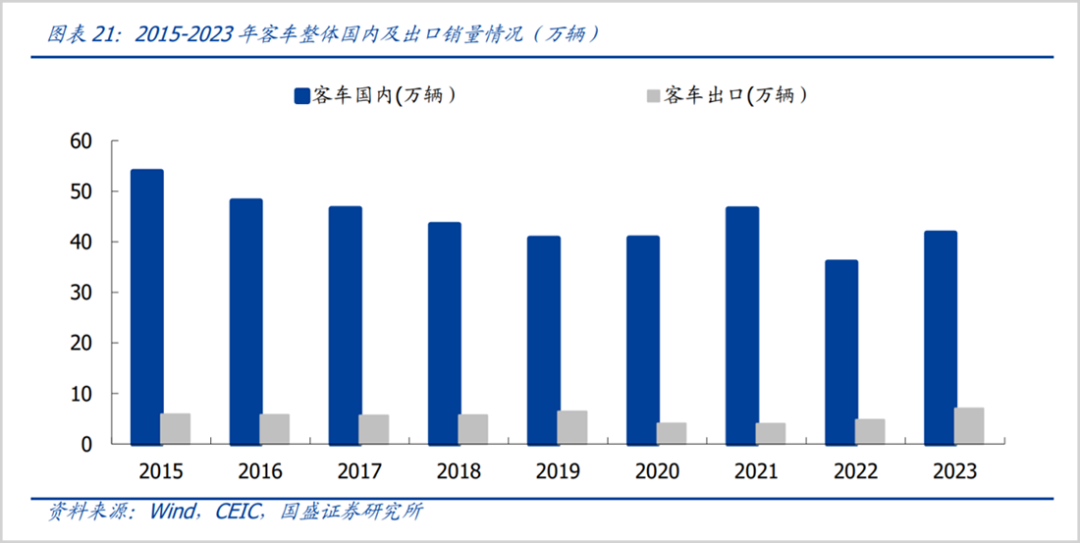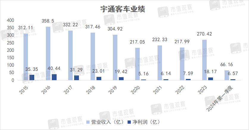 7月9日,中国客车龙头宇通客车发布2024年半年业绩预告,预计实现归母净利润15.5亿至17.9亿,同比增长了230%至280%。同时上半年累计销量增速35.82%,在去年同期30.84%增速的基础上,依然保持高增长态势。 作为传统白马股,在国内客车近乎是存量博弈的战场上,宇通客车自2022年4月以来的两年多,股价从不足6元一路爬升至目前的24元左右,足足翻了4倍。 市值观察认为,在这背后,是宇通客车在海外市场、新能源和高端领域角逐的共同结果。 01、客车龙头回来了 卫生事件后,2023年国内客车行业迎来复苏。 客车作为整车行业的重要细分领域,近年来因为国内高铁、城际铁路及私人汽车的快速普及,市场不断受到挤压。 ![]() 从上图可以看出,从2015年之后国内客车的销量逐年下滑,当年销量约55万辆,到2022年就已经降到了36万辆,下滑幅度超过了30%。 对于国内客车市场的复苏,主要由于公共出行的恢复和旅游市场的复苏,2023年销量回升至41.8万辆,同比增长了16%,已恢复至2019年水平,但距离2015年前期高点仍有不小距离。 在国内市场复苏的同时,海外市场也在发力。据国盛证券研究,2022和2023年客车出口量分别为4.8万辆、7.1万辆,同比增长了21%、47%,明显跑赢了国内市场。 而宇通客车作为行业龙头,随着行业的回暖,业绩也开启了高增长模式。回看其历年业绩,2016年是分水岭,业绩开始进入瓶颈期。尤其是2020年,净利润曾一度大跌了73.43%至5.16亿。 ![]() 进入2023年,宇通客车实现净利润18.17亿,同比大增139.36%,规模接近2019年,2024年一季度继续高歌猛进,实现营收66.16亿,同比增长了85.01%,净利润则同比大增超440%至6.57亿,增速在六大客车上市企业中排在首位。 需要说明的是,2024年一季度宇通客车的净利润规模已创出了历年新高,甚至比此前2016年同期的3.79亿高点还多出了73.35%,按照2024年中报预报的业绩增长势头,全年业绩创出新高并实现高增长并不是难事。 对于宇通客车这样的传统客车龙头,近年来的业绩堪称“炸裂”,由此也成就了股价的巨大涨幅。在市值上也与同行拉开了差距。当前宇通客车的市值超过了560亿,而另外5家上市客车企业的市值尚不足百亿。 从市场份额的角度看,据中国客车统计信息网,2023年宇通客车在大中客市场份额达36%,处于绝对的龙头的地位,经过这两年的市值变迁,行业“一超多强”的局面已经形成。 而对宇通业绩做出主要贡献的,还在于海外市场。 02、海外扛起大梁 整体而言,当下国内客车市场仍以恢复性行情为主,销量距离2021年仍有差距。且国内竞争依旧激烈,除了宇通、中通和金龙等几大传统龙头外,还包括比亚迪这样实力强劲的整车龙头,以及海格、申龙、金旅等众多地方性品牌。 因此,当下国内客车行业更趋向于存量竞争,海外市场就成为了企业新的博弈点。 而海外市场同样是宇通的业绩亮点,且已成为其业绩增长的“发动机”。 就在2016-2023年期间,宇通客车的国内销售收入不断萎缩,由299.1亿下降至137亿,收入占比由87.9%大幅下降至50.7%;海外收入则由41.2亿提升到了104.1亿,收入提升了1.5倍,占整体营收比重也由12.1%提升至2023年的38.5%,预计将很快超过国内收入,有效对冲了国内需求下滑的影响。 ![]() 反映在销量上,2023年宇通共实现客车销量3.65万辆,其中国内销量2.64万辆,同比增长7.5%,出口销量1.01万辆,同比增速达78.87%,2024年前5个月的出口量增速也达到了64%。出口已是公司销量增长的重要驱动力。 提到海外市场,就不得不提新能源客车。在整车行业新能源转型大潮中,新能源客车同样是推动行业增长的一股新兴力量。 然而,与家用车的新能源转型所不同的是,国内新能源客车主要以城市公交为主,此前由于政府的补贴政策使得新能源公交车需求提前释放,随着补贴政策的退坡,新能源客车需求也在减缓。 据国盛证券统计,2016年新能源城市客车销售量超过了10万辆,到2023年便缩减至仅有3.5万辆。因而新能源客车的看点还是集中在海外市场上。 目前,海外新能源客车市场仍是一片蓝海。据国盛证券统计,海外新能源客车销量从2017年的0.1万辆提升至2023年的1.9万辆,期间复合增速约63%。渗透率由不足2%快速提升至2023年的10%以上,未来提升空间仍然较大。 ![]() 在新能源客车的海外市场中,欧洲是第一大地区,这主要得益于当地新能源技术的快速发展、环保监管和对新能源产业的扶持。在2020-2023年间,欧洲的新能源客车销量的复合增速达到了39%。 而国内车企基于新能源产业链优势、较短的交付周期和较高产品品质,在全球处于“统治”地位。2022年,中国新能源客车的产销量占全球总量比重就已经超过了95%。 对于欧洲新能源客车市场这块大蛋糕,各大车企也加快了攻城略地的步伐,其中比亚迪是领头羊的存在。据Sustainable BUS数据,2023年比亚迪市占率为13%,相比2022年有所下降;宇通市场份额为8%,排名第二位;中通客车则排名第三,份额为4%。同时海外车企的份额有所上升。 在整体的海外市场份额中,宇通客车在中大型客车上表现突出。据国盛证券研究,2024年1-5月宇通的出口量为0.5万辆,市场份额为28.6%,位居第一,已经超过了金龙系。同期宇通在新能源客车出口的市场份额达24.3%,相比于2023年的12.4%增幅近一倍,与金龙系的25.9%份额差距进一步缩小,实现赶超也只是时间问题。 ![]() 此外,据券商研究,2024年前5月宇通累计出口了4921辆客车,其中出口新能源客车941辆,同比大增了96%,出