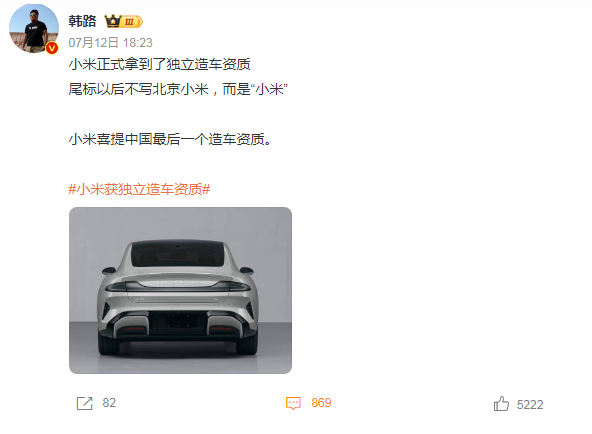 在7月12日,工信部发布了第385批《道路机动车辆生产企业及产品公告》。 这次的公告中,有四款小米汽车引起了人们的关注。 这四款车尾标已经由“北京小米”改为“小米”,企业的名称也由“北京汽车集团越野车有限公司”变更为“小米汽车科技有限公司”。 ![]() ●图源:工信部 这意味着小米汽车已经获得了独立造车的资质。 造车资质和销售资质全都拿下了,小米汽车这次终于是“名正言顺”了。 就是说有没有可能,十年后为了感谢小米汽车首批用户,持有“北京小米”的su 7车主获得全额退款呢? 01、华为“卖”问界,北汽“还”小米 一直以来,看着小米SU 7后的尾标都是“北京小米”。 联想到小米汽车自己的造车工厂建立在北京,以及把一国之都的名字加到车名上,既显得大气,也表明自己站队“国产”。 要不是“北京小米”将要改名“小米”,有多少人还不知道小米前面的“北京”俩字,其实指的是北京汽车集团越野车有限公司? ![]() 7月2日,华为将问界等商标外观等等设计专利,25亿全卖给了赛力斯。 华为没造车资质,近期5年也不打算有。 但小米汽车和北汽越野的合作,还不太一样。 北汽全程没有参与小米的造车,只供挂靠,小米汽车的质量和北汽更是一点关系没有。 而小米这边刚刚拿到造车资质,就已经着手从北汽手上拿回属于自己的“名字”了。 这下第一批车主真不知如何是好了,究竟是因为第一批“北京小米”而获得十年后的“全额退款”,还是导致二手直接掉价? 不过网友表示:不影响,反正车尾的字随便抠随便粘。 那,究竟是抠“北京”呢?还是抠“小米”呢? ![]() 新能源是中国汽车工业弯道超车最好的机会,国家大力扶持,外国测评也都是夸。 现在市场已经过了高速增长期,开始打价格战了,小米几乎就是卡着最后关门前进的市场,所以小米上来就有非常大的营收压力。 雷军准备了百亿的现金已经准备着亏损换市场了,幸好流量大,皆大欢喜。 倒是咱们自己作为新能源电车发展的率先受益群体,一边骂一边喊着“真香”。 不过把新势力拉出来比,有谁能像小米一样,第一款车上市能有十多万销量,三个月能有3W左右的交付量? 这种实力后面还有没有不知道,在此之前肯定没有。 02 “朱雀计划”,为小米开绿灯? 一位汽车大V发文表示,小米已经取得了中国最后一个造车资质。 ![]() ●图源:微博之所以说小米获得了国内最后一个造车资质,是因为国家已经停止了造车资质的申请,并且限制了这种买卖关系。 牌照不能交易了,要有人注销了让出来,而且为避免产能过度集中还得是在没有大型车企的地区省份。 想必也是很难有企业能撑得起一系列苛刻要求了,有牌照的就算“卖身”代工苟活估计也不会放弃牌照吧。 据消息人士透露,是注销了宝沃资质,给了小米。 且在北京市以特批的方式帮助下拿到的,雷军在发布会开场第一个感谢的就是北京政府,其含金量可想而知。 对北京车企的关照,还得从2018年上海市引入特斯拉说起,同年北京就提出了“朱雀计划”。 ![]() ●图源:2022两会政府工作报告在汽车行业,可以看出我国南方的广东已经出现了比亚迪,而东方的上海已有特斯拉,西南的成渝地区也拿出了像问界、阿维塔、深蓝等一系列品牌。 唯独在我国上方的北京,居然在高附加值产业的新能源汽车时代打不出一张牌。 京津冀的新能源汽车产业能不能干长三角和珠三角,就看小米了,能不开绿灯吗? 小米与理想汽车作为朱雀计划的代表企业,理想已经在新势力电车排行老三,去年盈利百亿。 现在该照顾照顾小米了。 ![]() ●图源:小米官方对于后加入的车企来说,造车资质一直是个卡脖子的问题,解决办法大概有两种: 要么是花巨资收购销量不太好的老车企,要么是选择传统车企“代工”,理想和过去的小米就是两种方式的代表。 拿下独立造车资质,从设计到研发,再到生产、销售和服务,全都自己说了算。 当企业涉足海外市场时,拥有独立的造车资质将成为品牌形象的重要支撑。 避免被不知道内情的消费者,扣上“贴牌车”的帽子。 03、小米的第三款车开进了自行车赛道? 近日,一张疑似小米官方流出的海报现身于网络。 据图片消息,这是款公路车全碳车身,破风车架,价格只需1999元。 ![]() ●图源:微博 放眼市面上的全碳公路车,标价基本都是七千起步,想都不敢想的价格。 小米公路车也能来一波“价格大跳水”? 网友们纷纷拿着这张图,向小米集团公关部总经理王化发起“灵魂拷问”。 结果王化发微博表示:“网友们玩梗的玩笑,大家大可不必当真。” ![]() ●图源:微博 玩笑就开到这里,不过军爷干一行,革命一行可不是随便说说的。 小米的第二款车,第三款车,确实都有隐隐透漏过。 第二辆车是SUV,已经有越来越多消息,甚至流出新车外观渲染图。 对标理想L7/8/9,且售价区间会比理想汽车产品更低。 ![]() ●图源:网络 小米第三款车则是指向增程式,主打家用市场,2026年发布。 这个信息虽然未经官方证实,但是从销量、盈利、用户体验几个层面来说,可能性还是相当大的。 在新能源的赛道上,虽然燃油车日渐式微,但不少品牌的纯电销量也正遭遇滑铁卢。 而真正扛起新能源增长大旗的,当属那些风头正劲的插混车型。 不过小米真正厉害的是底盘调教,第一款SU 7就超过大部分新能源车,有传统欧洲车好开的感觉。 增程式既保留了纯电车型的驾感,可油可电又