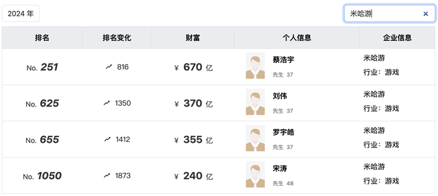 资本市场的魅力在于,一个人永远不知道自己能走多远,同时也不会知道,一个富豪坠落的速度有多快。 遥想十年前,黄仁勋在小米的发布会上卖力喊着“小米,威武”的时候,谁也不会料到十年后的今天,英伟达能够成为世界上市值最大的公司之一。 人生的无限可能性,都能在资本市场上得到合适的价码。唯一不变的是,后来者总能超越上一代,造就属于自己时代的财富。 2023年之后,中国互联网圈发生了几件大事,字节营收超越了腾讯,拼多多的市值超越了阿里。 在这种“新老”交替之下,一个新的时代已经来临。 2023年10月,一则工商变更将几位80后推向了台前,同时米哈游这个名字也彻底的曝光在了资本市场的聚光灯之下。 一时间,蔡浩宇、刘伟、罗宇皓成为了焦点人物。 据2024年胡润全球富豪榜显示,米哈游一共诞生了四位百亿富豪,分别为蔡浩宇、刘伟、罗宇皓以及宋涛,他们的财富分别为670亿元、370亿元、355亿元以及240亿元,年龄分布上,前三者均为37岁,而宋涛则为47岁。 ![]() 根据2023年胡润百富榜显示,四人财富基本变化不大,在国内的排名中,蔡浩宇挺进了前一百,位列第55位。如果不出意外,预计再过一两年蔡浩宇、刘伟、罗宇皓三人将全部挺进前一百。 作为一家成立于2011年的公司,仅用了十多年时间就造就了如此的资本神话,这是市场的魅力,也是商业社会的奇迹。但是如果你深挖全球的创业史,你就会发现这样的案例比比皆是,例如OpenAI创立于2015年、字节跳动成立于2012年、拼多多成立于2015年…… 时间并不会妨碍伟大的公司诞生,也不会成衡量他们的核心要素,只要产品足够的优秀,在移动互联的大时代之下,资本会助推他们成长,也许只需几年他们就能够惊艳全球。 所以我们社会只需要给年轻人提供更宽松、更便捷的创业环境,给予他们最大的宽容与支持,他们就能给社会更多的、且足以影响全球新时代企业。 二次元游戏巨头 早期的互联网创业,大多和宿舍以及仓库有关,尤其是硅谷创业。 后来,美国的互联网创业风吹到了国内,于是一些留美的学生,回国开启了互联网创业潮,在这批人的带领下,最终国内开始掀起了互联网的浪潮。 阿里、腾讯、网易等互联网巨头也都是在那个背景下,诞生在那个时期。 互联网的时代的商业,总是在加速,尤其是移动互联网的造富,甚至一日万里。 2010年之后,移动互联的浪潮,席卷全球,而国内则也开始同步升级。就这样,腾讯、阿里等巨头,开始搭上时代的便车,逐步成长成为巨无霸企业。 与这些巨头一起升级的,还有一批有思想的年轻人,他们跃跃欲试,也在更多、更新的领域向巨头发起了挑战。 而米哈游,则就诞生在这样的背景之下。 2011年,米哈游领头人蔡浩宇即将研究生毕业,在人生的十字路口,他没有选择找工作,而是萌生了创业的念头。于是,他拉着刘伟、罗宇皓在宿舍开始了创业。 ![]() 启动资金就是上海科创中心的10万元无息贷款。不得不说,人的创造力是无限的,有时候一个小的念头,就能造就一个商业史上的奇迹。 选择游戏创业之后,蔡浩宇将产品的定位定在了二次元方向上,而这一次的“豪赌”,也成为了日后火遍全网的决定性因素。由于当时市场主流游戏风格并非二次元,实际上当时蔡浩宇团队的压力还是很大的。 2012年,在经历过了无数艰难险阻之后,斯凯网络CEO宋涛投资给了蔡浩宇团队100万元天使投资,换取了15%的股权。 ![]() 而宋涛的这一笔投资,现在价值达到了240亿元。 蔡浩宇团队拿到这笔钱之后,米哈游上线了崩坏系列,随着游戏的不断改进,公司与用户之间互动加强,他们的团队开始进入稳定期。 2014年,《崩坏学园2》上线。 至此,命运的齿轮开始转动。2015年,米哈游引进了B站代理了《崩坏学园2》,二次元的风格也终于引起了VC圈的注意,而当年这款游戏的营收也突破了1亿。 游戏成功之后,米哈游开始出海,而这一步棋,也奠定了米哈游的江湖地位,尤其站在今天的角度,米哈游的出海简直是神来之笔。 超越网易 为了加快扩张的步伐,米哈游在2017年选择了拥抱资本市场,不过最终没能如愿,于是他们主动放弃了IPO计划。 2020年9月,米哈游推出了《原神》。 在《原神》的接力下,米哈游的出海所向披靡。到了2022年7月,《原神》海外版就以1.4亿美元收入稳坐出海美国收入榜首。 在强大的吸金能力面前,米哈游的估值也是水涨船高。而海外市场的成功,也成为了米哈游的核心竞争优势。 今年年初,腾讯CEO马化腾在公司年会上提到了游戏出海,称这是公司国际化最大的希望。 根据Sensor Tower发布的《2023中国手游出海年度盘点》显示,在2023年中国手游发行商海外收入榜中,米哈游继续排名第一位,其次是腾讯、三七互娱。 ![]() Sensor Tower数据还显示,米哈游2023年海外收入提升14%,创历史新高。具体游戏方面,米哈游旗下《原神》蝉联出海手游年度收入冠军,与此同时,2023年米哈游发布新游《崩坏:星穹铁道》空降榜单第3名,成为2023年收入增长最高的出海手游,也贡献了近40%的海外总收入,米哈游得以稳坐出海手游发行商收入冠军。 腾讯游戏出海收入连续第二年排在米哈游之后,蝉联出海手游发行商收入榜亚军。 值得注意的是,米哈游的营收超过了网易。 根据Data.ai公布“2024年全球发行商Top50”数据显示,腾讯连续七年位居榜首,米哈游2023年收入超过了网易,位列第八,而网易则为第九名。 据悉,米哈游团队已经超过