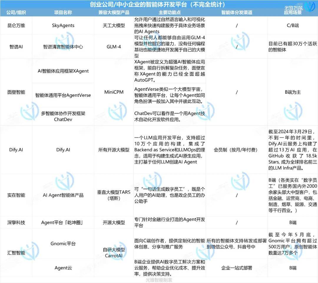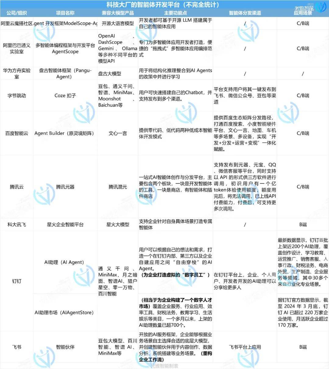 文|白 鸽 2024年已经过半,国产大模型的竞争也进入了白热化。 如果说大模型的上半场是在卷基础能力,那么中期的竞速赛中,AI Agent(智能体)的竞争已经被提上了重中之重的议程。 无他,智能体就是应用落地最重要的产品形态。 但从当前情况来看,国内外却已然走向了不同发展路径。微软和OpenAI的GPTs发展受阻,而国内却涌现出越来越多的玩家和智能体开发平台。 如字节跳动的扣子、腾讯云的腾讯元器、百度智能云千帆AgentBuilder、阿里云大模型平台百炼、科大讯飞星火智能体平台等。 除这些大厂外,包括智谱AI、面壁智能等大模型创业公司,容联云、思迈特等SaaS公司,钉钉、飞书等协同办公赛道企业等,都在加码智能体开发和应用落地。 无疑,国内大模型的下半场竞争,已经开始“卷”向智能体的开发和应用,并逐渐形成了一个多元化、竞争激烈的生态系统。 那么,微软和OpenAI这一行业风向标都没做好的智能体,为什么国内企业却如此看好?在这场智能体应用之战中,面对日益同质化的产品和服务,各企业又该如何卡位竞争? AI时代,智能体平台将成为主流的应用开发阵地,但面向C端的分发目前依然要依托当前的流量主阵地——抖音、微信、淘宝等,面向B端的分发则依然要通过各大ISV(第三方软件服务商)。 各家大厂争夺的依然是AI生态,而其他企业则聚焦在垂类场景的落地。 但在此过程中,如何让智能体真正用起来,实现商业变现,则成为考验各企业智能体开发的重要挑战。 一方面是面向C端的应用,智能体能够成为每个人的智能助手,真正的解决日常问题。另一方面则是面向B端企业场景应用,通过整合大语言模型、知识图谱、检索增强生成(RAG)、智能体和管理平台等关键技术和产品手段,为各类政企和机构构建“企业大脑”。 但从当前整个行业发展状态来看,随着微软放弃C端消费市场,Open AI的GPTs也未实现真正的商业利益共享,短期内,智能体在C端真正实现商业化落地的希望并不高,但在需求众多的B端企业服务中,或许能找到合适的落地应用场景,比如办公AI助手、销售助手、研发助手等。 大厂要生态,小厂要聚焦 目前,智能体赛道已挤入众多玩家。 ![]() ![]() 相比较来说,互联网大厂所面向的用户群体更全,聚焦的场景更广泛,目前更多的还在于让更多的用户能够使用其平台,不断扩大自身AI开发者生态,并借助自身在内容生态等领域的优势,为智能体的开发和变现提供渠道,如腾讯的微信生态、字节抖音、豆包、头条等。 而大模型创业公司,智谱AI在大模型能力上虽然全面对标OpenAI,但商业化却更倾向于走B端道路,所以其智能体平台虽然也支持个人开发者,但更多是引流获得更多用户的数据反馈,商业上倾向于做智能体+行业解决方案的落地。面壁智能则坚定地走向了端侧AI,智能体未来恐怕也是为端侧场景服务更多。 值得一提的是,在原有的企业服务赛道里,智能体焕发出了新活力。 在协同办公场景中,飞书和钉钉都已在智能体赛道进行布局。 此前,钉钉推出了AI助理服务,钉钉上的用户可以根据自己的想法和需求,打造一个在钉钉内部、第三方以及企业自建应用之间“自由穿梭”的AI 智能体。 除AI助理之外,钉钉此前还发布了AI助理市场(AI AgentStore),这就相当于为企业构建了一个数字人才市场,覆盖企业服务、行业应用、效率工具、财税法务、教育学习、生活娱乐等类目,一个多月以来,上架的AI助理数量已超700个。 而飞书则通过开放的AI服务框架,使企业可以根据业务场景自主选择合适的底层大模型,并创建智能伙伴用于内容创作、数据分析、系统搭建、研发助手等业务场景。 ![]() 此外,像容联云、思迈特等SaaS企业,此前也展示了自身在智能体赛道的布局和相关产品。 区别于上述企业智能体开发路径,SaaS企业更专注于垂类场景的智能体应用。如容联云的容犀Insight Agent(容犀IA)、容犀Virtual Agent(容犀VA),专注于营销、销售、服务等场景。 另外,还有一些专注于智能体开发的创业公司。 比如Dify.AI,成立于2023年5月,是一个基于LLM应用开发平台,支持超过10万个应用的构建,集成了Backend as Service和LLMOps的理念,适用于构建生成式AI原生应用,主打基于任何LLM都可以创建AI 智能体。 还有专门针对金融行业打造智能体开发平台的深擎科技;聚焦为企业开发虚拟“数字员工”的实在智能;既有面向C端智能体开发服务,又有面向B端企业提供AI数字员工解决方案和云服务的汇智智能等等。 由此也不难看出,在这场智能体应用的战场中,不同的企业所聚焦的场景不同,最终想要实现的目的也不同,大厂想要生态,小厂想要聚焦到场景。 于互联网大厂而言,更注重AI生态的构建,实际售卖对底层大模型和云算力的调用能力;而飞书、钉钉所争夺的,则是聚焦到了企业办公场景中,瞄准的是企业内部知识库的智能体化,主打企业数智化转型的一张牌。 容联云、思迈特等所争夺的,则是局部场景的进一步智能化,比如智能客服、智能投顾等。聚焦智能体的创业公司,也同样如此,虽然是推出了智能体开发平台,但更多的还是聚焦重点应用场景,推出相关智能体开发服务,所谋求的还是在场景中找寻智能体商业化变现路径。但相对于此前有积累的互联网大厂和企业服务公司,从0到1找场景、找需求是一件很不容易的事。 当前,诸多玩家已经在智能体赛道形成了多元化竞争格局,不同的企业依据自身的优势,聚