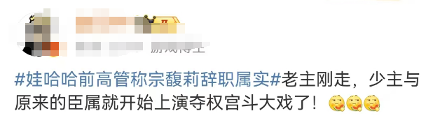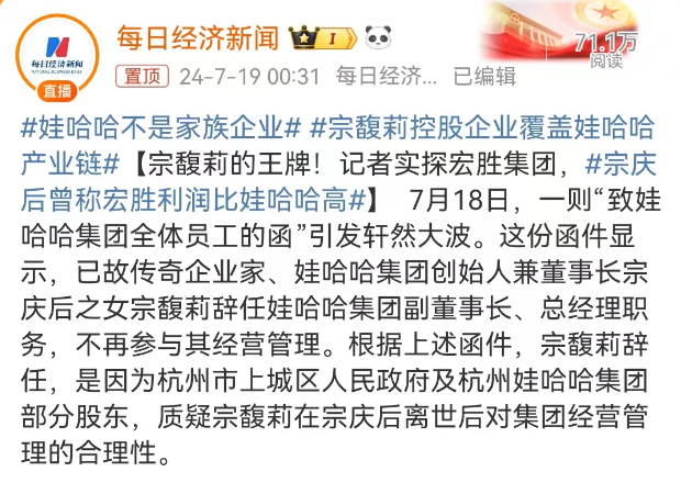 作者 | 杨阳 来源 | 顶尖广告 这两天饮料圈大地震。 一纸报告让农夫发飙,大家质疑:农夫山泉到底是什么水啊? 一封辞职信让娃哈哈发疯,网友迷惑:娃哈哈到底是谁的啊? 农夫山泉被香港消委会拱上热搜后,有人喊话娃哈哈,何不趁机攻城掠地。 可是娃哈哈等来的不是泼天的富贵,而是自己人泼冷水。 一夜之间,宗馥莉被曝请辞、被举报侵占娃哈哈国有资产、被叔叔背刺..... ![]() 图源:每日经济新闻网 1 刚刚过去的疯狂星期四,娃哈哈集团副董事长宗馥莉可以说是疯狂霸屏。 辞职信、举报信、宗馥莉、内斗......随便一个词都很炸裂。 娃哈哈可能到了危险的时刻,面临着“把娃干倒”的危机。 ![]() 先说辞职信。 宗馥莉自曝宗庆后董事长去世后,股东对自己经营管理提出质疑,无法继续履行管理职责。据传宗馥莉请辞前已博弈一个多月。 ![]() 图源:天眼查 要知道宗馥莉可是中国女首富、娃哈哈接班人,如今在网上掀桌子,让大家不淡定。 娃哈哈不是家族企业吗,老板怎么在自己家公司还能辞职啊? 真别说,天眼查显示娃哈哈并非家族企业,娃哈哈有三大股东。 最大股东是杭州上城区文商旅投资控股集团有限公司,持有46%股权,第二大股东才是宗庆后,宗家只占股29.4%。 ![]() 图源:天眼查 于是有人分析如果文商旅投和职代会联合,是可以终止宗馥莉职务。 有媒体向“娃哈哈上海办事处”电话的接线人员、杭州上城区等多方求证宗馥莉请辞传闻,未给出明确回应。 辞职还未实锤,又炸出一封举报信。 自称娃哈哈前员工,举报宗馥莉通过转移订单、转移资产等方式侵占娃哈哈集团巨额国有资产。(宏盛是独立于娃哈哈之外的一家公司,由宗馥莉单独掌管) ![]() 图源:第一财经日报 除了辞职信和举报信,宗馥莉还被曝卸任宏胜饮料集团董事长,宗庆后胞弟宗泽后出来回应是“好事”。 ![]() 图源:贝壳财经 宗馥莉娃哈哈这事,有人猜测宗馥莉在娃哈哈威望还不够,没得到老臣的信任和支持,在公司内部管理上和高层存在分歧矛盾...... 总之一两句话说不清,得让子弹再飞一会儿。 但一部分网友已经当起吃瓜群众,忍不住脑补一出“阻拦宗馥莉接班”的逼宫剧。 且不说精彩的商战往往以宫斗的形式展开。 娃哈哈还是个营收500亿的饮料帝国(2023年娃哈哈的业绩约为500亿元),这么大的蛋糕谁不馋呢? ![]() 对于另一部分网友而言,更担心的事情是: 娃哈哈承载着宗老一生心血,一个企业做到500亿实属不易,千万别把AD钙奶们作没了。 ![]() ![]() 还有的担心宗馥莉不能接班,意味着娃哈哈不姓宗,就不正宗了。 ![]() ![]() 2 网友担心娃哈哈走多远,一部分原因是关心宗馥莉接班人还能走多远。 宗馥莉就像是拿了大女主的剧本,一举一动都引起关注。 2024新财富500创富榜出炉,42岁的娃哈哈新晋掌舵人宗馥莉,凭借808亿元身价首次成为中国女首富。 800亿这个数字曝光后,也意味着宗馥莉从豪门千金迈向中国女首富。 说起来“中国女首富”称号也是众望所归。 宗馥莉接手娃哈哈后,网友曾喊话要把宗馥莉打上首富榜单: 喝水只喝娃哈哈,做人就做宗庆后,宗馥莉你坐稳了,送你上世界首富。 ![]() 图源:公众号范姐看世界 没想到你一瓶,我一瓶,果然助攻宗馥莉评上中国女首富。 宗馥莉不仅是女首富,还是个“单身女首富”。 大家不仅为宗馥莉“打榜”,还急着为宗馥莉“牵红线”。 宗庆后离开后,有网友不是催婚就是自荐。 ![]() 这就要说到宗馥莉另一个话题,宗馥莉微博常年不更,但评论区活成了大型求婚现场: 有人手里捧花,有人刷土味情话,有人自卖自夸,有人看得笑哈哈。 ![]() ![]() 互联网真真假假,吃瓜群众看看就好,不过娃哈哈赚了热度是真的。 关于宗馥莉的传说,不止是看不上“意中人”,还有看不上“代言人”,宗馥莉有自己的代言观。 这就要说到宗馥莉“上任第一剑,先斩代言人”。 2018年宗馥莉担任娃哈哈公关部部长,开除代言娃哈哈22年的王力宏,换上演员许光汉。 为什么换掉王力宏,也不像宫斗那么复杂,总结6个字:太老了、不喜欢。 这也一度引起争议,被评价狠狠打了宗庆后的脸。 要知道那些年王力宏代言娃哈哈,堪称是品牌代言人双向奔赴的佳话。 王力宏无名时,宗庆后选了他。 王力宏出名后,未涨过代言费。 宗馥莉不认同王力宏当代言人,也不认同自己当代言人。 这里要讲一个故事,宗馥莉2016年推出饮料品牌KellyOne(隶属于宏盛饮料集团),Kelly取名灵感来自宗馥莉英文名。 ![]() 图源:娃哈哈 就好比董明珠将格力手机开机画面,设置为自己的个人图像,宗馥莉用自己英文名作品牌名,难免让人猜想这是利用个人IP打造品牌。 但宗馥莉却回应:“我说过希望用职业经理人去做公司管理,不希望公司创始人等于形象代言人,我觉得这样是非常危险的,一个公司还是应该有正常的运作方式。” 不难看出宗馥莉是想低调的,但无论是个人管理还是捞男求婚的戏码,不断将宗馥莉推到大众面前,自然人红是非多。 3 事实上自从娃哈哈进入“宗馥莉时代”,网友为一直在为娃哈哈操碎心。 这不难理解,从娃哈哈儿童营养液、AD钙奶、娃哈哈矿泉水到营养快线......娃哈哈陪伴了一代又一代的消费者。 正如宗庆后说的“在中国只要有小卖部的地方,就能看到娃哈哈的产品。” ![]() 图源:零售商业财经 按理说娃哈哈的饮料矩阵已经够震撼了,但网友还是希望娃哈哈进入next level。 比如为娃哈哈的业