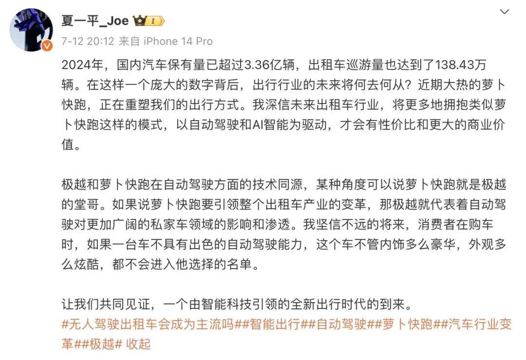 作者|陈 杰 进入2024年,自动驾驶行业热度陡然攀升,特别是7月以来,穿行于武汉大街小巷的萝卜快跑无人驾驶网约车持续刷屏,更是引发各方广泛关注。 价值破土,资本先行。受萝卜快跑成功运营影响,进入7月百度股价涨幅接近17%,并推动相关产业链——新能源车、无人驾驶等概念股的持续上涨。同时,继武汉、北京等地完成试点之后,上海开启无人驾驶出租车公测的消息,亦震动整个智能交通行业。 政策、大众、行业、资本市场为何对萝卜快跑,以及无人驾驶的热度居高不下? 答案很简单。尽管萝卜快跑作为新生事物还需不断完善,但毋庸置疑的是,如同极越CEO夏一平所说,萝卜快跑正在重塑出行方式,“以自动驾驶和AI智能为驱动,未来出租车行业将会更有性价比和更大的商业价值。” 来自交通运输部数据显示,全国活跃的巡游出租车总量为138万辆。比上述数字更为庞大的是私家车保有量——根据公安部1月发布的数据,2023年全国机动车保有量达4.35亿辆,其中汽车3.36亿辆。 一个重要问题由此产生:如果说萝卜快跑开启了重塑出行模式的第一步,那么面对更为庞大的私家车市场,自动驾驶、智能化又该如何重塑? ![]() 多位业内人士告诉“极点商业”,目前行业达成的共识是,新能源汽车基础三电(电池、充电、电机)已经内卷到头,高阶智驾将是下一个更烧钱、技术天花板更高,同时也是决定未来车企命运的赛道。谁能率先推动高阶智驾“飞入寻常百姓家”,进入实现“科技平权”的阶段,谁就能在智驾时代抢占制高点。 综合业内和资本市场消息来看,和萝卜快跑、极氪有着“同源双生子,表情三兄弟”关系,并且和萝卜快跑一样,已全面应用百度Apollo的L4级自动驾驶技术能力的极越,是最有可能率先抢占智驾制高点的那个。 01、同源双生子 表亲三兄弟 “萝卜快跑是极越的堂哥。”7月12日,极越CEO夏一平在社交平台发文表示。 ![]() 这其实是一种自谦说法。因为在自动驾驶浪潮中,萝卜快跑、极越出身同源,如同并肩作战、相互赋能的“双生子”或“亲兄弟”,共同承载百度Apollo多年来在自动驾驶的研发成果和放飞梦想——前者是百度在无人驾驶领域的商业化盈利探索,后者则是人人可用、有路有图的地方,就有百度自动辅助驾驶的落地。 2021年,国内新能源汽车市场渗透率还只有10%,但百度自2013年以来,在自动驾驶已布局超8年,并且开始进行萝卜快跑商业化探索,建立了全球最大的无人车运营网络。 同年1月,百度做出一个重大决定,与吉利官宣联手,推出走纯视觉智驾方案路线的智能汽车品牌极越(曾用名集度,后因股权变更改为极越),吉利产业链负责生产制造,百度负责将沉淀多年的AI大模型、智能驾驶技术全部搭载在极越身上。 这意味着,与其他车企顺应AI形势不同,极越本就是“为自动驾驶而生”——事实上,尽管极越此后经历了股权变革、品牌名变更等一系列变化,但百度的Apollo技术赋能,一直是其核心“灵魂”。比如,融入文心一言大模型能力的极越,是全球首个大模型“上车”的智能汽车。 ![]() 相比萝卜快跑,百度对极越的技术赋能是“一碗水端平”。比如,百度将Apollo的L4级自动驾驶技术能力,唯二全面应用在了萝卜快跑和极越上,实现从研发到应用的无缝对接。 另外,百度还将把最新智驾产品——ASD,也就是基于全球首个支持L4级自动驾驶大模型Apollo ADFM打造,也是国内唯一纯视觉城市的NOA产品,将在极越车型上量产首发。 ASD目前只搭载于极越上。有网友因此在夏一平微博评论,萝卜快跑应是极越的亲哥——细究百度对极越的技术赋能,说二者是双生子并不过分,甚至极越比萝卜快跑更优越,可谓“集万千宠爱于一身”。 ![]() 在此过程中,并肩作战的萝卜快跑和极越,又对Apollo核心能力的不断迭代起重要作用。 一个数据是,极越01、萝卜快跑共同积累的智驾里程超过1亿公里,以及600万次用户选择,由此带来的各种驾驶场景、天气条件和交通情况的图像、视频和传感器数据,以及人类司机驾驶习惯,为百度自动驾驶迭代,提供大量高质量训练数据。 和极越相互赋能的不止萝卜快跑,还有“表兄弟”极氪。 作为吉利旗下高端品牌,极氪稍早于极越,2021年4月正式对外发布首款产品极氪001。极越和极氪都拥有吉利最顶尖的“三电”系统和吉利重金打造的SEA浩瀚架构,在极氪上市后,投资市场对极越的未来走势日益倍感兴趣,认为极氪成功经验将对极越起很大助推作用。 有百度Apollo智能驾驶系统和吉利顶尖“三电”、SEA浩瀚架构的双重加持,极越硬件、软件都已是行业最高配置。在最近的两场比赛中,分别得到认证。 ![]() 近日,在懂车帝夏测运动会“纯电SUV/MPV续航达成率”赛事中,吉利“三电”系统让极越01以85.8%的续航达成率稳拿第一,在另一场“赛道圈速测试”中,极越又在纯电SUV组中拿下第一。目前市场上纯电SUV续航达成率普遍在75%左右,意味着极越01续航达成率高出市场10个百分点。 更早一些时候,在“第二届中国智驾大赛”的北京站、杭州站和上海站中,极越01稳坐冠军之位,这得力于百度Apollo智驾系统的助力。 ![]() 这也是业界为何认为,萝卜快跑、极越与极氪,三者拥有同源技术背景,正互相赋能。如今萝卜快跑引领出租车行业深刻变革,极氪也顺利上市,这二者商业模式的落地经验,都将为极越保驾护航。 02、更智能要从用户实际痛点出发 实际上,随着“第二届中