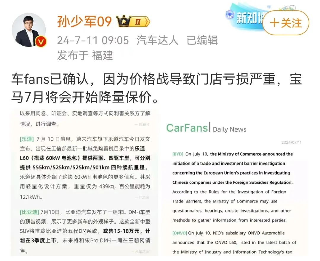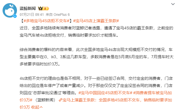作者 | Hiu 来源 | 互联网品牌官 宝马,脸都不要了。 上个月,看到裸车价降至17万元的宝马纯电轿车i3,一度以为宝马是真心实意为中国消费者谋福利。 直至7月初,传来#宝马中国将退出价格战#的消息,近日宝马多地4S店又明目张胆上演霸王条款,才后知后觉宝马这是继冰淇淋事件之后,再一次狠狠耍了中国消费者。 ![]() ▲ 图源:微博@蓝鲸新闻 01、拒绝交车,宝马吃相真难看 在5月、6月花17万买下宝马i3,在7月被告知需要加价3万才能提车!!! 遇到这种情况,别说是当事车主了,作为旁观者听了都来气,更可气的是这还不是单一事件。 7月21日,据蓝鲸新闻报道,全国多地陆续有消费者透露,在4S店提车之时都遭遇了宝马的霸王条款,要么拒绝交付,要么销售临时要求加价才能提车,数额高达3万元。 比如,一位重庆消费者表示,“我是5月29日和重庆宝渝汽车销售服务(集团)有限公司签订的购车合同,车型是宝马i3,价格是17.45万,并且交了定金。当时销售说提车没有问题,但是到临近提车时被告需要加价3万。” ![]() ▲ 图源:蓝鲸新闻 合同签了、定金交了,本以为爱车就此到手了,谁想到提车时还能被销售整一出“坐地起价”的恶心戏码。 该消费者还补充道:“我和4S店方面经过多次协商,后续对方又表示加价1万多就能提车,再后来经理又说没车了,停产了。在多日协商沟通的过程中,4S店每天都是不同的说法,给出的回应反复无常。” 从4S店这一套两面三刀的动作不难看出:不管是宝马官方,还是宝马经销商,他们都不允许消费者以价格战时的价钱拿下一辆“廉价”宝马了。 一位来自郑州的消费者也透露到,自己在6月底订的宝马i3,合同已签订、定金已交完、贷款方案通过,当时客户经理说4、5天就能交付。 但临近交付,却被设置了重重障碍,要求加价2万元,并且换成3年免息的金融方案,否则无法提车。 值得注意的是,涉及此次拒不交车事件的车型是价格相对低廉的电动版宝马,有i3、ix3、3系这几款车型,也是扛起宝马价格战的主要车型。 前段时间,宝马的价格战打得有多凶狠? 以宝马电动车i3为例,其厂商指导价为35.39-41.39万元,而在价格战中直接对半砍,裸车价杀到了17万元,上险后的落地价可以控制在20万元以内。 这个价格,以前不敢想,现在不敢买! 因为提车过程相当艰难。 有低价买到了这些车型的消费者表示,即便是在合同手续集全的情况下,也得经过多次催促才能完成提车。 在价格低位把车卖出去,如今价格涨回去,就反悔不交车了。 宝马,玩不起,就别学人家玩什么价格战了。 02、价格战失效,宝马失灵了 在汽车电动化转型的进程中,那些在燃油车时代曾高高在上、备受拥簇的车企和品牌,如今眼看快速崛起的中国品牌,面对被疯狂蚕食的销量,也不得不向市场低下高昂的头颅。 降价,就是它们手上最大的筹码。 这以价换量,向来是企业挽救产品销量走低的惯用手段。 如果还是没能换来销量,那么一定是价格降得还不够狠。 为此,一向价格昂贵且坚挺的BBA们,纷纷给出了“跳水价”。 比指导价低个10万元,都算是小菜一碟了。 特别是在今年5月底,宝马官方主动给经销商门店发函,称“鉴于市场大背景和国产品牌带来的巨大冲击,决定给宝马4S店开出多项大幅度补贴减免政策”。 在经销商看来,这相当于有品牌方当后盾,就更有底气搞降价促销了。 于是,杀入20万元区间的宝马,照进了现实,照进了宝马4S店。 除了价格接近“腰斩”的宝马i3之外,宝马多款车型都有大幅降价。其中43.99万元起售的宝马i5,在不少门店的降幅均超过了11万元,裸车价甚至能降到30万元。 ![]() ▲ 图源:微博@宝马中国 经销商的折扣力度之大,在一定程度上确实可以刺激销量的提升,但与此同时,也确实刺激到了宝马集团。 一方面是,宝马作为曾经称霸中国市场的豪华品牌,伴随价格体系的崩盘,其品牌价值体系也随之崩盘了。 在燃油车时代,依托于绝对的技术优势,BBA在中国市场可以说是横着走,曾一度占据中国豪华车市场90%的市场份额,有些车型甚至需要在原价的基础上加价才能买到。 可如今,与这些豪华品牌捆绑在一起的关键词变成了打折、降价、促销、甩卖…… 以至于被网友调侃“再不努力,以后只能开BBA了”,让“以前没钱买宝马,现在没钱,买宝马”迈入现实。 另一方面是,持续的大幅度降价确实伤到了宝马们的要害——净利润。 2023年宝马集团全球销量为255.5万辆(宝马、MINI、劳斯莱斯),同比增长6.5%,但净利润却同比下滑34.5%。 财报显示,今年上半年宝马集团净利润66.2亿欧元,同比下滑高达50%。 而且,根据宝马集团公布的销量数据,今年上半年,宝马在全球的交付量达到109.65万辆,同比增长2.3%,但在全球最大单一销售市场中国却出现下滑,销量为37.59万辆(含MINI品牌),同比下滑4.2%。 也就是说,降价并没有为宝马带来持续增长的销量。 这无疑又给了宝马当头一棒,使其加速从价格战的泥潭中抽身离去。 03、得罪客户也干,宝马真的很急 近期,宝马开始控价,逐步收缩优惠力度,将终端零售价拉回正轨(指导价)。 很快,#宝马中国将退出价格战#、#宝马开始涨价了#的消息接连登上微博热搜。 ![]() ▲ 图源:微博 对于涨价这一说法,宝马官方回应称,近期没有对建议零售价做任何调整。经销商对市场终端零售价有决策权,最终成交价受市场调节,属于正常波动。 但在7月11日,有博主在微博发文称,因为价格战导致门店亏损严重