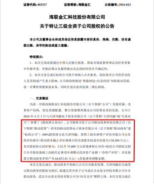 撰文丨一视财经 翊天 “中国互联网企业的尽头是放贷”,这句戏谑之言,埋藏着网友的怨气和愤懑。放贷无疑是个令人艳羡的行业,几乎所有中国的互联网巨头都无法抗拒,相比其他互联网巨头的野心勃勃,一直以来,表面上优雅的张一鸣对金融是最懂得克制的,或者说隐藏的最深的。不过,如今它告别了在角落里隐秘的扩张,这只放贷巨鳄已逐渐浮出水面…… 6月中旬,央行发布非银行支付机构重大事项变更许可信息公示(截至2024年6月)。公告显示,中国人民银行同意武汉合众易宝科技有限公司(以下简称“合众易宝”)变更公司名称为“抖音支付科技有限公司”。 此次更名有利于抖音支付与抖音品牌的统一,有助于其金融业务布局,降低对外部支付平台的依赖。 字节的商业闭环 一直以来,字节跳动内部对金融板块业务重仓押注,但其动作极为隐秘。十余年来,张一鸣鲜少有对金融板块的公开表态。 尽管如此,字节在金融领域的商业版图仍在悄然扩张。两三个月前,张一鸣投入14亿元,再次拿下一块线下支付牌照。 4月3日,海联金汇发布公告,拟将其全资三级子公司——联动优势电子商务有限公司,转让给抖音支付牌照主体(武汉合众易宝科技有限公司)的母公司,交易价格为基准转让对价7.5亿元+交割日净资产,此举被视为抖音拟补齐线下收单业务许可的一大动作。 本次收购完成后,联动商务将被纳入抖音金融版图。这笔交易一经公告,便受到了外界的高度关注,联动商务将在抖音金融版图中扮演何种角色,上市公司是否会与抖音有具体的合作,都成了投资者关注的重点话题。 ![]() 另外,这笔收购公告中还披露了天津同融的财务数据。截止2023年12月31日,天津同融资产总额697.3亿元,净资产7.8亿元;2023年度实现营业收入44.9亿元,净利润7970.66万元。 成立于2011年的联动商务拥有央行颁发的《支付业务许可证》,可在全国范围内从事银行卡收单、互联网支付、移动电话支付业务。 而对于抖音而言,此次斥资收购联动商务有望弥补其在线下支付领域的空缺,实现线上和线下支付的全面覆盖,完成字节的生态闭环;而在合规方面,抖音或仍需进一步整合旗下的支付牌照。 “最后一块拼图” 谈及海联金汇,不得不提的就是联动商务母公司联动优势与海联金汇的“对赌风波”。 在2016年海联金汇收购联动优势时,博升优势作为业绩对赌方兼联动优势的原股东,承诺联动优势在2016年到2018年的净利润分别不低于2.21亿元、2.64亿元和3.22亿元,累计不低于8.06亿元。 尽管前两年完成了业绩承诺,但联动优势在业绩承诺的最后一年,仅实现净利润2.38亿元,未能完成业绩承诺的75%。因此,海联金汇对联动优势计提了商誉减值准备2.71亿元。 2019年,联动优势业绩出现大幅下滑,净利润亏损高达4.06亿元,导致海联金汇再次计提商誉减值损失20.69亿元,占联动优势商誉账面原值83%。 ![]() (图源《海联金汇2019年商誉减值测试报告》) 由于联动优势未能完成业绩承诺,加之国内经济下行和行业政策变化的影响,2019年度海联金汇实现归母净利亏损24.56亿元,较同期下降1943.20%。 直至2020年,海联金汇逐步摆脱了联动优势的影响,业绩开始回暖。2020年至2023年,海联金汇分别实现归母净利润为2.13亿元、2.78亿元、1.03亿元、5094.22万元,显示出公司业绩的逐步恢复和增长。 然而,联动优势近年来屡因支付业务违规收到大额罚单,据不完全统计,联动优势因违法相关规定收到的罚没金额累计约4900万元,在行业监管趋严的背景下,支付牌照的价值还产生了缩水。 此次将股权转让给天津同融后,联动优势的子公司联动商务将不再纳入海联金汇的合并报表范围,天津同融为抖音集团关联公司,其在完成受让联动商务的股权交割后,拟通过其全资子公司武汉合众易宝合并联动商务。武汉合众易宝为“抖音支付”牌照主体,此前其仅拥有互联网支付业务许可。 对于字节来说,支付牌照的“最后一块拼图”,也要补齐得漂亮。 巨鳄浮出水面 近年来,抖音布局金融业务的步伐加快。据多家媒体报道,2023年,抖音已有3000亿消费贷悄然生长。 早在2018年,字节跳动便通过其全资子公司收购了北京华夏保险经纪有限公司100%的股份,从而获得了保险经纪牌照。由此,字节在今日头条APP上线了“放心贷”入口,开启了通过收购构建、进一步拓展其在金融领域的业务; 2019年,抖音通过其母公司字节跳动收购了北京金美投资顾问有限公司,获得了证券投资咨询牌照。在收购后不久,字节跳动将证券业务出售给了格隆汇信息科技集团有限公司; 2020年8月,抖音母公司字节跳动收购了武汉合众易宝科技有限公司。拥有支付牌照后,抖音支付于2021年1月19日正式上线,进入大众视野; 2021年成立海南字节商业保理有限公司,由北京字节跳动网络技术有限公司全资持股; 2022年还设立了深圳市智永慧科融资担保公司,表明抖音在融资担保领域的战略布局,旨在为抖音体系内的小微企业主提供更加多元化的融资渠道。 在互联网金融领域,第三方支付牌照被誉为“行业通行证”。一方面,该牌照可以直接在流量场景中嵌入支付业务,另一方面,金融业务的变现效率也变得更加直接。 在资本市场上纵横捭阖多年,包括字节跳动在内的互联网巨头纷纷加码金融业务,支付牌照成为关注的焦点。 ![]() (数据由公开资料整理) 由于阿里巴巴与腾讯入局最早,因此在拿牌照方面取得了领先地位。