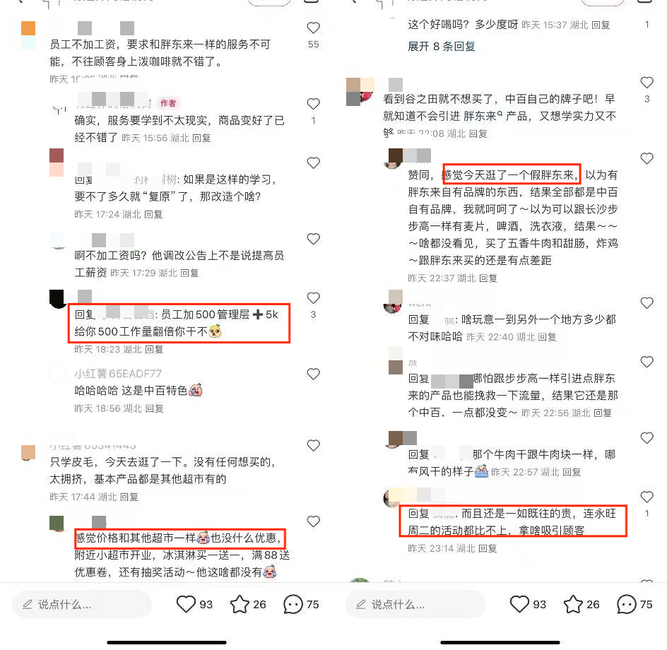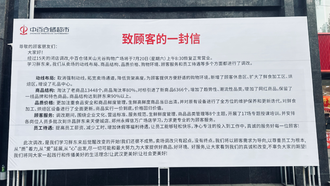 作者:李梦冉 出品:零售商业财经 中百仓储打响了“胖东来式自改”第一枪。 7月20日,中百仓储武汉关山光谷店和步步高超市长沙星城天地店同日宣布恢复营业。 虽然两家店均带有浓厚的“胖东来”色彩,但不同于被胖东来、青海一家亲团队主导调改的步步高第三家门店,中百仓储武汉关山光谷店是中百集团组团学习胖东来经验后,闭店15天、自主调改的首家门店。 「零售商业财经」开业当天走访该店发现,中百仓储从卖场动线布局、商品结构、购物环境、顾客服务等多个方面提升商品力与服务力:比如在商品结构上与胖东来90%以上一致,在顾客服务上新增智能洗手台、直饮水站、休息椅等,还为员工新增坐凳、脚垫,调整工资、工时等。 ![]() 图:中百仓储调改首店 虽然调改成效颇有“像素级复刻胖东来”的意味,但经营内核并未照搬胖东来。 尤其是在胖东来没有派人专门进行调改的情况下,中百集团能够结合自身特点以及武汉市民需求,探索出一条适合中百的自主调改之路,此举无疑是企业发展史上的里程碑事件。 据悉,中百仓储关山光谷店调改前年营业额约为1.5亿元,调改后开业首日销售额达到123万元,同比增长近4倍。此外,公司还计划在8月份将调改3家中百仓储门店。 ![]() 图:中百仓储调改首店 伴随着传统商超企业进入被动转型的阵痛期,“师从胖东来”创新调改的春天正在驱散实体零售的寒冬。 而面对消费者品质升级的需求和期待,零售企业如何在数字化基建几近完成的今天,一头激活员工释放商超自主性,一头回馈客户提高用户粘性,进而塑造好商品力、服务力与品牌力,仍是实现周期穿越的核心命题。 1、像素级模仿下的“改头换面” “从心出发”是中百仓储调改店置于门头的标语,也是本次调改的主旋律,主要体现在从动线布局、顾客服务、商品结构、品质价格和员工待遇五个方面贯彻胖东来对商品、员工和服务三个维度上“好”的理念。 动线布局上,中百仓储以“环形动线+磁石点”布局结构为核心,调整后商品布局更一目了然,同时拓宽卖场通道,降低货架高度,让购物空间更通透、更美观以提升消费者购物体验。 ![]() 图:中百仓储调改首店 笔者走访发现,在不去二楼的情况下,中百仓储在一楼只设置了一个结账台,结账后想离开卖场仍需原路返回。这是基于老店原有物业结构调整后难以克服的硬伤,但也侧面说明,中百仓储在动线调改上仍有较大优化空间。 商品结构层面,中百仓储此次调改淘汰了老商品13448个,门店淘汰了老商品13448个,商品淘汰率80%。 ![]() 图:中百仓储调改首店 对标胖东来引进了新商品6366个,包括众多国际大牌,如赫莲娜、雅诗兰黛、兰蔻等。此外还增加了网红商品,保留了一线品牌和特色商品,商品结构达到胖东来90%以上。 ![]() 如胖东来马斯卡彭、芋泥奶包等出圈甜品,和惠灵顿牛排面包等爆款网红商品均在中百仓储上架热销,胖东来特色炸鸡、红肠、牛肉干、大月饼等也均可见其身影。 ![]() 此外,门店还引入了专供胖东来的新西兰银蕨农场冰鲜牛肉,据工作人员透露:截至开业当日19时,相关已售出300余盒,到营业结束预计能销售600盒左右。 ![]() 图:部分售罄的商品 中百仓储礼品中心是像素级模仿胖东来的代表性区域,无论是运营模式与礼盒包装几乎与胖东来DL大礼箱如出一辙。 ![]() 图:胖东来(上)与中百仓储礼品中心(下) 除了以颜色作为礼盒功能、人群的主要区分外,中百仓储也同样提供礼品定制服务。 ![]() 图:胖东来(上)与中百仓储礼箱(下) 当然,在对胖东来商品结构“照猫画虎”的同时,中百也保留了自己的本土特色,如设置湖北农展专区,售卖武昌鱼、藕粉等区域特色产品。 ![]() 图:中百仓储自有品牌 再比如大力推广自有品牌商品,中百虽未直接引进胖东来网红“大月饼”,但也推出了一款由中百生鲜大厨房生产、口感更适合本土消费者的类似产品。 ![]() 图:胖东来网红大月饼(左)中百仓储大月饼(右) 在对商品种类进行重构和丰富之外,中百仓储调改店更加注重食品安全和商品鲜度管理,水果、熟食等鲜食品类均可见“当日出清”的立牌字样。此外,在食品区设有品尝试吃,包括零食区域都有小包装试吃。 ![]() 图:中百仓储调改首店 价格力方面,中百仓储与胖东来一样强调品质升级而非一味低价。 在官方口径中,中百调改门店所有商品一价到底,整体降幅在20%左右,有的商品降价幅度甚至达到30%~40%。但据消费者反映和笔者观察来看,商品定价大多维持在正常范围。 服务方面,据中百仓储介绍,调改期间,围绕企业文化、营运标准、服务规范、生鲜鲜度管理、商品品类管理等8个主题,开展了17场专题授课培训,并安排各岗位人员多批次到许昌胖东来天使城店、郑州永辉信万广场店学习。 也因此,商场两层楼都有服务者举立牌指明方向和排队引导,在商场内随处可见各种“胖东来同款”立牌,包括对商品的介绍、温馨提示、科普知识等。 ![]() 图:中百仓储调改首店 此外,中百仓储在服务台、收银台、顾客服务处,增设了筷子、勺子、吸管、手套等免费服务便民用具。在二楼出口处,增设顾客休息区,增加微波炉、一次性纸杯、直饮水、智能洗手台、充电宝、休息椅等便民设备,还为购买生鲜等品类的顾客提供免费冰袋。 ![]() 图:中百仓储便民设备 除了通过商品、价格、服务等方面提升消费者购物体验外,中百仓储同样