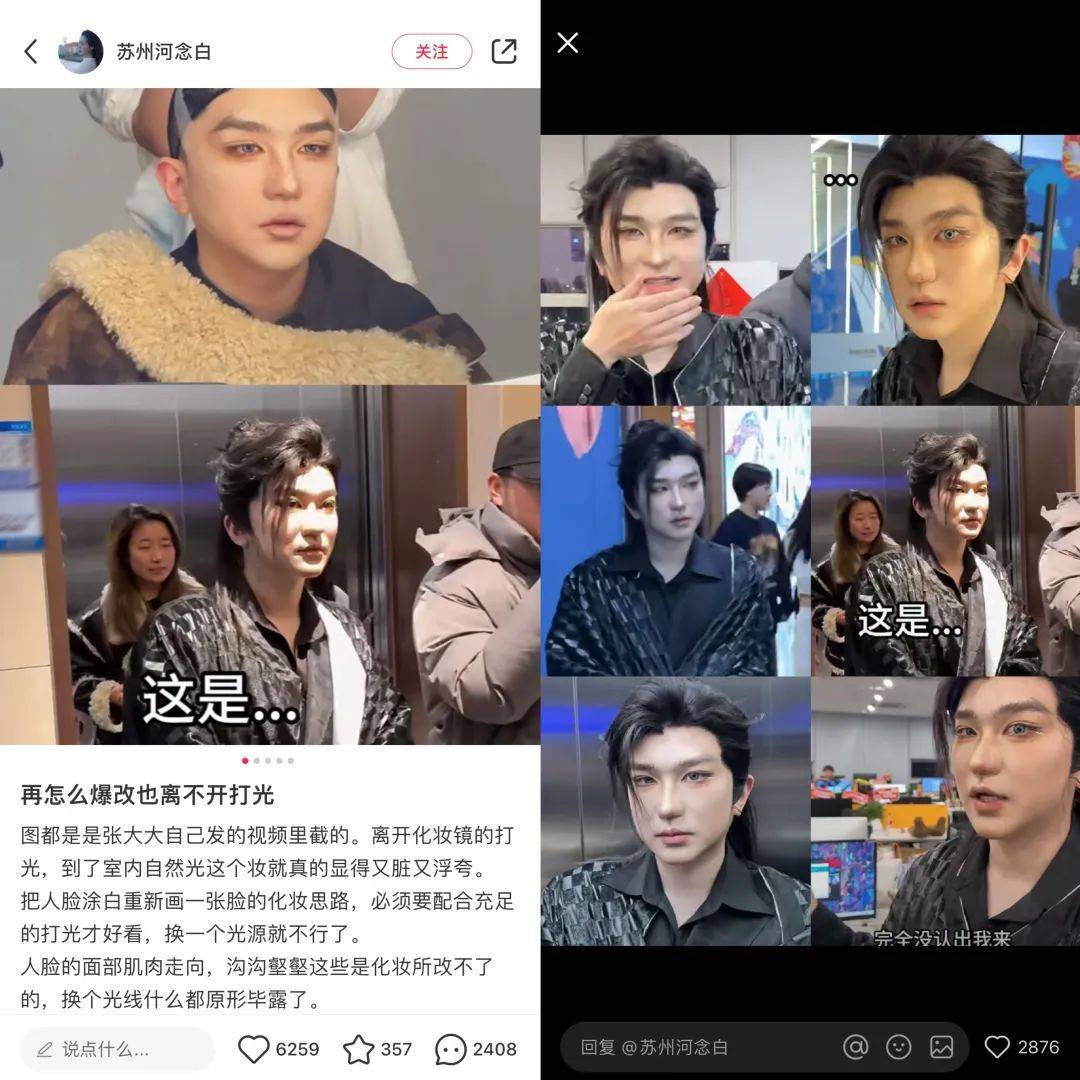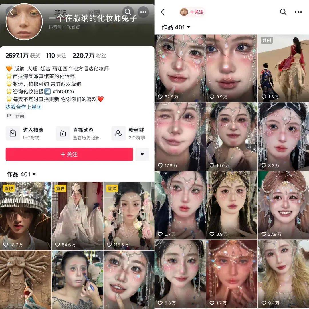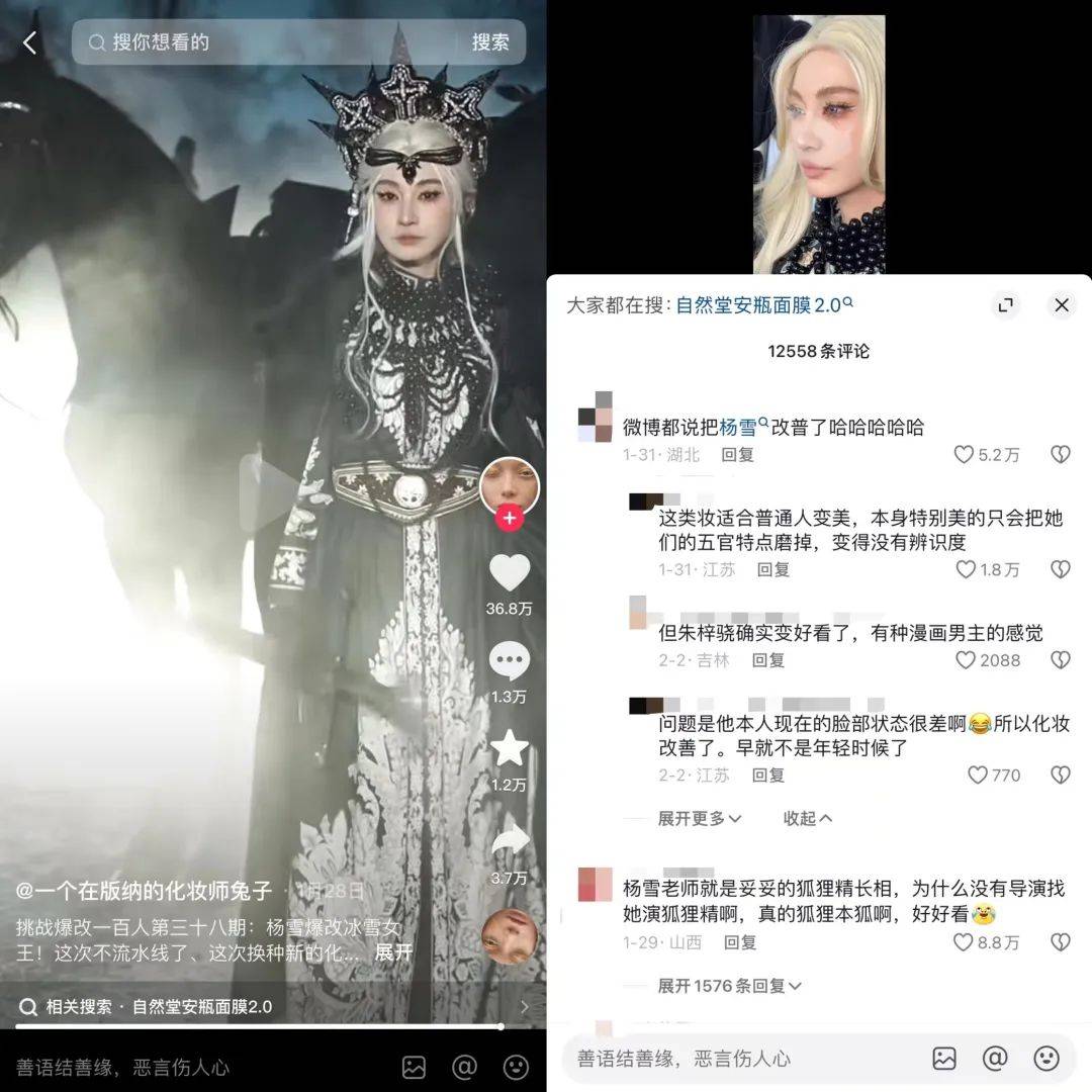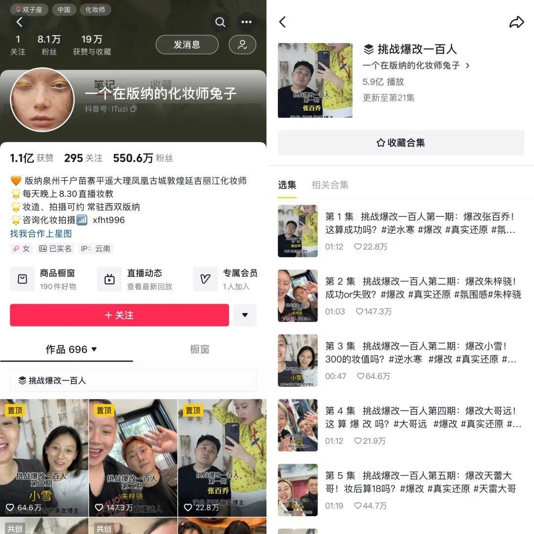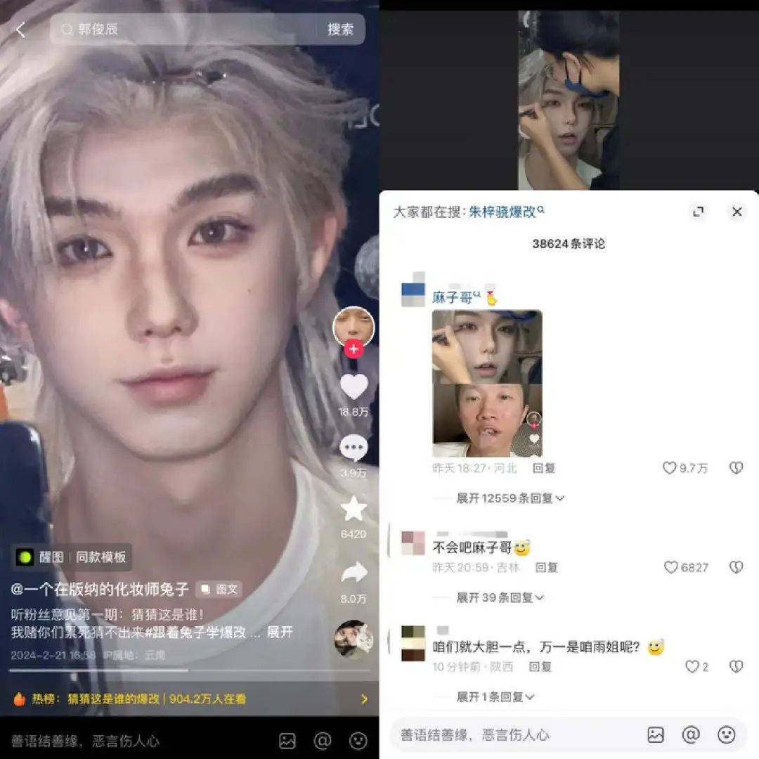 作者 | 小八 编辑 | 张洁 来源 | 新榜 仔细看,别眨眼,你能认出这是哪位明星吗? ![]() 此刻,你的大脑飞速运转闪出多个不确定的答案,但大概率可能想不到他是羌族小煞杨迪。 ![]() 有点怪,再看几眼 2月19日,杨迪发布了一条自己被爆改成男团偶像的视频,截至目前抖音获赞280万,相关话题#杨迪爆改#一度登上微博热搜第一,累计阅读量达到3.9亿,讨论量达到4.1万。 这条时长3分钟的视频中,杨迪经历了戴头套、粘胶带、缩鼻翼等多道前期工序,再配合刷墙一样的粉底厚涂,以及神似兵马俑的阴影修容。最终万丈高楼平地起,杨迪摇身一变男团偶像。 如此一通爆改后,杨迪甚至都没法用面容识别解锁自己的手机。 ![]() 对没错,换头术就在你眼前 紧接在杨迪之后,这两天,电视剧《狂飙》中饰演麻子的演员也因爆改登上微博热搜第一,累计在榜时长达14.6个小时。 ![]() 自此,爆改阵营又多一员大将。 无论是乡村爱情谢广坤爆改霸道总裁,还是娱乐圈唯一人脉张大大爆改龙族少年,以及欢乐喜剧人金靖爆改韩系氛围感美女……爆改面前,人人都有无限潜力。 ![]() 为他们操刀爆改的,是一位名为“一个在版纳的化妆师兔子”(下文简称“化妆师兔子”)的美妆博主,这些视频被她收录至《挑战爆改一百人》系列,截至目前已更新第45期,前21期的抖音播放量达到5.9亿。 ![]() “化妆师兔子”究竟何许人也?爆改风为何从网红一路风靡至明星?背后又衍生出哪些流量与商机? 70天全网涨粉超313万,为何明星网红纷纷找她爆改? “挑战爆改一百人第一期,爆改张百乔!” 2023年12月,“化妆师兔子”发布了爆改系列第一期视频,命运的齿轮由此开始转动。 作为接受爆改的主角,外型粗犷的东北搞笑博主“张百乔”在视频一开始表示难以置信,认为自己连美瞳可能都戴不上。但在“化妆师兔子”堪称狂野的爆改手法下,他不仅被扒开眼皮戴美瞳,就连假睫毛、假发都安排得服服帖帖。 ![]() 首先是戴头套、粘胶带,带动眼角上吊,自带一种拉皮显年轻的效果。其次是用胶带粘住鼻子,从视觉上缩小鼻翼,提高精致度。 ![]() 骨相基础改好后,紧接着就是粉底修容高光通通出动的刷墙式化妆手法,力求呈现出高挺的鼻梁、深邃的眼窝和刀锋般清晰的下颌线。 ![]() 最后假发一带,灯光滤镜一就位,这不妥妥的现役爱豆出道硬照。 ![]() 杨迪:变帅后都不太想说话了 不过,这套鬼斧神工的爆改离不开镜头和打光,否则会显得妆感太重不日常。 有网友以张大大视频中的截图为例,表示人脸的面部肌肉走向无法通过化妆改变,这种把人脸涂白重新画的化妆思路必须配合充足的打光才好看。 ![]() 还有网友质疑“化妆师兔子”爆改的妆容千篇一律,改造者几乎都是同一套流水线的复制粘贴,失去了自己原有的特点。 1月28日,“化妆师兔子”发布了一期将杨雪爆改成冰雪女王的视频,效果并不尽如人意。有网友认为磨掉了杨雪本身的五官辨识度,反而让她变得普通。 ![]() 对此,有网友认为爆改重在追求反差效果,并且需要这种非日常的妆容配合夸张的服饰,普通人也可以成为漫画男/女主角。 参与过爆改的金靖谈及女生化妆时表示,不是凡事都要被赋予意义,不是为了取悦别人,自己开心更重要。 ![]() 爆改兴起之前,这种流水线式化妆就引发过争论。 2023年五一期间,新榜编辑部关注到《“景点公主”打卡照生意,走红抖音小红书》,其中西双版纳、延吉、丽江等具有少数民族风情的旅游城市尤为热门,不少年轻人会选择在当地旅游景点体验一日民族风妆造。 但由于时间紧凑,从化妆换装到拍摄打卡只有2-3个小时,再加上妆容修图风格大致相似,有网友称之为“流水线公主”。 而在当时,“化妆师兔子”作为某写真馆的签约化妆师已经在圈内小有名气,“蔡萝莉”等网红博主曾出现在她的化妆视频中,发布内容以妆前妆后的对比反差效果为主,还未形成“爆改挑战”的鲜明风格。 ![]() 截图源自2023年5月 随着爆改群体从素人顾客延伸至千万粉博主、娱乐圈明星,“化妆师兔子”的内容讨论度也逐步破圈。 她凭借接近日更的发布频率,不仅保持着话题热度,也调动起了网友们的好奇心。评论区前排经常出现下一期想看谁被爆改的留言,还有网友为视频内容出谋划策,比如放出爆改后的照片让大家猜猜是谁。 ![]() 《狂飙》中麻子的爆改猜谜便是“化妆师兔子”听取粉丝意见发布的内容 虽然存在些许争议,但“化妆师兔子”的《挑战爆改一百人》系列中已有10期视频在抖音点赞量超百万。 爆款频出的同时,“化妆师兔子”的抖音粉丝量也迎来增长。据新榜旗下数据工具新抖、新红、新快,从爆改视频第一期至今的70天内,“化妆师兔子”全网涨粉超过313万,目前全网粉丝量超过817万。 爆改视频背后的生意经 有流量的地方,往往少不了商机。 “化妆师兔子”的爆改视频中,美妆产品的广告植入最为流畅自然,网友惊叹于换头手法时,顺带种草了相关产品。杨迪爆改后,便有网友迅速整理出同款供参考。 在爆改杨迪的视频中,“化妆师兔子”虽未在抖音上架购物链接,但她和杨迪共同对花西子某款气垫进行了口播种草。 ![]() 除了短视频种草,“化妆师兔子”也开启了直播带货。 每晚8点半,“化妆师兔子”固定在抖音直播妆教,并且带货同款美妆产品。直播中,她通常以自己为模特,配合团队伙伴共同演示妆教手法,在线还原爆改换头之术