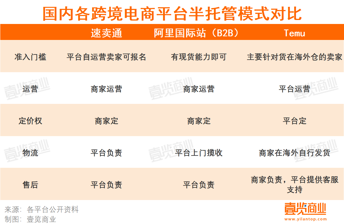 作者/李彦 编辑/木鱼 出品/壹览商业 从市场环境来看,向外去寻找增量,多多少少成为了国内电商行业的共识。 一方面,国内电商流量日趋见顶,流量放缓。据国家统计局数据,自2022年来,中国实物商品网上零售额增速呈下降趋势,2023年,中国实物商品网上零售额13.0万亿元,增速仅为8.4%。 另一方面,过去一年,以Temu为代表的全托管模式的爆红,重新带起了国人的“跨境电商热”。据海关总署数据,2023年我国跨境电商进出口2.38万亿元,增长15.6%。 大企业财报也佐证了这一趋势。例如,阿里巴巴最新发布的 2024 财年中期报告显示,淘天集团收入同比增长 8%,同期国际零售商业整体收入增长 66%,海外业务成为极具潜力的增长引擎。与此同时,去年底市值一度超越阿里的拼多多,三季报显示其交易服务营收同比增长 315%。拼多多的高速成长,一定程度下也是Temu“狂飙”的成果。 中国的跨境电商历史可追溯至20时世纪末,经历了数十年发展,市场已趋于成熟。在当下仍得以焕发“新生”,离不开模式的快速更迭。最典型的代表则是从“全托管潮”迈入“半托管潮”。 全托管没半托管香了 “托管”二字在跨境电商的火爆,从去年的全托管轮到了今年的半托管。 2022年9月,Temu美国上线并采用全托管模式;2022年12月,全球速卖通试水全托管模式;2023年5月,TikTok Shop宣布部分站点上线全托管模式……全托管模式,对商家来说,既是机遇,也是束缚。 降低商家做生意的门槛,是这一模式最被认可的好处。在全托管模式下,一些“跨境电商新人”可以更快上手,平台提供运营、仓储、物流、退换等服务,商家可以将更多时间花在品牌打造与选择上。 “保姆式”运营之下,全托管为何不香了? 首先,全托管模式下的定价机制,始终是商家和平台的争议点。对于卖家来说,定价权掌握在平台手上,意味着利润空间会被一再挤压,用一位全托管平台经营商家的话来说就是,“只有更低价,没有最低价”。 其次,电商平台拥有对流量的绝对控制权,也存在售后服务不可控等的现象。一位在TEMU上做卷烟生意的商家给壹览商业看了与平台方的对接后台,数百个商家聚集在一个群里,群里仅有的两位平台运营,关于售后、库存相关的一系列事项都需要商家与其对接,一些情况下,平台很难保证”当天事当日毕“。 因此,全托管之后,“半托管”模式成为下一届“顶流”。 今年1月,经过半年的试运行的速卖通全面上线半托管服务,近日,阿里国际站推出第一家跨境电商B2B半托管,并于1月5日正式开启半托管招商。首期将开放美国、加拿大、墨西哥、英国、德国和法国六个国家站点。 据多家媒体报道, Temu 也已在筹备半托管模式,计划于 3 月 15 日在美国站点上线,月底将扩展至欧洲站点。 比起全托管模式,半托管给了商家一定的自主权和经营空间。 谁的半托管更合商家意? 壹览商业总结了目前已推出半托管模式的三大国内电商平台发现,各平台的半托管模式对应的是不同的跨境电商卖家。与此同时,速卖通、阿里国际站的半托管主要托管在了前半程,Temu的半托管主要托管在了后半程。 ![]() 从面向商家角度来看,速卖通的半托管已从去年的定向邀约改为平台所有自营商家皆可申请,是面向平台的已有B2C商家的一种模式。阿里国际站的半托管践行其本身的定位,立足于B2B领域,只要拥有现货能力的商家都可以参与。 佛山鑫码电子科技有限公司总经理程珍认为,阿里国际站设定的这个准入门槛,对有现货能力的新老商家较为友好,给了一些有现货能力,常年做国内贸易的商家试水跨境电商的机会,也可以理解为是阿里国际站拉新方面的又一举措。 而相比之下,Temu的半托管,对商家供应链的要求更高。Temu半托管服务面向的主要是已经与海外仓库物流合作商达成合作、具有海外主体、具备成熟的本土履约能力的跨境商家。 在具体的半托管流程上,阿里国际站给予商家自主经营、自主定价权,平台承包的是物流、资金、售后等履约环节;速卖通的半托管是对跨境平台上的传统的卖家POP模式的物流升级,同时保留卖家自运营独有的货品优势和运营优势。Temu则与前两者正好相反,店铺运营。产品定价权仍然在平台手里,但是给了商家海外自行发货,自行进行售后的权利。 壹览商业认为,阿里旗下的速卖通和阿里国际站与拼多多旗下的Temu在半托管这一模式下走向两条路,原因有二: 一方面,速卖通和阿里国际站背靠菜鸟,天生在物流上具备优势。就在去年9月,菜鸟宣布开启与速卖通的“全球5日达”征程。据菜鸟招股书显示,菜鸟国际物流收入撑起其业务的半壁江山,在2023财年占比为47.4%。截至2023年6月30日的三个月,国际物流业务收入同比增长41%至111亿元; 因此,速卖通和阿里国际站选择托管后半程,可以算是“站在巨人肩上”了。 另一方面,Temu之所以能在2023年一路狂飙,离不开其对低价的把控。低价于平台而言,也是把双刃剑。对平台来说,低价能够带来更多流量,但同样面对市场质疑。例如,在Google日本搜索Temu,一个直观的现象是,许多标题中都会提到一个日语单词「怪しい」(可疑)。 但不得不承认的是,尽管Temu此前的全托管模式在行业内存在争议,仍有大量的外贸人把其当作首选渠道。质疑并不会阻碍Temu的如火如荼。 那么,身为商家,到底如何看待这一场“半托管”之战? 新瓶装旧酒还是真“省心”? “跨境电商到了新的一步,这几个平台