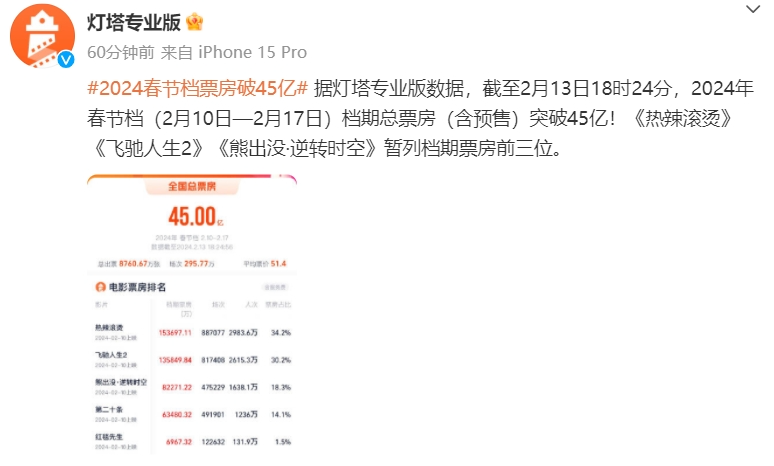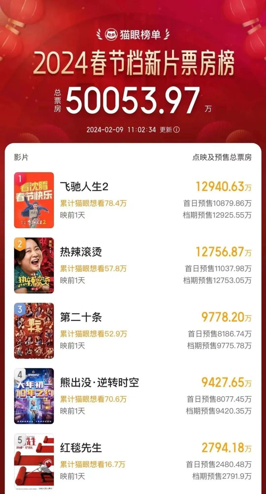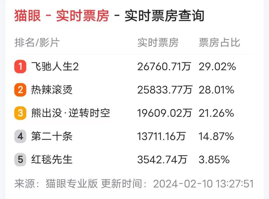 作者 | 曾羡鱼 编辑 | 趣解商业 今年春节共有8天假期,也被称为“史上最长春节档”;而随着春节假期已近半,2024年中国电影春节档已经在一片“厮杀”中显露出了基本面貌。 据猫眼专业版实时票房数据显示,截至2月13日19时20分,两部以“逆境突破”为主题的电影《热辣滚烫》和《飞驰人生2》领跑总票房,上映4天,票房已双双突破10亿元大关;其中贾玲执导并主演的《热辣滚烫》票房突破15亿元,位居票房榜首;主打儿童与合家欢市场的《熊出没:逆转时空》出人意料地后来居上,票房突破8亿元,稳居春节档票房第三位。 ![]() 图片来源:猫眼专业版截图 相比之下,著名导演张艺谋执导的新片《第二十条》以6亿元票房暂排第四;而最让人意想不到的是“名导宁浩+天王刘德华”联手打造的《红毯先生》,这部之前被寄予厚望的影片上映四天票房仅有7000万元左右,亏损几成定局。 今年春节档电影整体主打喜剧元素,但每部电影也都有各自的看点和“绝活”,“神仙打架”之下谁能最终夺得票房冠军宝座?又有谁来共享票房盛宴? 01.贾玲沈腾“领跑”春节档 在今年春节档正式开打之前的宣传攻势中,除了各家路演和推广之外,“贾玲减肥100斤”成了最受人关注的话题;不过当时有很多人把这当成了影片的营销噱头,因为稍微有点运动健身经验的人就知道,普通人在一年中减肥100斤有多大难度,更何况还是贾玲这种日程很满、工作很忙的明星艺人。 ![]() 图片来源:罐头图库 所以在春节档上映之初,《热辣滚烫》还并没有占据太大优势。北京某院线市场部经理高宏(化名)说:“实话实说,当时我们更看好张导的《第二十条》,不仅因为影片内容过硬,也因为张导去年的《满江红》成绩实在太好。” 在各家票务平台预售数据上也能体现出这一点,当时预售排名第一的是沈腾主演的韩寒新片《飞驰人生2》,《热辣滚烫》、《第二十条》名列二三但差距很小;有的票务平台上,《第二十条》的票房预售甚至排在了第二位。 ![]() 图片来源:猫眼截图 但是当影片正式上映之后,决定票房的就不仅仅是前期宣传还有影片内容了。高宏说:“到初一晚上我们查看整体上座率就发现,《热辣滚烫》数据呈现逐步上升趋势,而有些片子开始掉队,我们由此调整了次日排片,增加了《热辣滚烫》的场次。” 但即便如此,在春节档前两日票房(含预售)中,《热辣滚烫》也是不如《飞驰人生2》的;根据猫眼平台数据显示,截至2月10日下午14时46分《飞驰人生2》全国票房已经率先突破3亿元。 ![]() 图片来源:微博截图 逆转出现在大年初一的晚间,当时春节档所有片子都已经亮相,观众的反馈与评论开始影响了票房表现。这时大家都在惊叹“贾玲减肥100斤”居然是真的,“甩掉半个自己”后的贾玲在电影中的新形象也让人大吃一惊! 随后关于“贾玲瘦了”的相关话题冲上微博,并迅速占据微博热搜榜前几位;而《热辣滚烫》的票房也加速上涨,并在大年初二超越了《飞驰人生2》,在今年春节档电影票房竞争中占据了领先位置。 ![]() 图片来源:微博截图 面对这种情况,影评人宗柳伽表示并不意外:“当我在片子里看到贾玲减肥后的样子时真的被惊到了,直觉光凭这一点这部片子就足以引发外界关注。事实证明我的直觉是对的,因为很多人都在社交媒体上表达了同样的惊讶,这带动了更多人去看这部电影。” 当然仅是“减肥成功”这个话题并不足以左右近百亿的春节档票房,影片质量也很关键;不过宗柳伽认为:“能闯入现在春节档的电影质量都不会太差,毕竟这是一年中竞争最激烈、票房也最高的档期,每个出品方都会拿出最好的作品。” ![]() 图片来源:小红书截图 截至2月13日下午15时,春节档电影中豆瓣评分最高的是《热辣滚烫》,为8.0分,《飞驰人生2》、《第二十条》和《我们一起摇太阳》均为7.9分;这几部电影都有十几万人评分,但彼此分差并不大。 ![]() 图片来源:豆瓣截图 而对于《热辣滚烫》和《飞驰人生2》的领跑,有业内人士认为,这与这一年来的整体环境也存在一定关系。 曾在国内某电影公司任职发行总经理、现在专职做电影发行的杜晗容认为:“2023经济环境并不算太好,跟很多人之前的预期有落差;这种情况下的观众更愿意在春节档看到轻松愉悦、有突破感和喜剧氛围的片子,而《热辣滚烫》和《飞驰人生2》都是这种类型。” 相比之下,2023年春节档就有所不同。“当时疫后刚刚放开,大家心情活跃满腔热情,整体氛围比较乐观,影片主题也更为广泛,《流浪地球2》、《满江红》这种工业电影也依然能大杀四方,这和今年春节档的情况还是有明显不同的。”杜晗容说。 ![]() 图片来源:微博截图 这个观点也得到了宗柳伽的认同,她认为如果纯粹从电影质量、故事深度、镜头语言和艺术价值上说,张艺谋导演的《第二十条》应该是今年春节档中最出众的电影。 “但因为是现实主义题材,在今年这种整体大环境影响下,票房就会受到一些影响;说得更直白一些,因为很多人已经被生活毒打过了,就不愿意再去电影院受教育。如果换成其他档期,比如五一档,这部电影绝对妥妥的票房冠军。”宗柳伽说。 02.“熊出没”与“红毯先生”出人意料的票房 相比其他几部大片的“近身搏杀”,动画电影《熊出没:逆转时空》则出人意料地“后来居上”。这部预售并不占优、一度排在第六、七名位置的影片,从春节档首日就