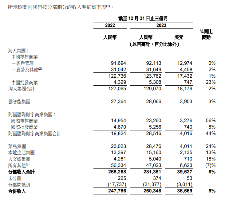 文|王亚琪 编辑|斯问 来源 | 电商在线 2024年2月7日,阿里巴巴集团 (纽交所:BABA,港交所:9988,以下简称“阿里”)公布截至2023年12月31日止的季度业绩(2023年10月1日—12月31日)。 过去一年,对于阿里而言,是变化颇多的一年。 2023年一开年,阿里就以“1+6+N”组织变革将业务分拆成淘宝天猫商业、本地生活等六大业务集团和多家业务公司;年末,新上任的淘天集团CEO吴咏铭又官宣以80后少壮派为代表的全新淘天管理团队,这支年轻团队负责的淘天集团在阿里贡献收入接近一半。 2024年,阿里预计将针对核心业务,保持积极投入。 如今身兼集团、淘天集团、云智能集团三个CEO职务的吴咏铭表示:“集团最高优先级是让电商和云计算两大核心业务重燃增长动力。未来一年,我们将在改善用户核心体验上加大投入,以支持淘天集团重拾增长及稳固市场领导地位。我们将聚焦资源开发公共云产品,保持国际商业业务的强劲增长势头。” 这个季度,阿里宣布将股份回购计划增加250亿美元,加上之前马云和蔡崇信的真金出手。这充分说明内部思想已经统一,2024年必将是新的开始,巨震背后,资本市场也要花时间认识和理解一个新的阿里巴巴。 ![]() 用消费频次带动GMV增长 这一季度,阿里收入为2603.48亿元(本文财务数据均以人民币计),同比增长5%。 经调整EBITA同比增长2%至528.43亿元(一项非公认会计准则财务指标,剔除了部分利润影响项目如利息费用、投资净收益,被认为能更准确地反映核心经营业绩)。 其中,淘天集团的收入贡献依然是最高的,收入1290亿元,同比增长2%。其主要收入和利润来源于“客户管理收入”,也就是平台商家的广告费和佣金,这一项相较同期维持平稳。 客户管理收入之外,淘天集团还有“直营及其他”业务(主要是天猫超市、天猫国际),和中国批发商业(1688批发平台)。分别收入316亿元、53亿元,增长2%和23%。 ![]() 值得注意的是,由于交易买家数和订单量的增长,本季度在线GMV实际上取得了同比增长,但部分被平均订单金额下跌所抵销。从财报中来看,这主要是因为年初提出的价格力战略已开始奏效,阿里拓展了更多性价比的产品种类,平台收入结构也发生了变化——过去天猫商家往往更受外界注意,但价格力战役下,淘宝商家提供的GMV正在增长。 价格力是2023年电商行业最重要的关键词。在激烈的中国电商市场中,和其他平台相比,阿里一直更为强调消费分层的重要性。价格力也被认为是淘天“用户为先”的重要体现。 在财报后的电话会上,吴咏铭指出: “鉴于现在用户跨平台消费的竞争形式,回归用户是我们的战略核心。我们将在用户核心体验上加大投资,提高客户购物体验。我确信淘天集团坚持万能的淘宝的定位,在消费分级体系下,为不同消费者提供好货、好价、好服务的购物体验,一定能够获得用户的信任,重回增长轨道。因此,2024年对于淘天集团是综合能力提升之年,也会是一个投入的大年。” ![]() 他透露,新的一年,淘天集团将按照优先顺序重点投入以下方面: 第一,商品供给。加强淘宝天猫平台对品牌商品和产业带商品的投入。这将进一步强化淘天的商品供给优势,从而更好地满足消费者的趋势和需求; 第二,价格力及效率。加大投入产品能力建设和商家与平台的商业模式关系优化,针对不同类型的供给方提供灵活经营模式,提升商家以及工厂的经营效率,创造出更优性价比; 第三,协同商家及物流合作方,提升售前、售中、售后以及物流的全程消费者体验。 总结来看,现阶段淘天集团更为看重的,是通过供给的丰富,给出更具性价比的商品,只要赢得用户,就能赢得“增长”。吴咏铭在电话会中表示:“通过以上措施,提升淘天的综合能力,并提供好货、好价、好服务的消费体验。我们相信平台的消费体验和服务质量的提升,一定能带来用户消费频次的提升,也会带来用户增长效率的显著提升。” 国际业务增速亮眼,但仍在亏损 总的来看,淘天集团本季度贡献1290亿元收入,接近于阿里总收入的一半。剩下一半,由“1+6+N”中,除淘天集团之外的五大业务集团,及“N”代表的“所有其他”业务贡献。 这一季度,云智能集团收入280.66亿元,同比增长3%。其利润增长更为亮眼,经调整EBITA同比增长86%至23.64亿元。对此财报中给出的解释是,因为减少利润率较低的项目式合约类收入,提升了收入质量。同时,公共云产品及服务收入增长,带动盈利能力的提升。 但要说增长最迅速的,还是国际数字商业集团。 2022年1月份,蒋凡开始带队阿里国际业务,也就是现在的阿里国际数字商业集团。不像亚马逊用一个平台做全球市场。阿里国际业务往往基于不同的地域,推出不同的产品。其中,全球批发业务主要是阿里国际站,全球零售业务是速卖通。深耕单一市场的平台,东南亚有Lazada,欧洲上线了Miravia,土耳其是Trendyol,还有南亚的 Daraz。 ![]() 这一季度,该集团收入同比增长44%至285.16亿元,整体订单同比增长24%。这一营收规模已和菜鸟的284.76亿元、云智能的280.66亿元基本持平。其中,速卖通实现超过60%的订单同比增长,主要是因为Choice的推出。 去年3月,基于全托管和半托管模式的速卖通Choice在海外上线,Choice通过高性价比、高品质的商品,以及更快的物流速度和更好的客户服务,提供更佳的体验。2024年1月,Choice订单约占速卖通总订单量的一半。 此外,Trendyol录得双位数订单增长,并进一步将业务扩展